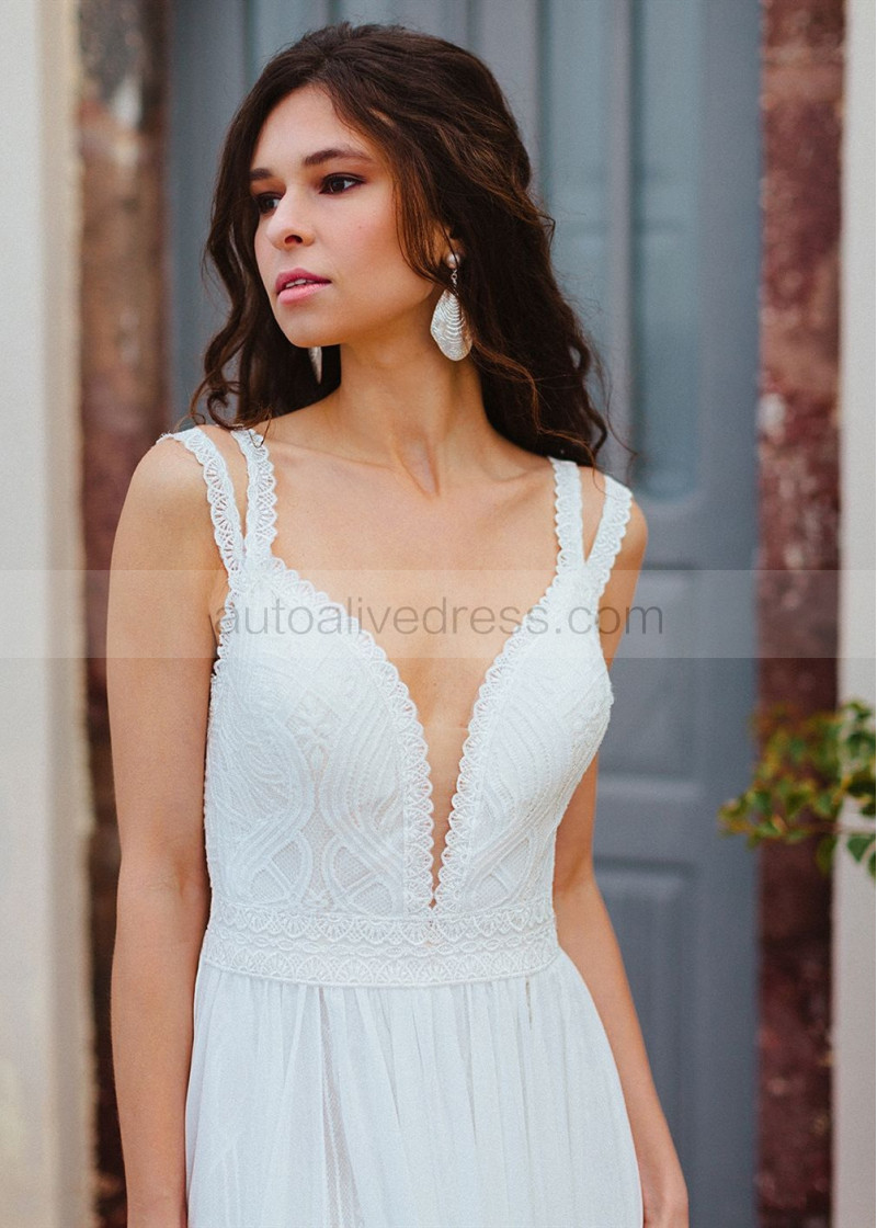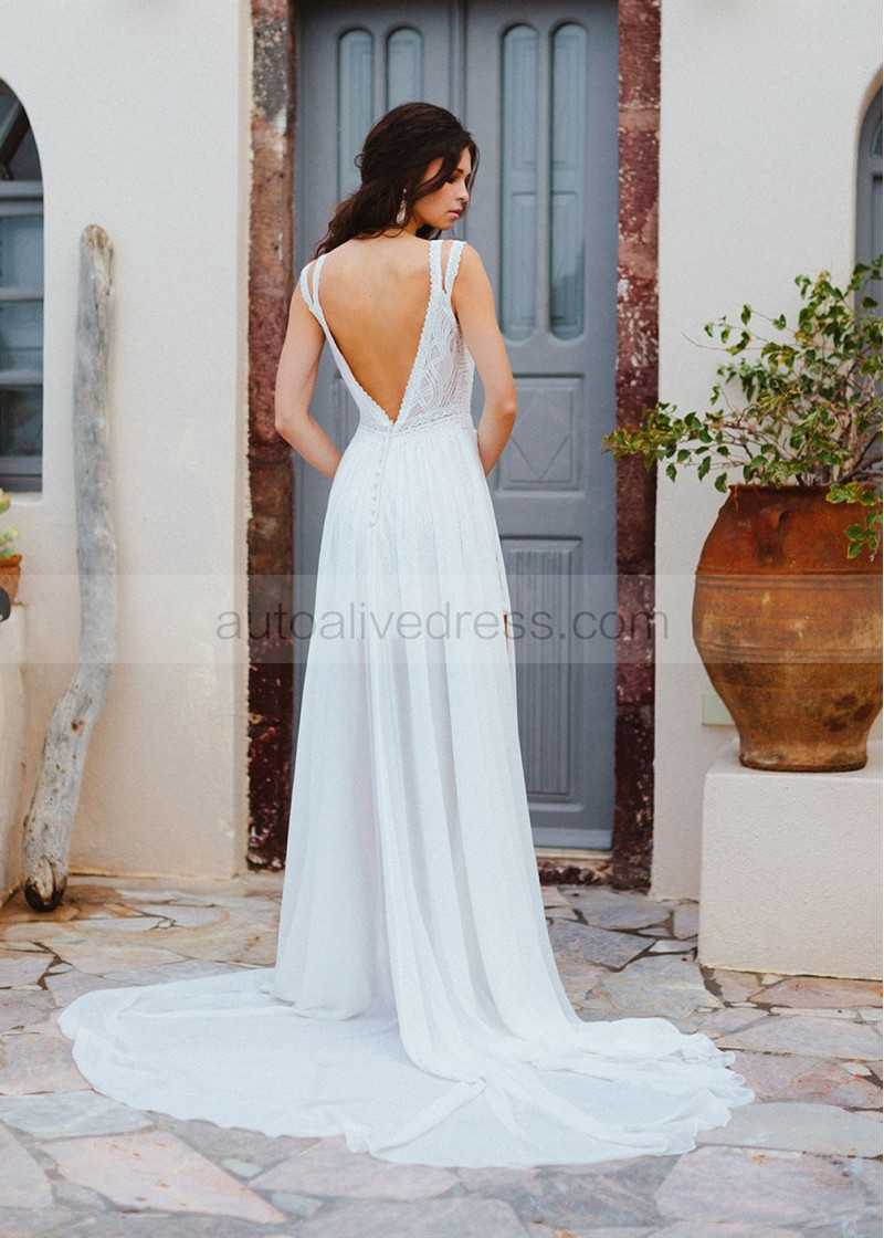 Ivory Lace Chiffon Slit V Back Wedding Dress