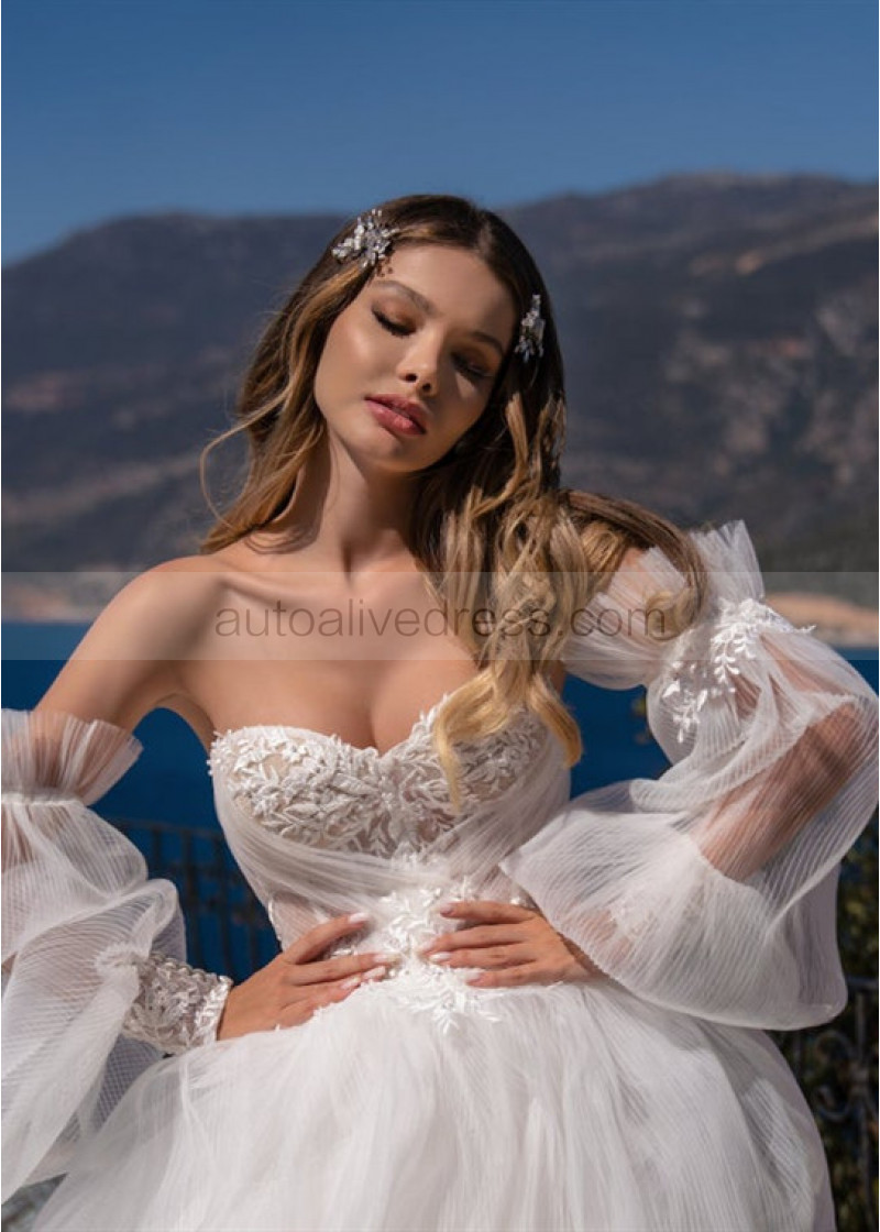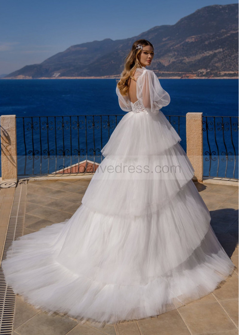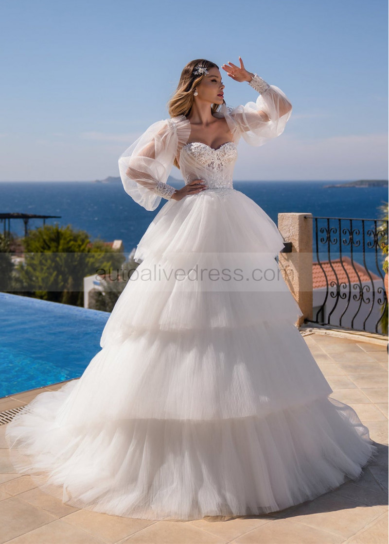 Ivory Lace Pleated Tulle Tiered Wedding Dress