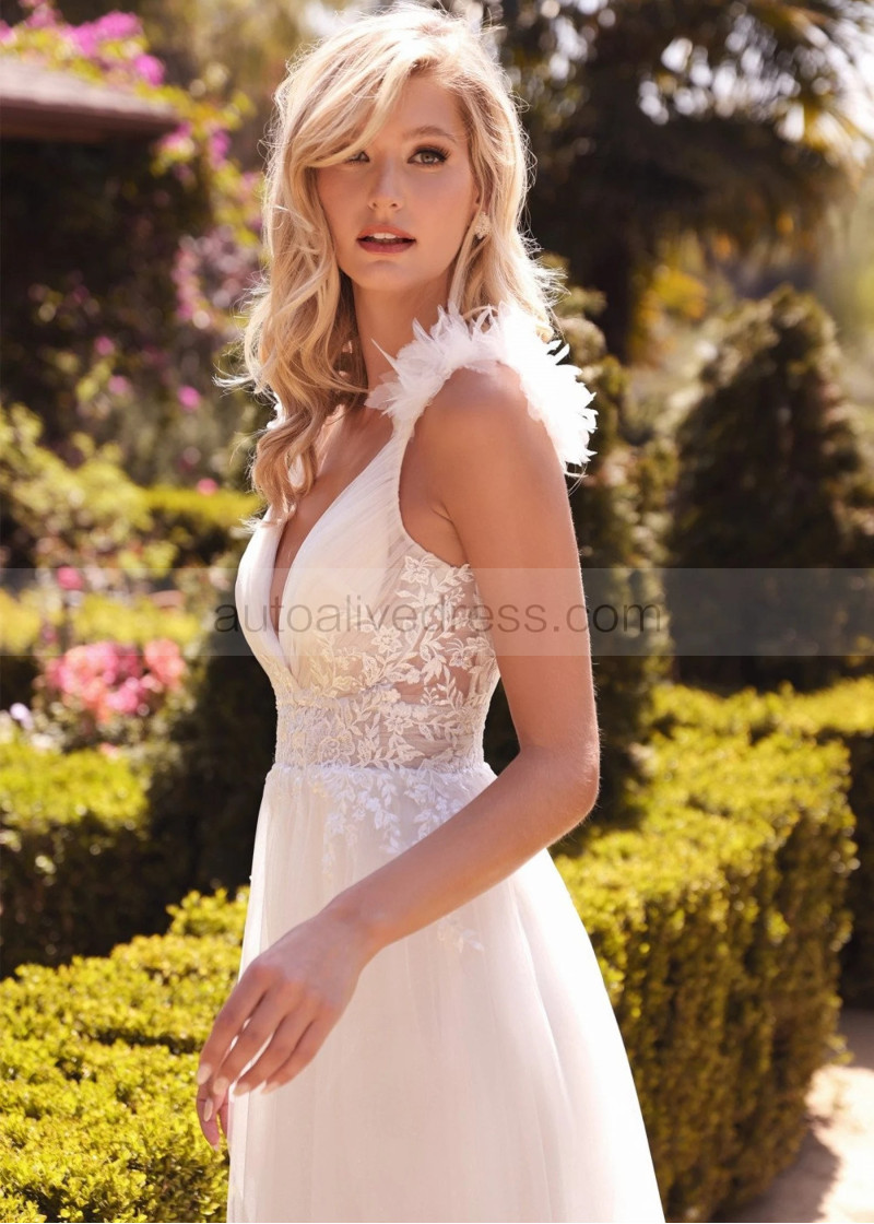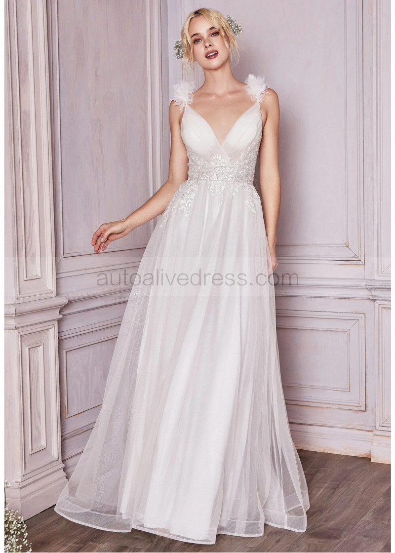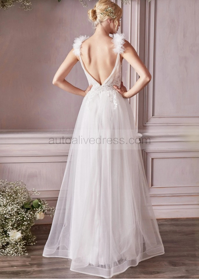 Ivory Lace Tulle Deep V Back Chic Wedding Dress