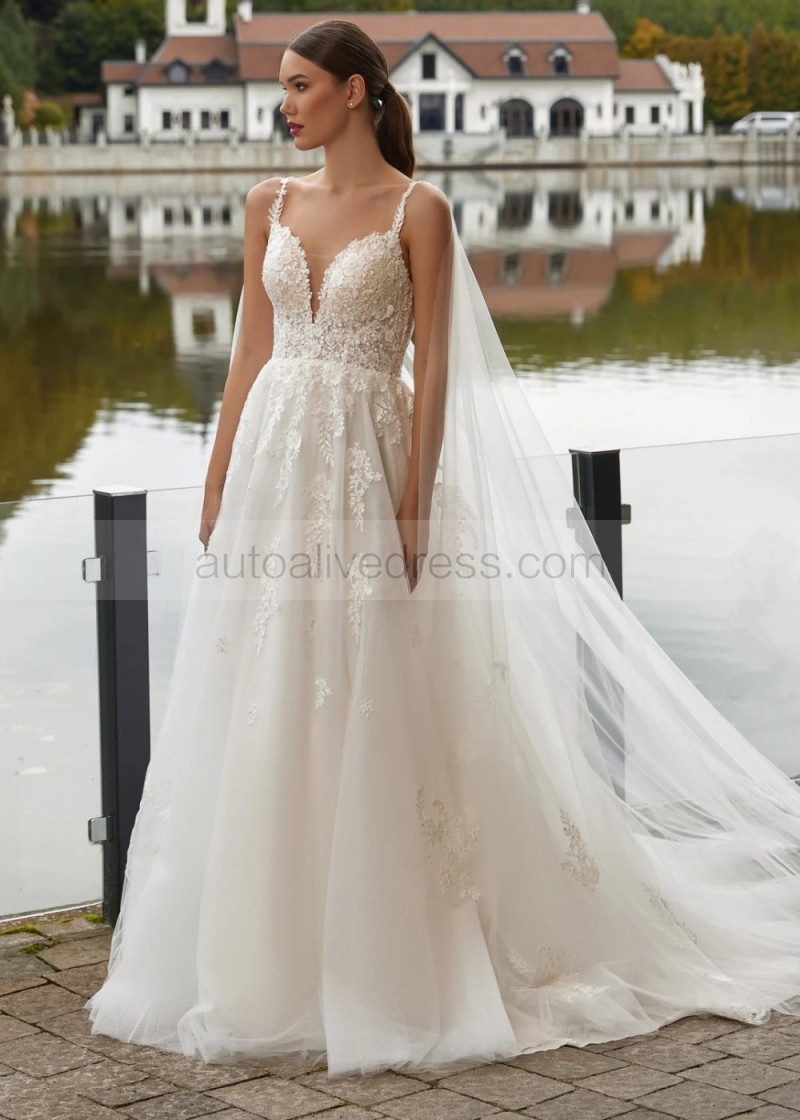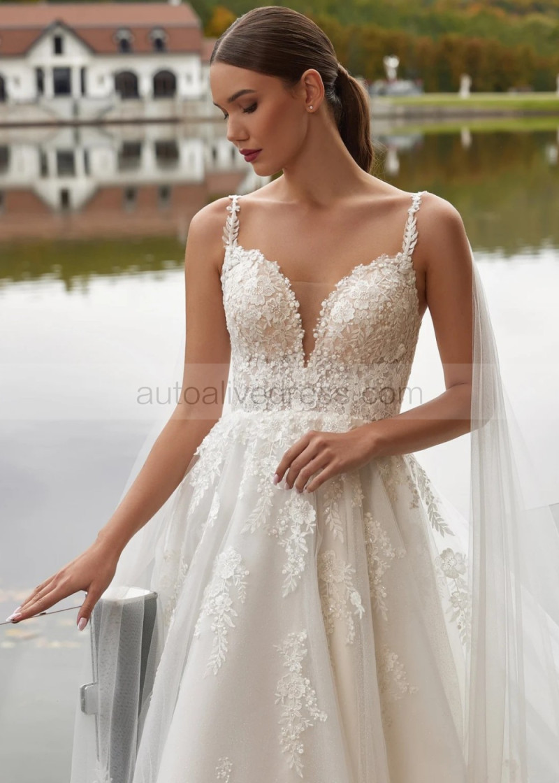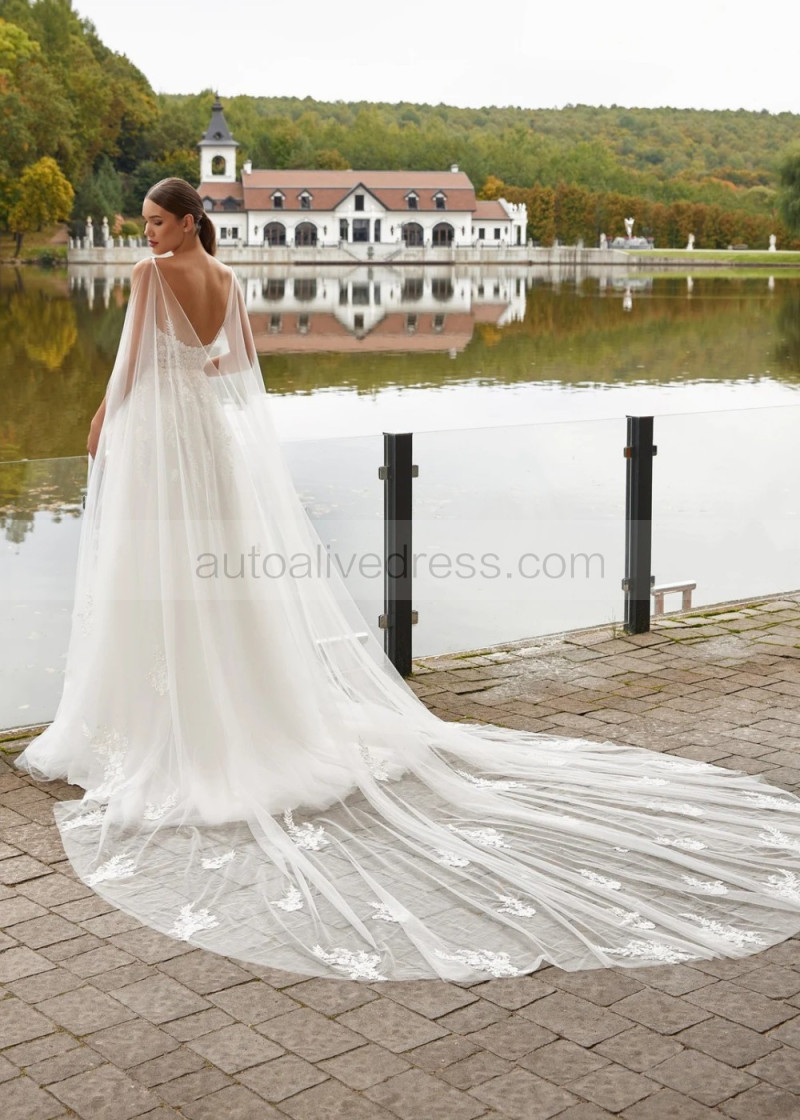Ivory Lace Tulle Low Open Back Wedding Dress With Watteau Train