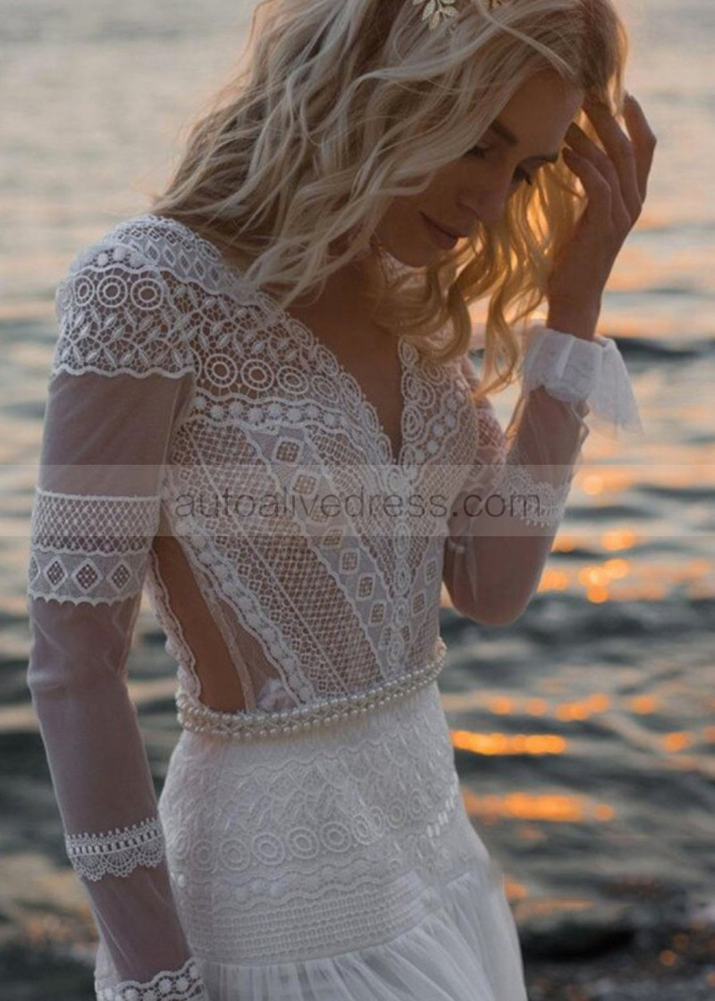 Ivory Lace Tulle Pearl Embellished Boho Wedding Dress