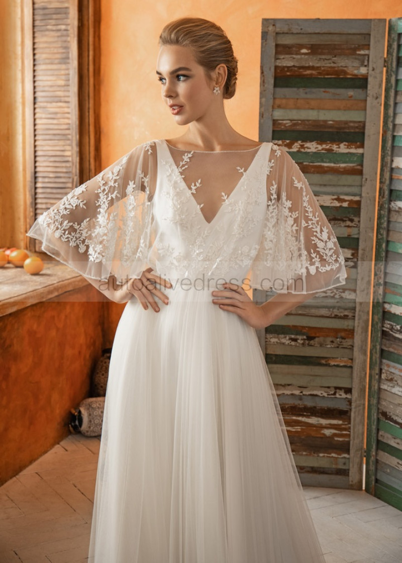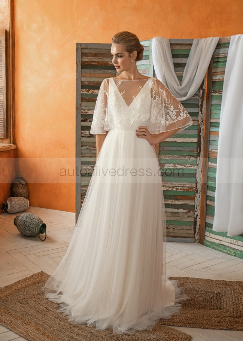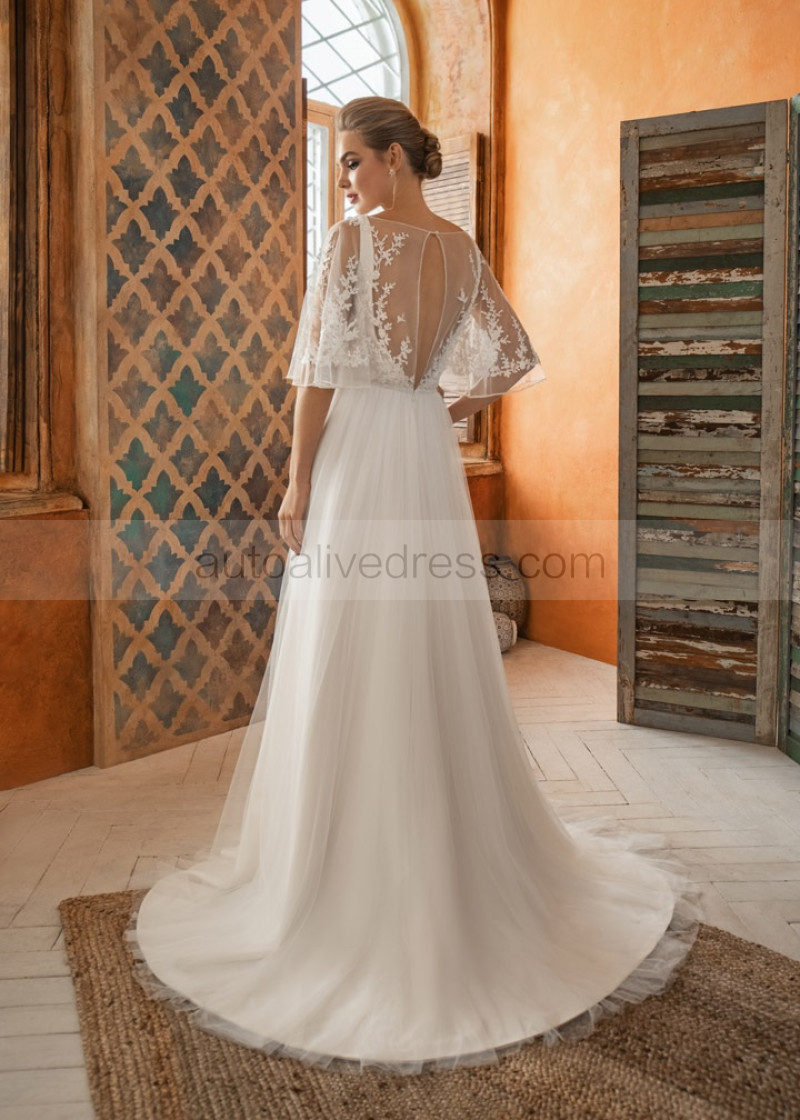 Ivory Lace Tulle Slit Open Back Elegant Wedding Dress
