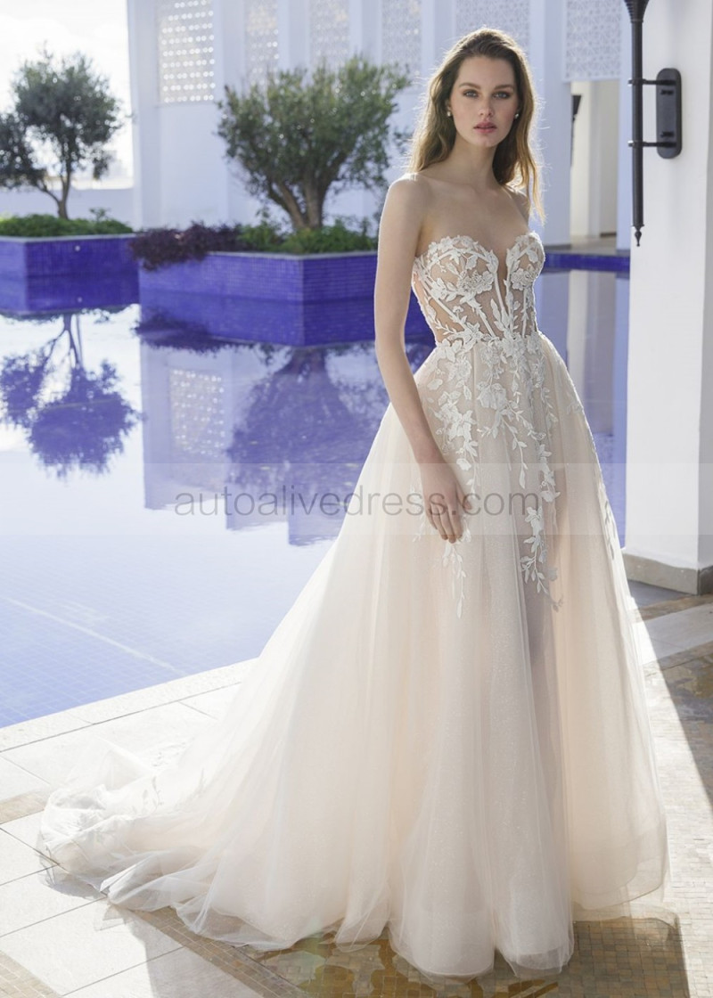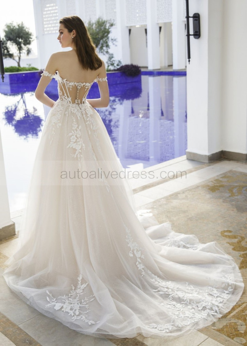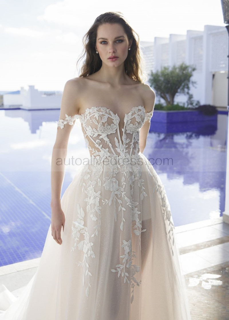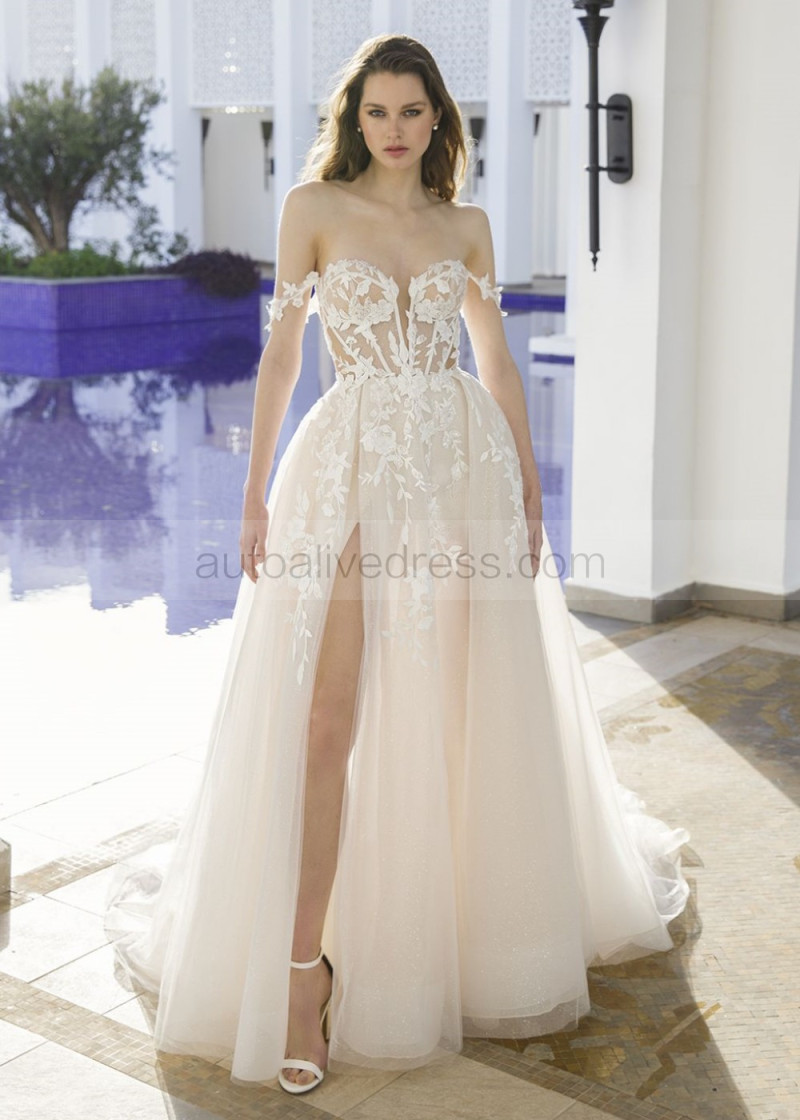 Ivory Lace Tulle Slit Sexy Wedding Dress With Detachable Straps