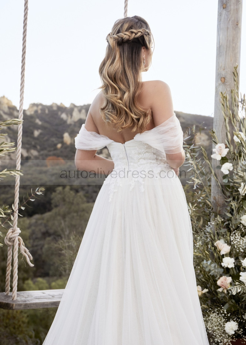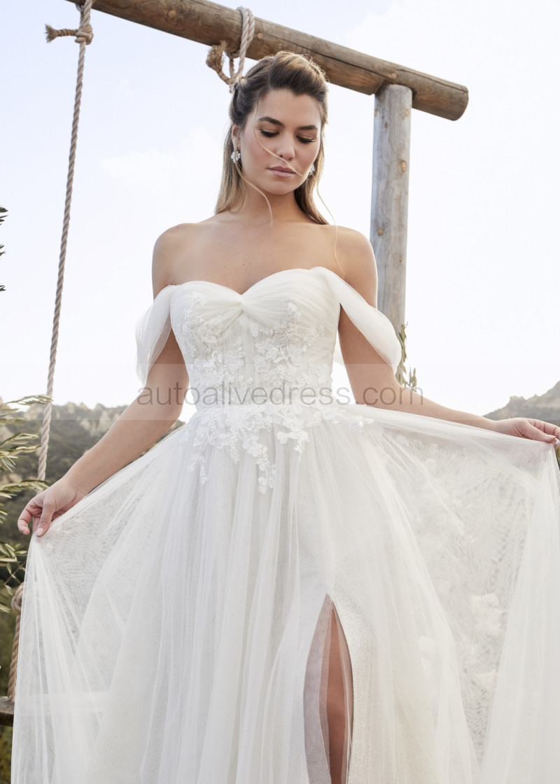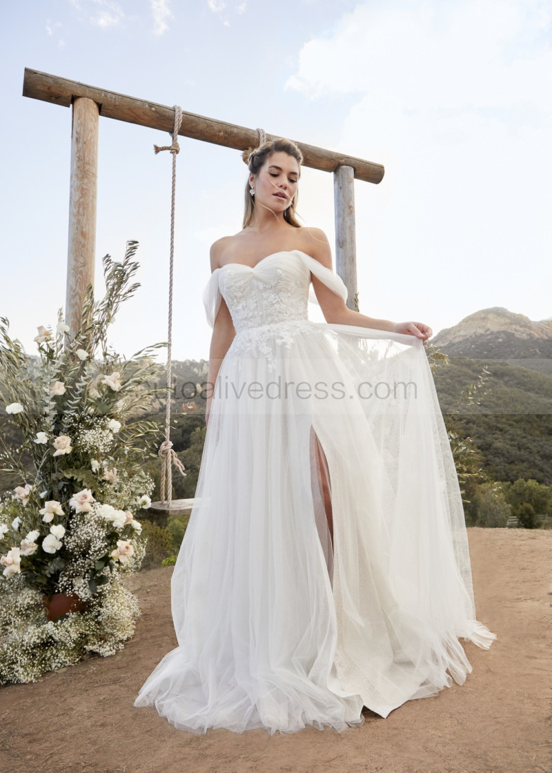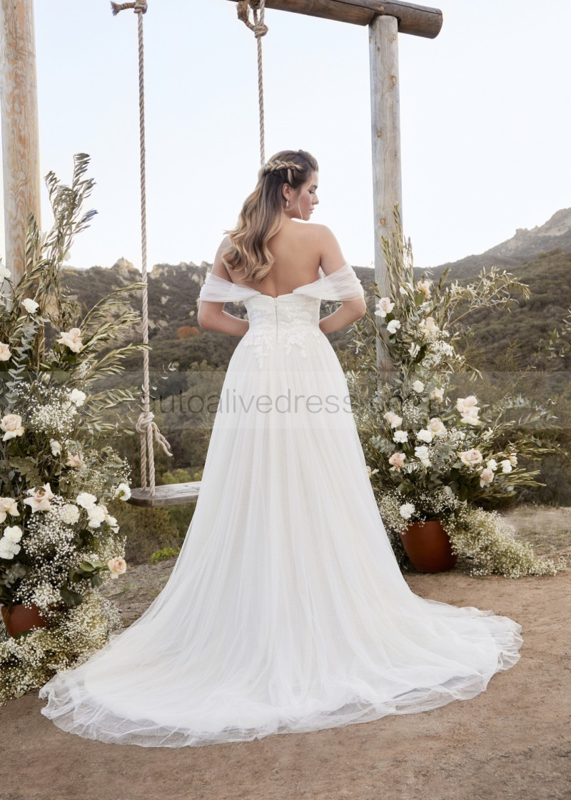 Ivory Lace Tulle Slit Wedding Dress With Removable Straps