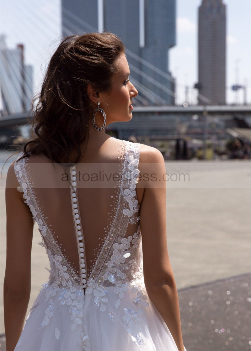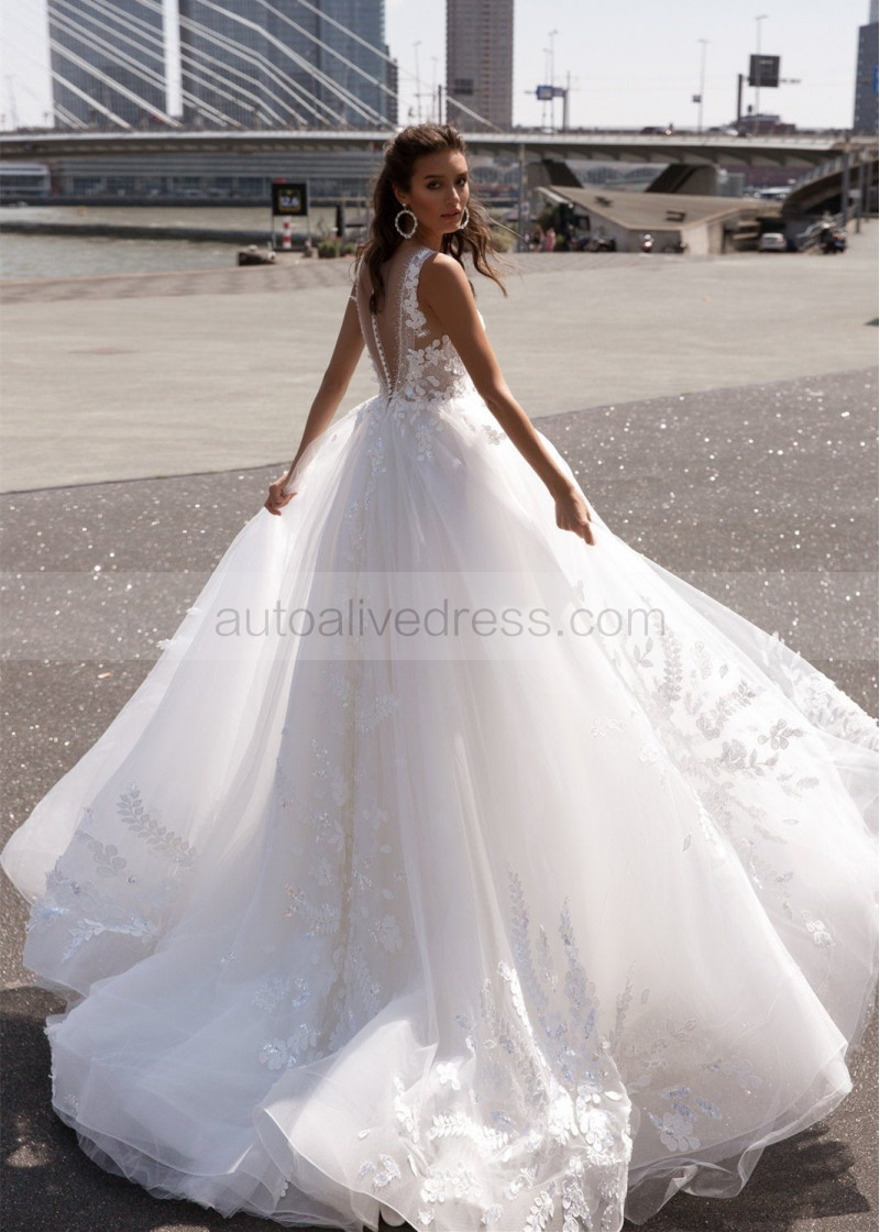 Ivory Lace Tulle Sparkle Buttons Back Wedding Dress