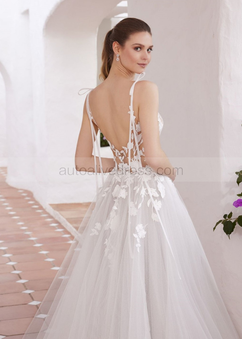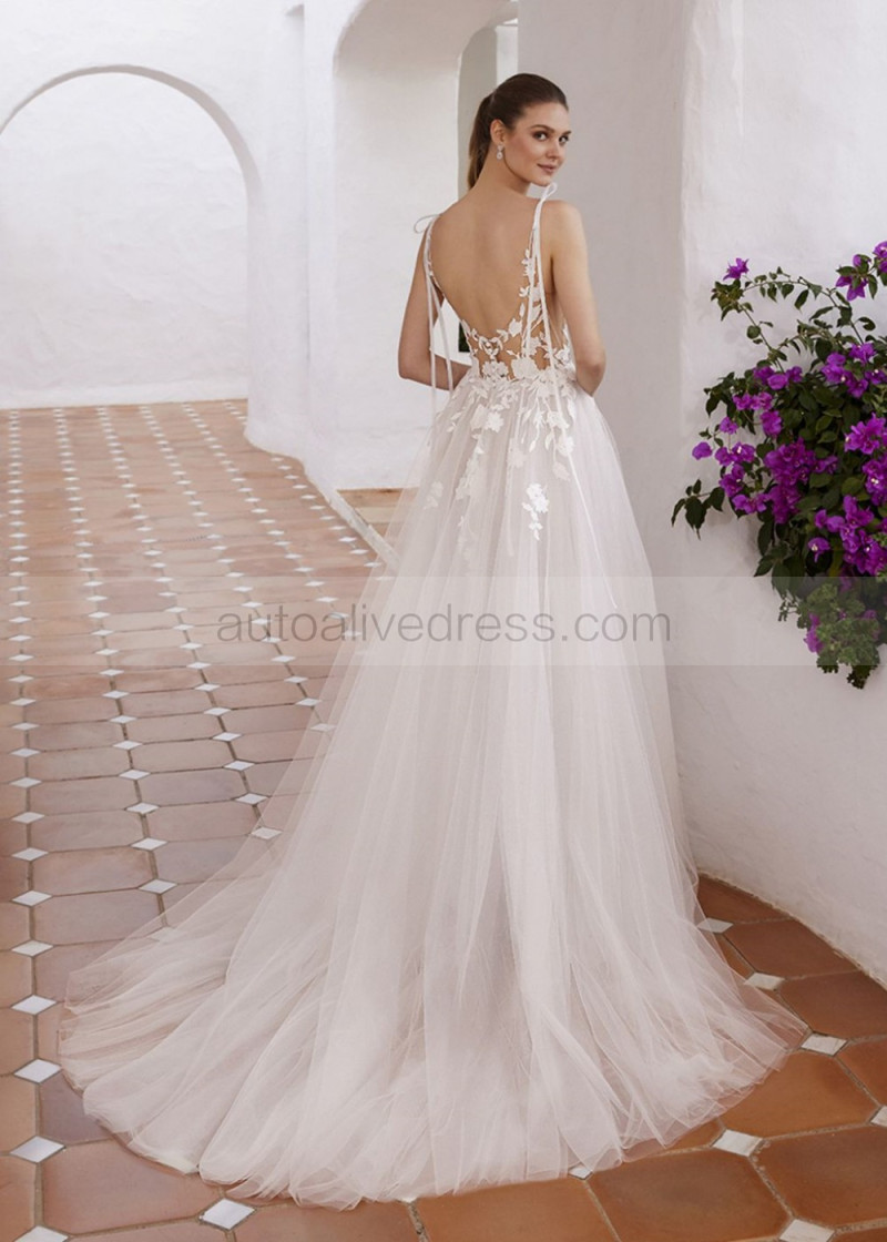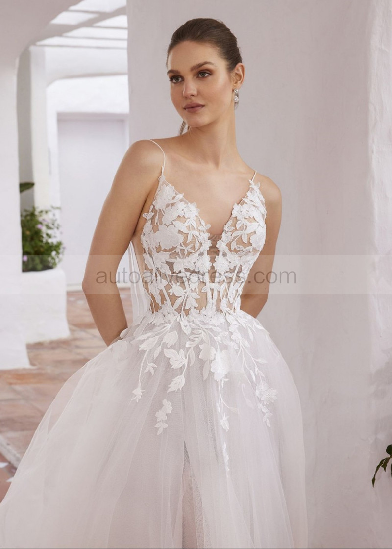 Ivory Lace Tulle V Back Hidden Slit Sexy Wedding Dress