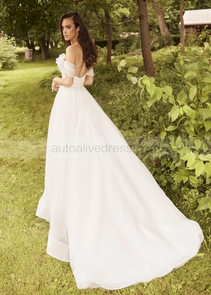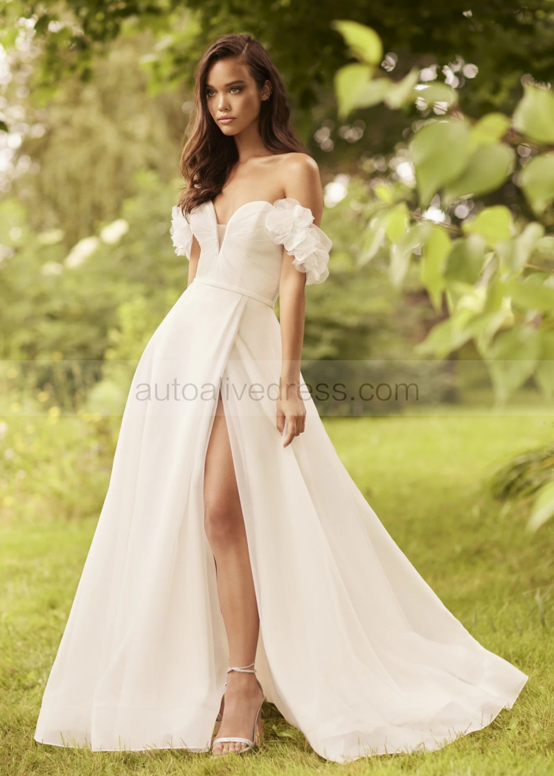 Ivory Pleated Organza Slit Modern Wedding Dress With Detachable Sleeves