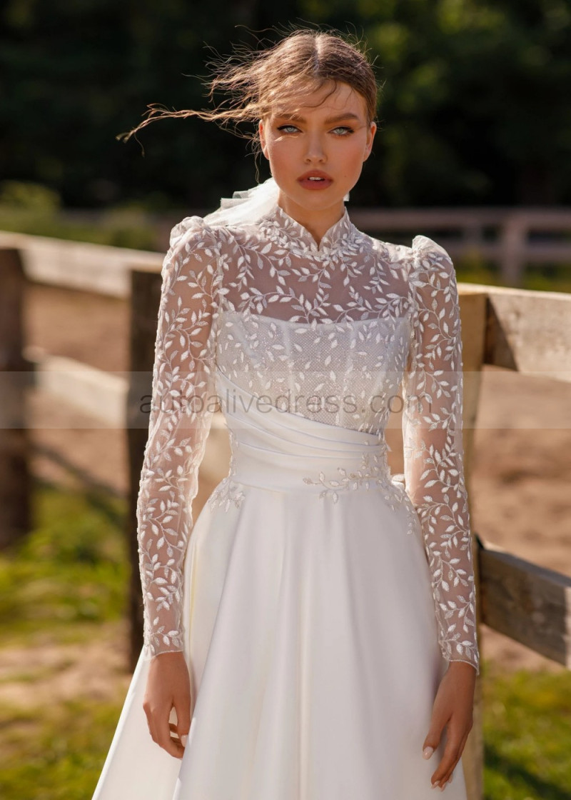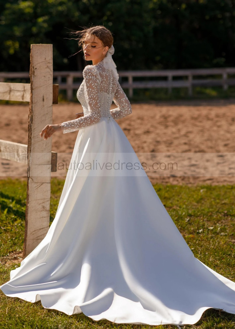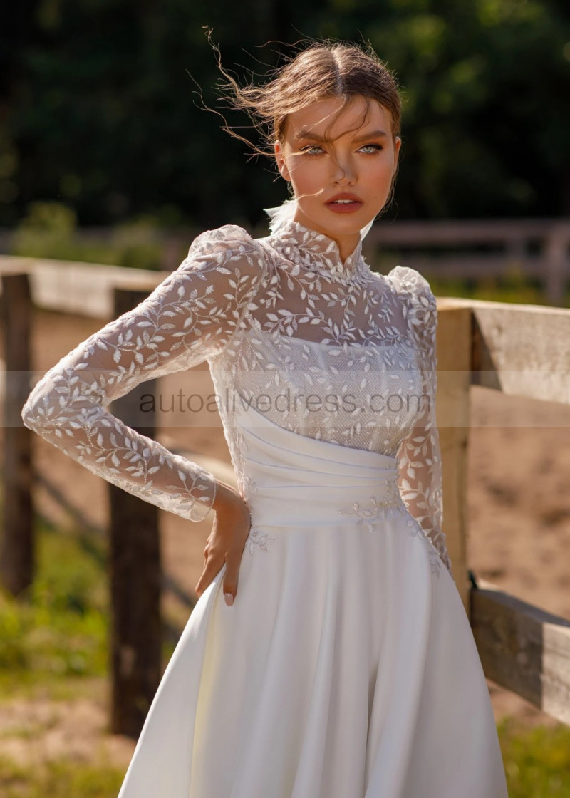 Ivory Satin Lace Buttons Back Unique Wedding Dress