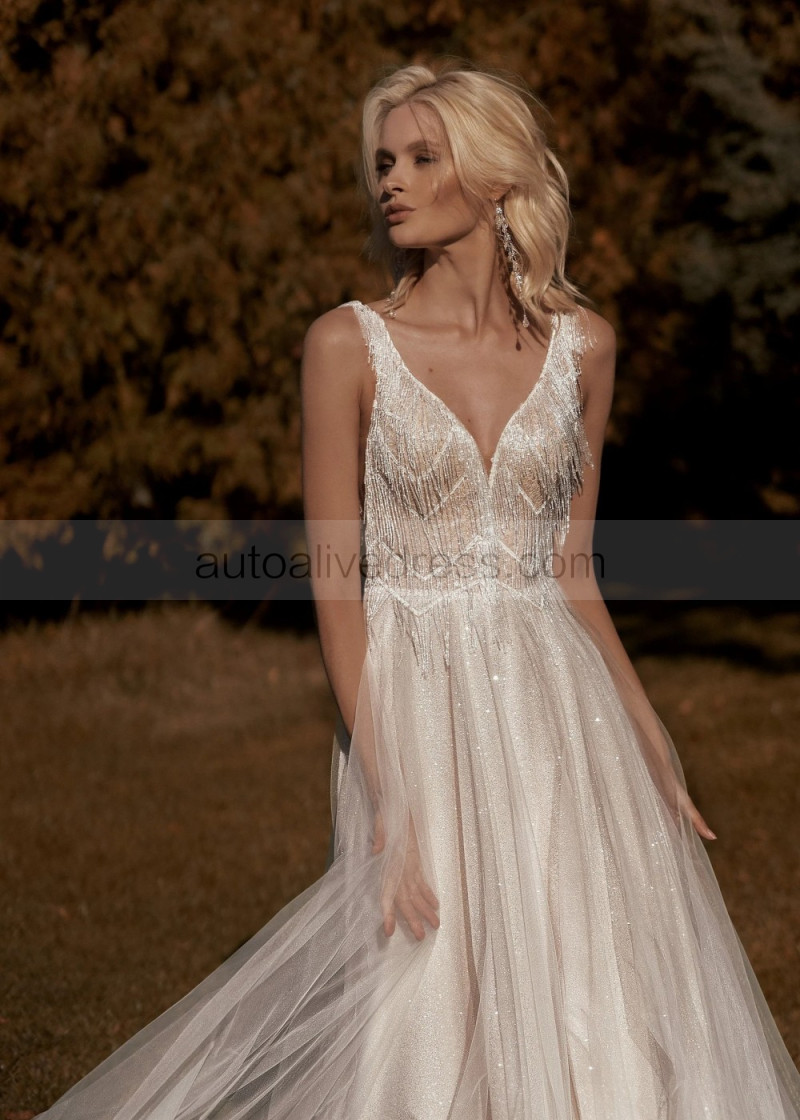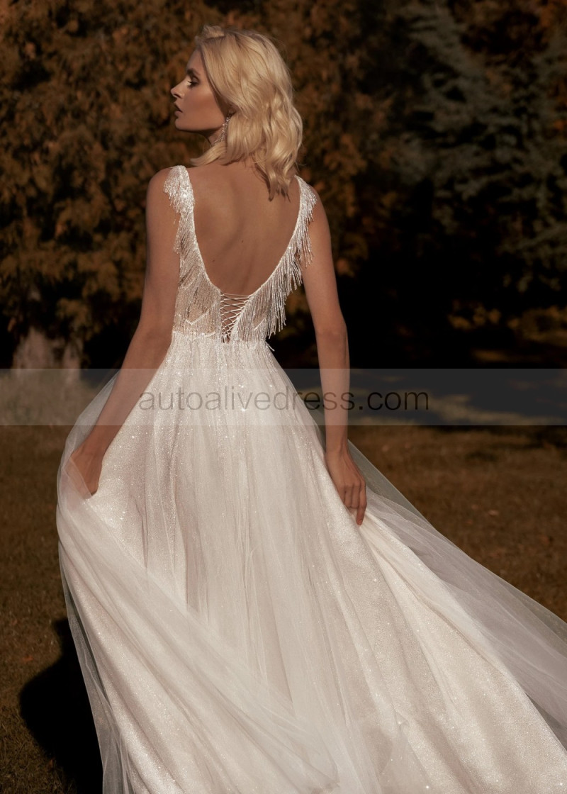 Ivory Tassel Glitter Tulle Trendy Wedding Dress