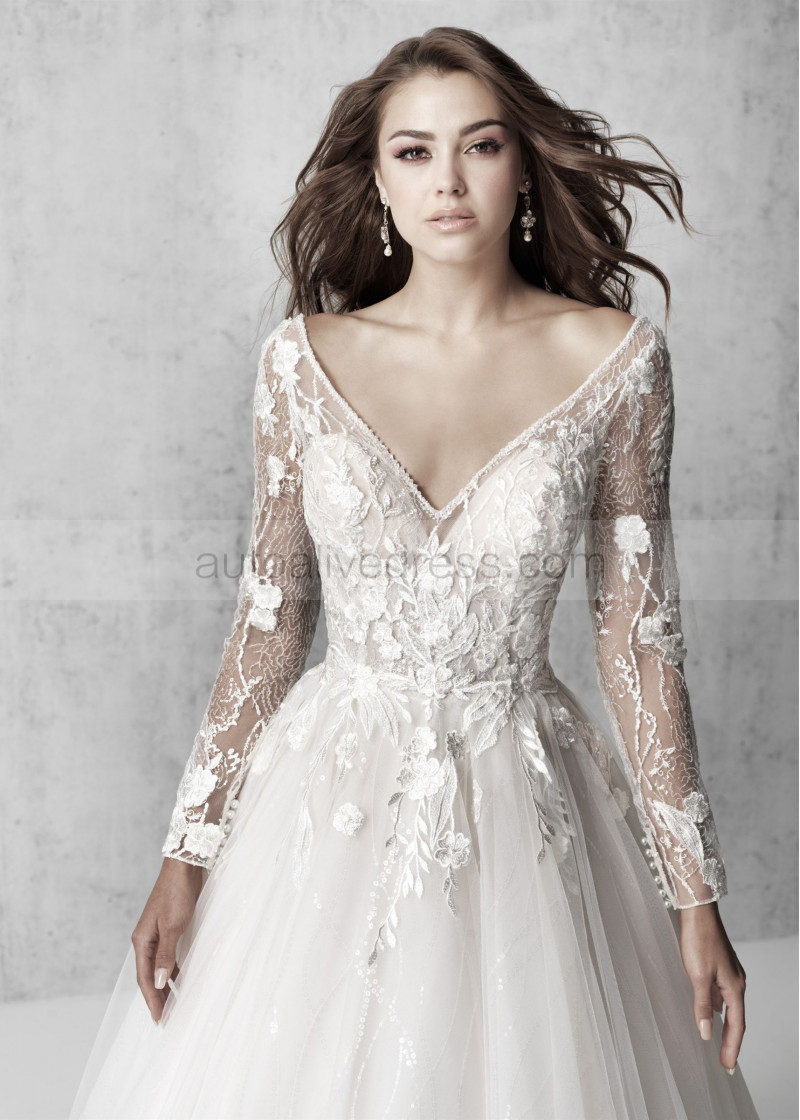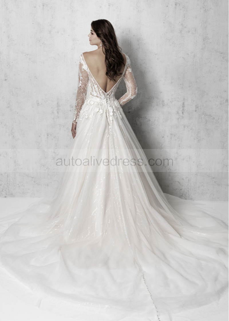 Long Sheer Sleeve Beaded Ivory Sequined Tulle Lace Wedding Dress