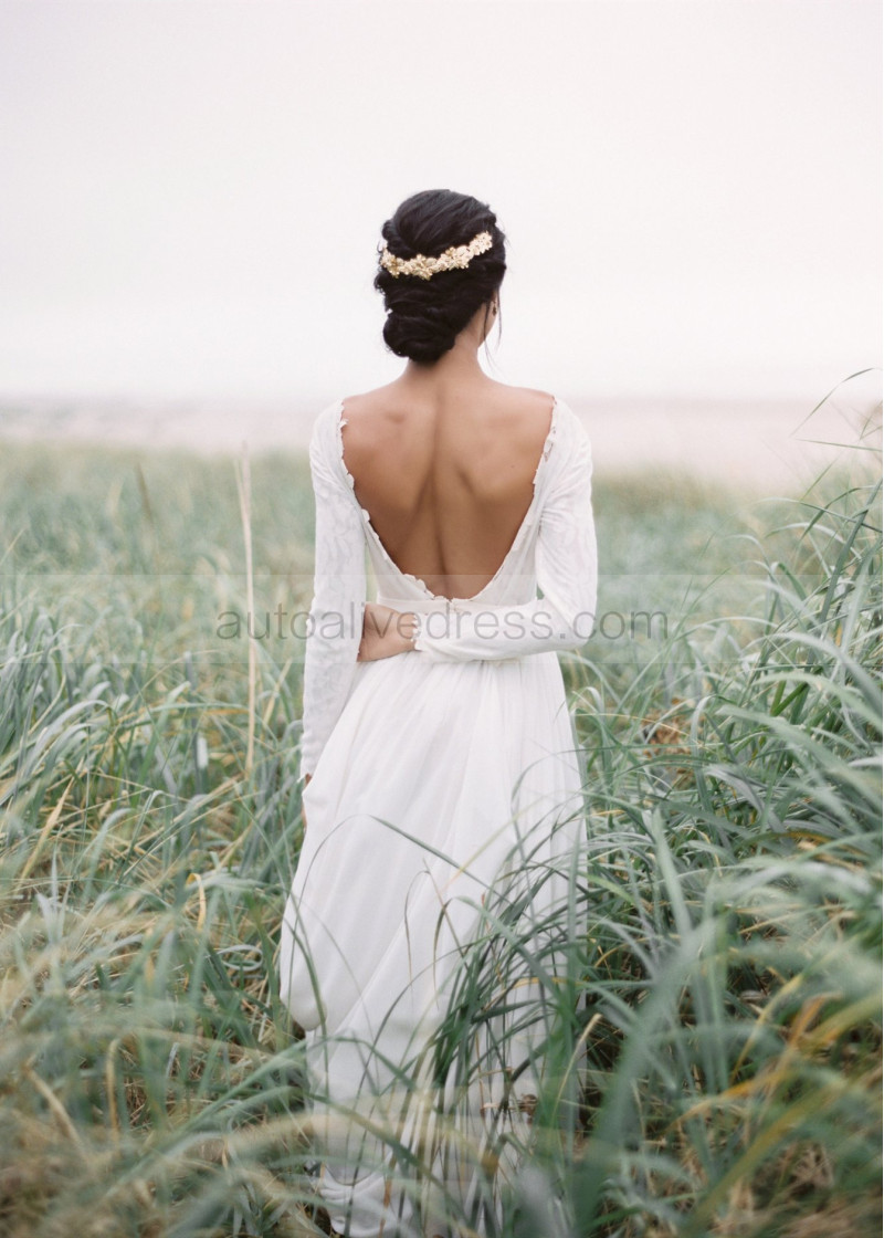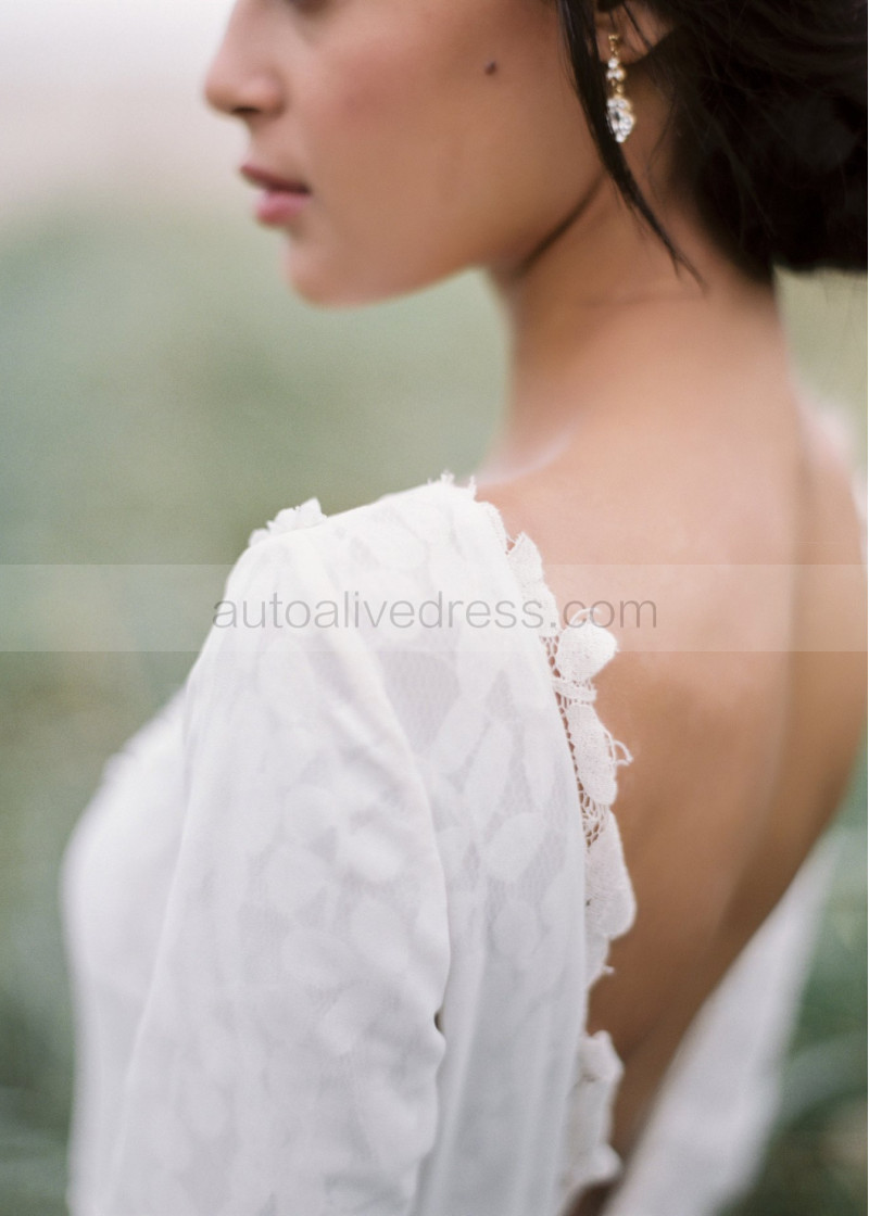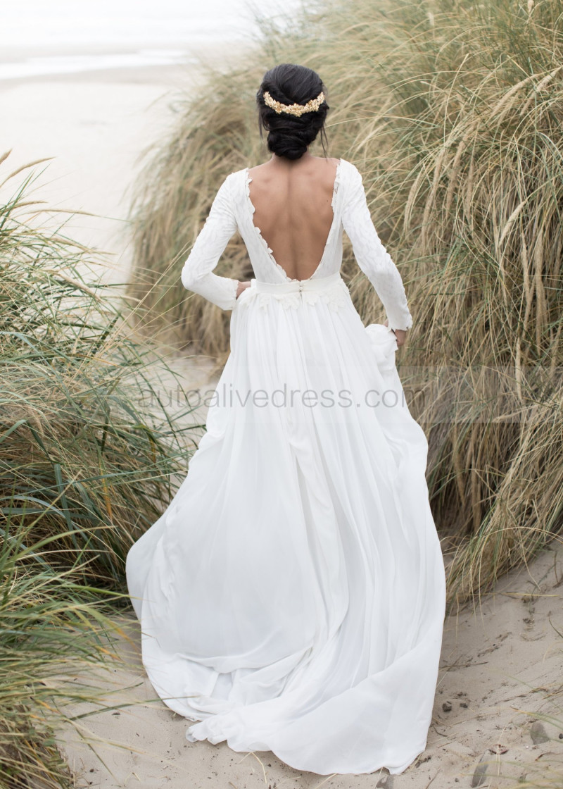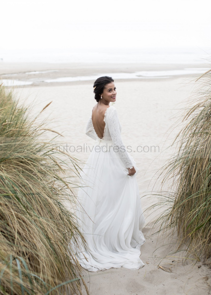 Long Sleeve Ivory Lace Chiffon V Back Wedding Dress