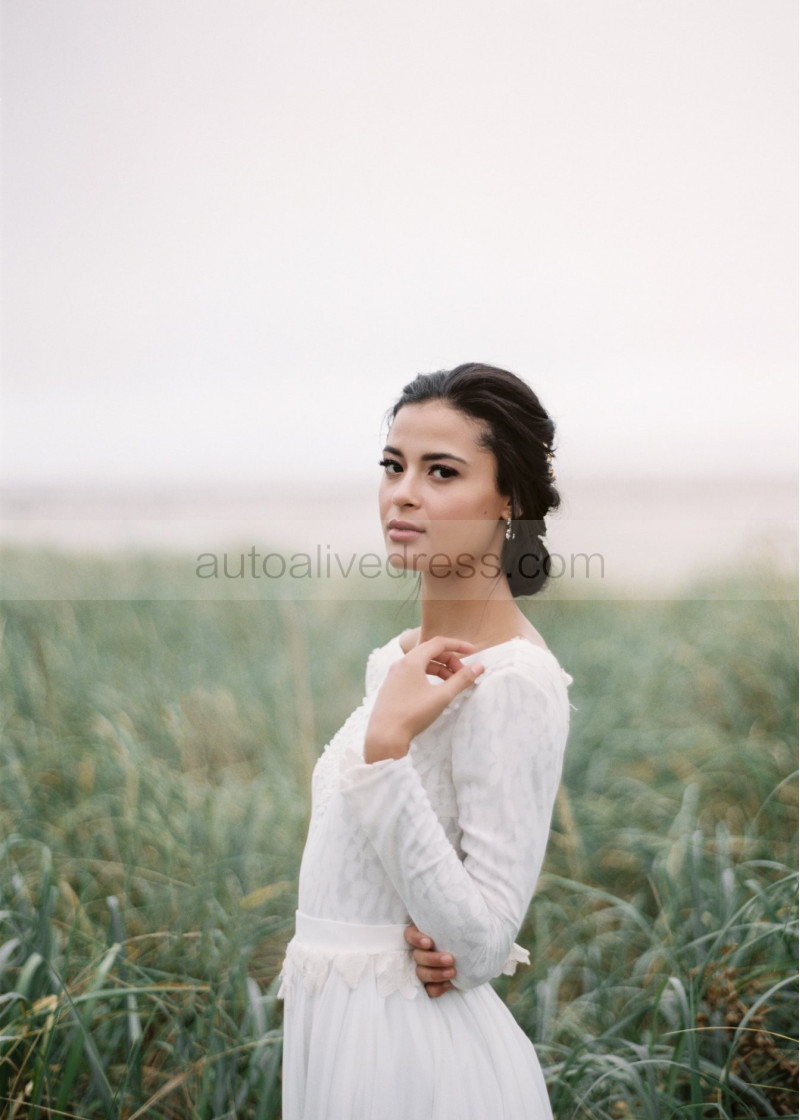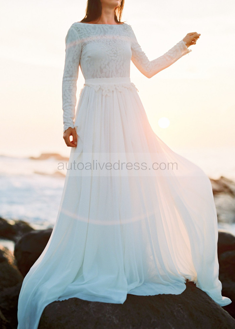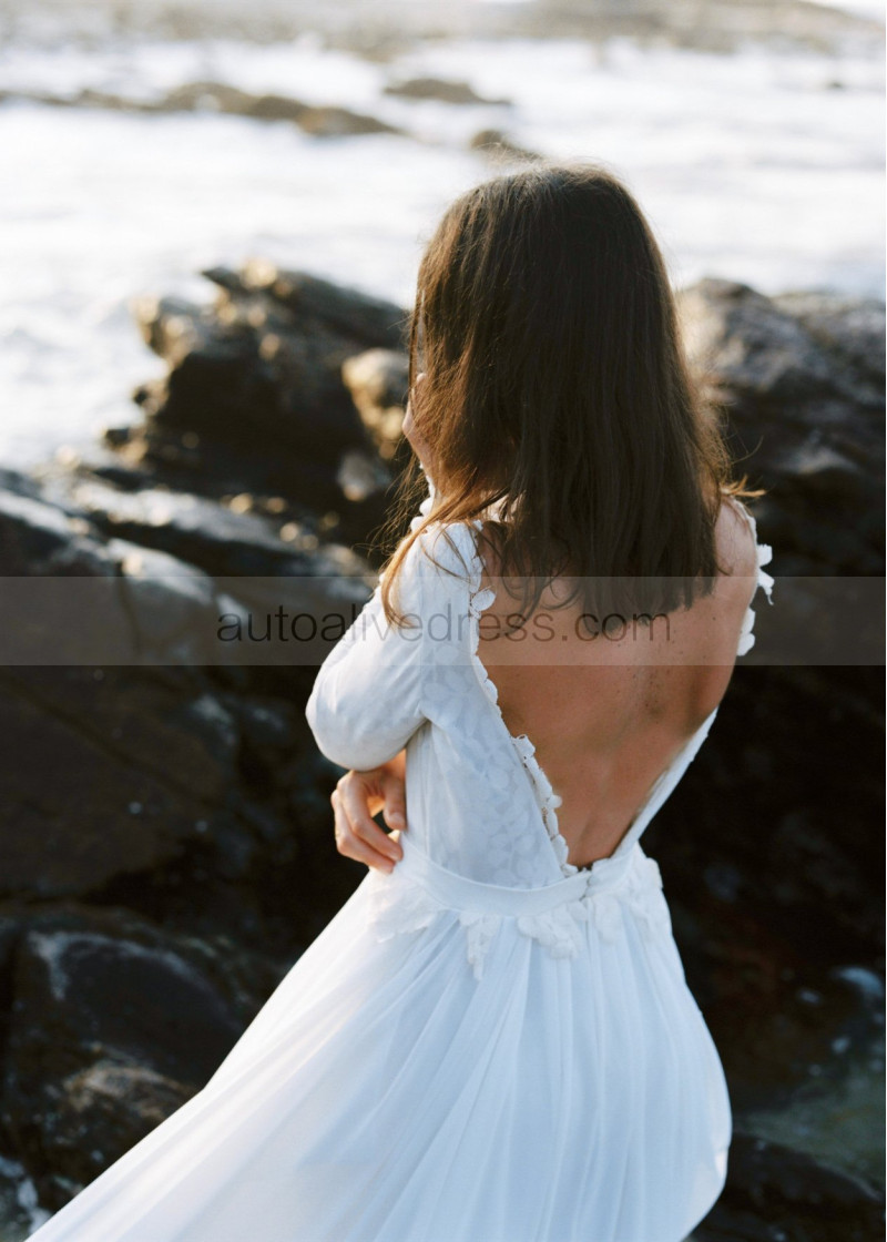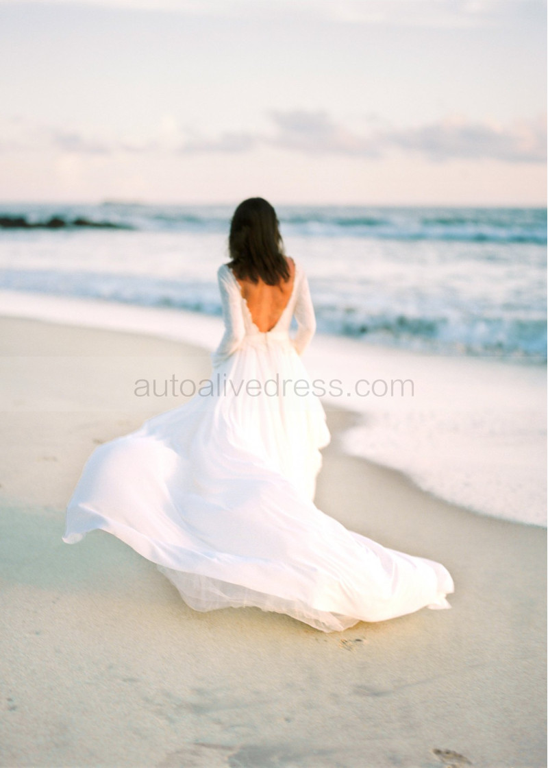 Long Sleeve Ivory Lace Chiffon V Back Wedding Dress