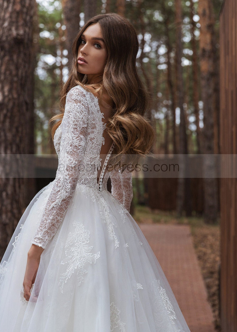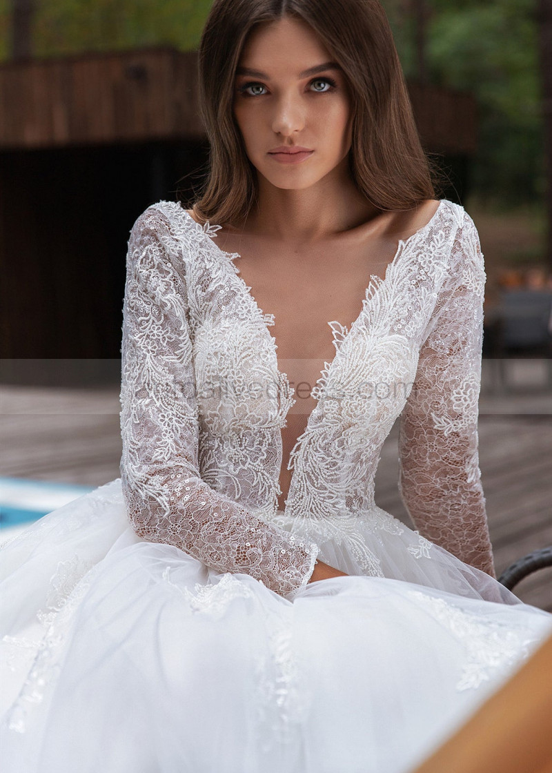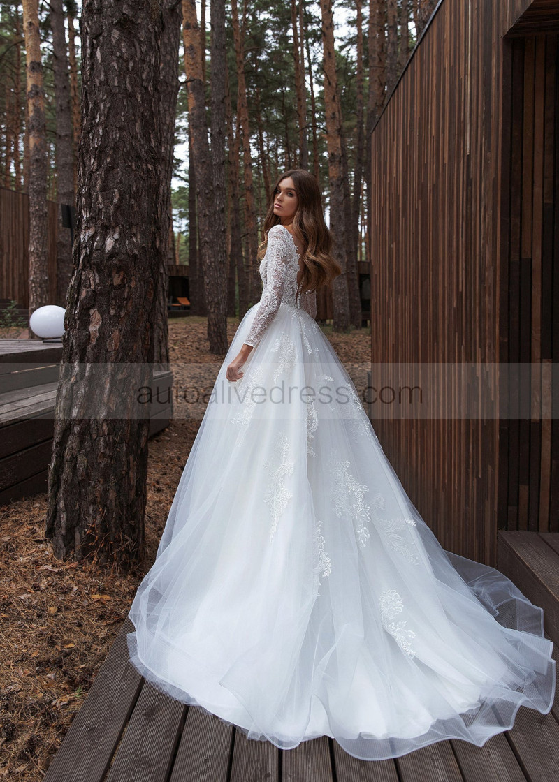 Long Sleeve Ivory Lace Tulle Beaded Wedding Dress
