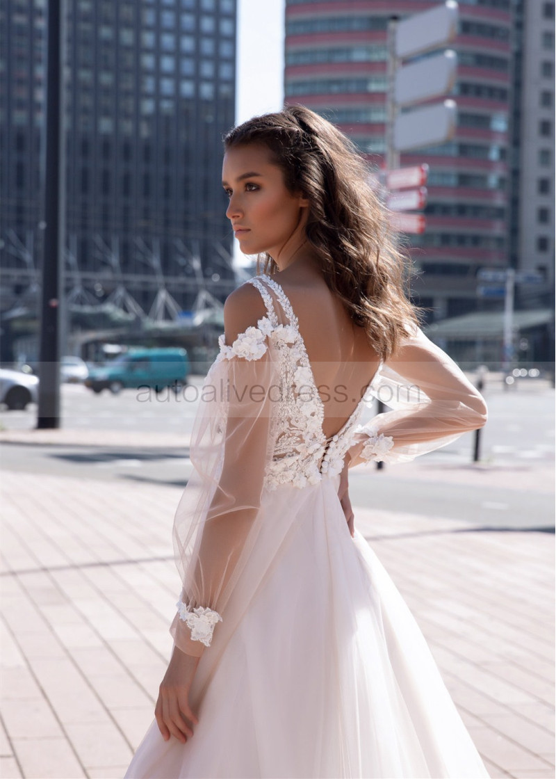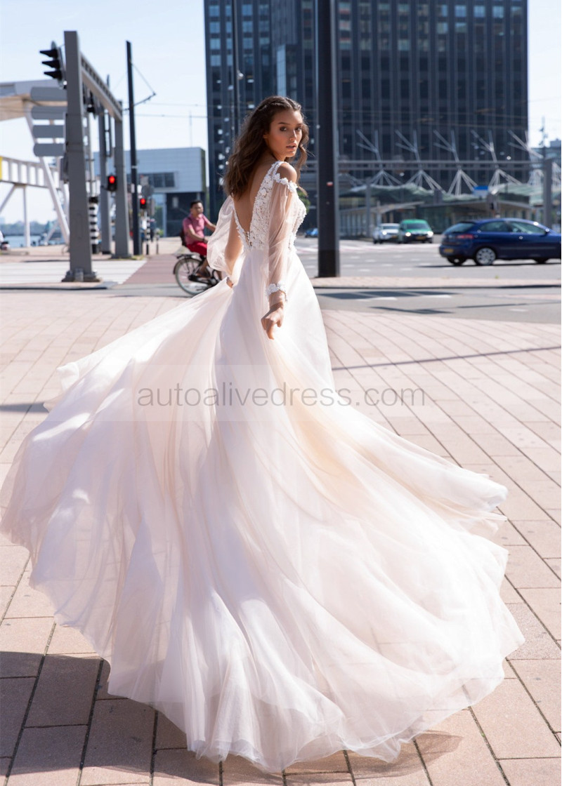 Long Sleeve Ivory Lace Tulle V Back Wedding Dress