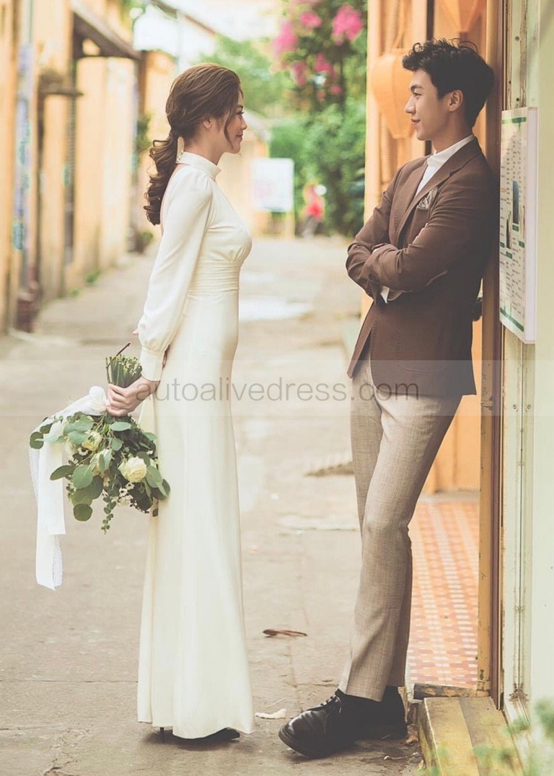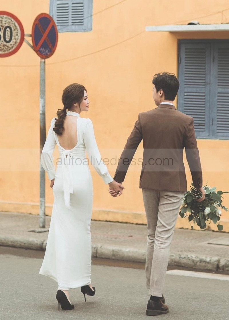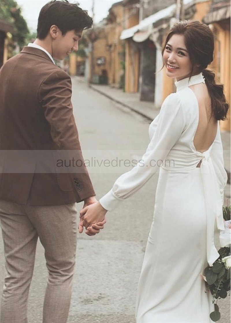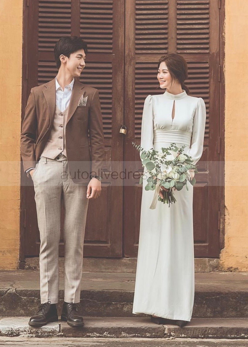 Long Sleeve Ivory Satin Keyhole Back Minimalist Wedding Dress
