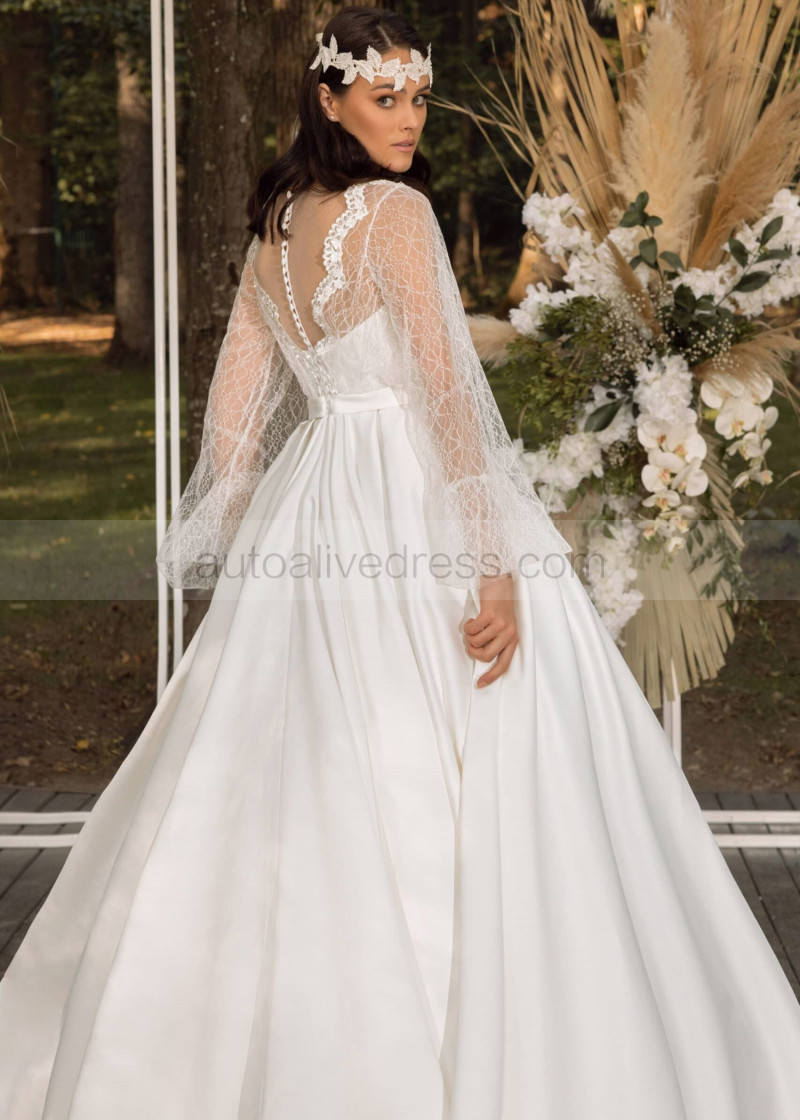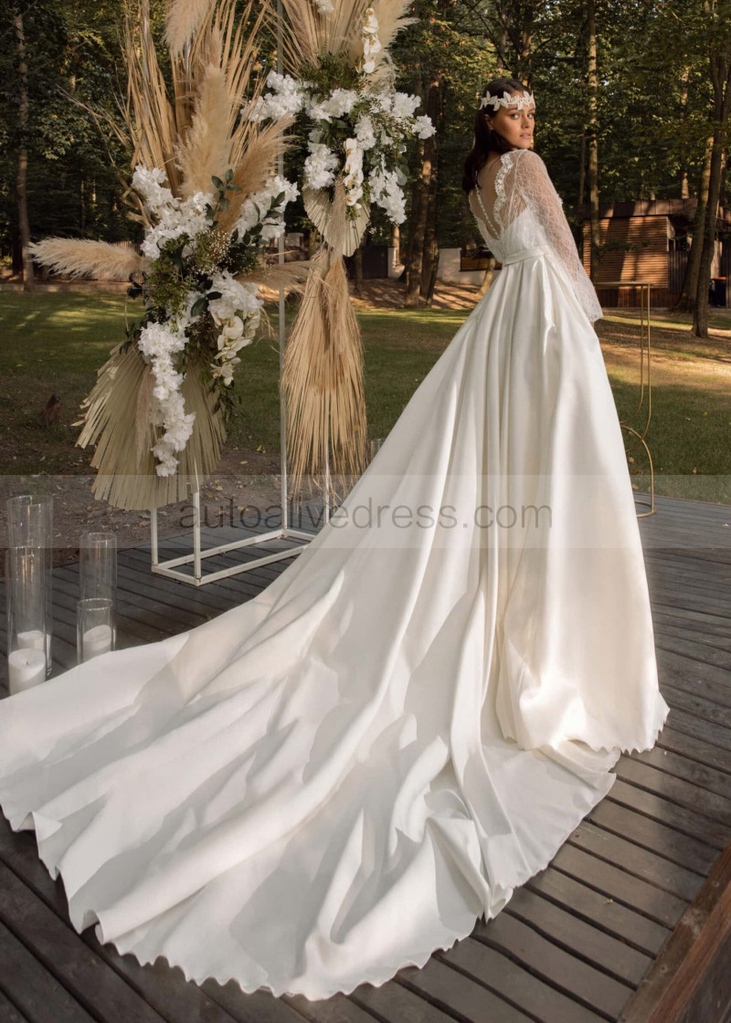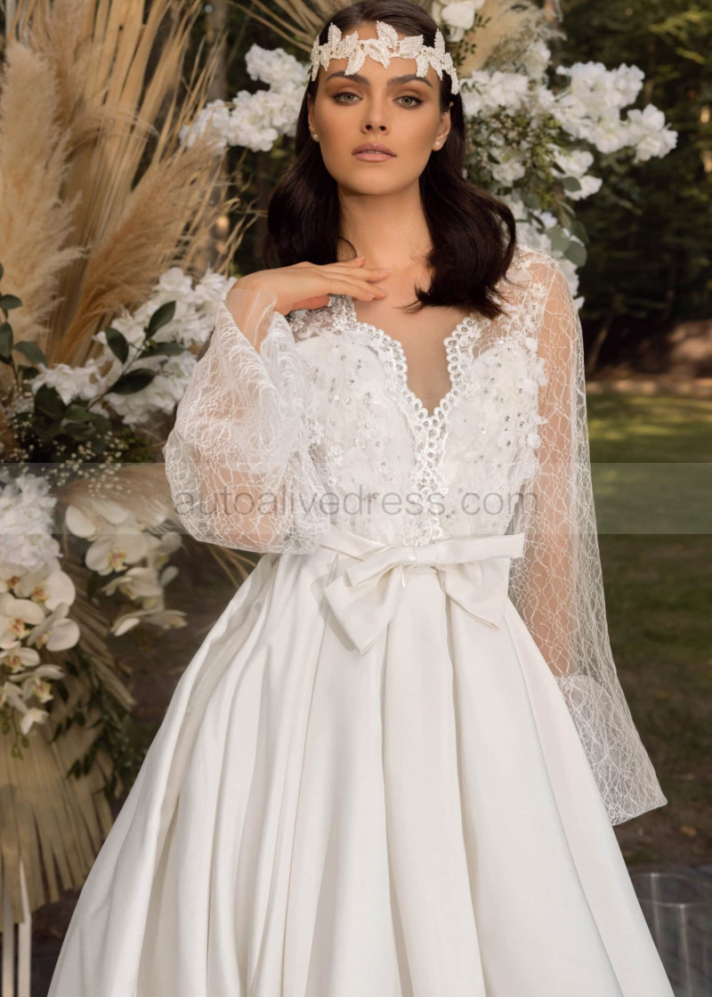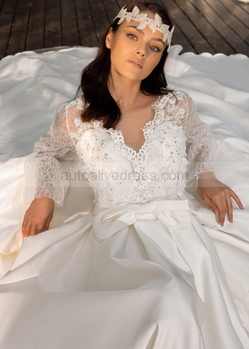 Long Sleeves Beaded Ivory Lace Satin Charming Wedding Dress
