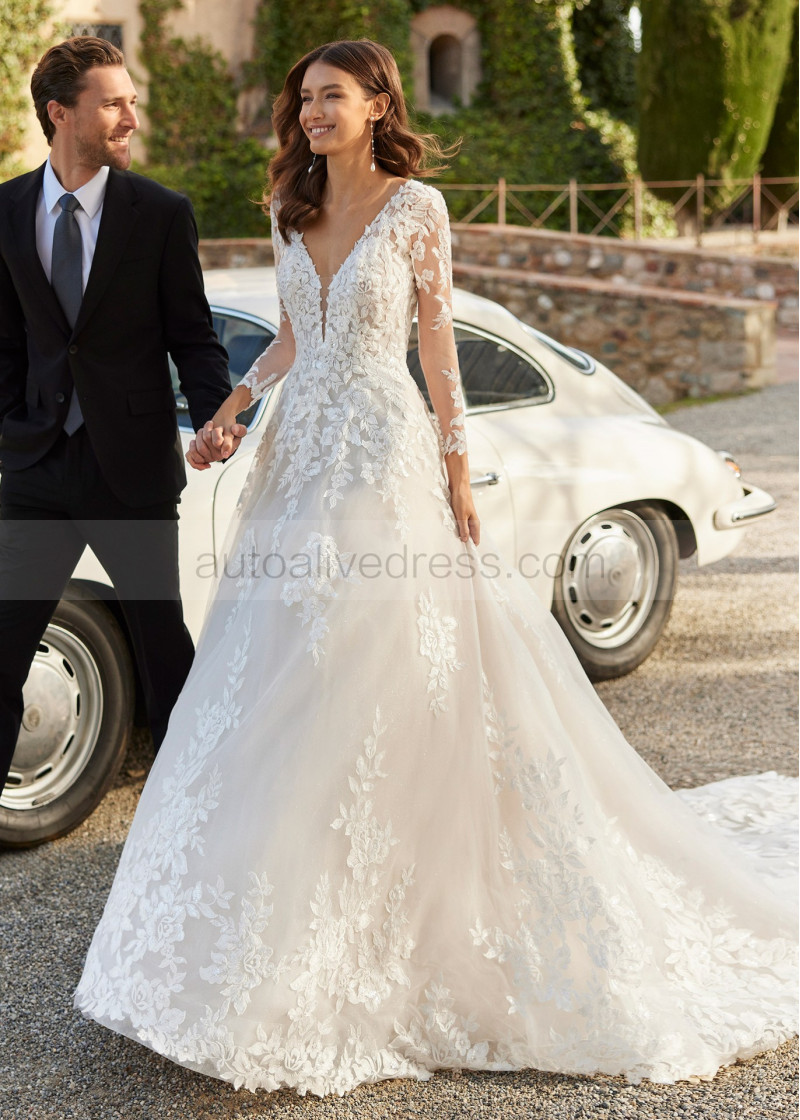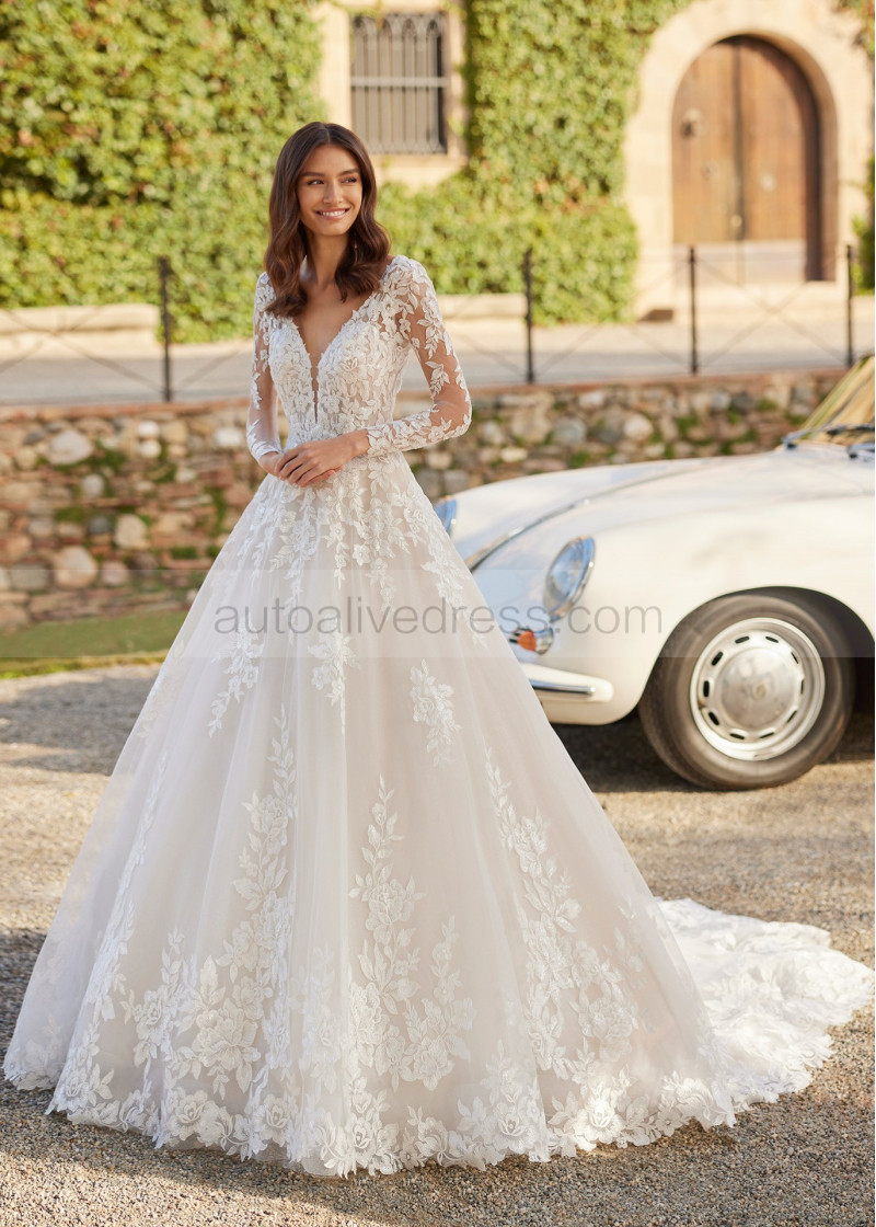 Long Sleeves Beaded Ivory Lace Tulle Floral Stunning Wedding Dress