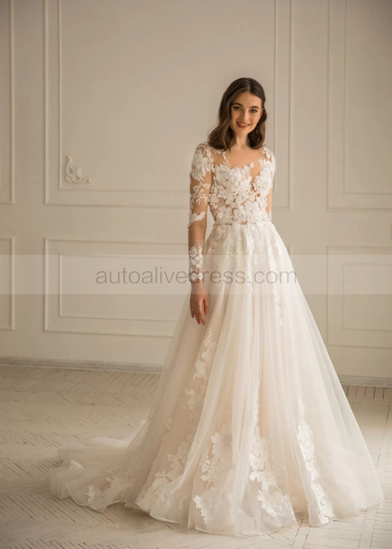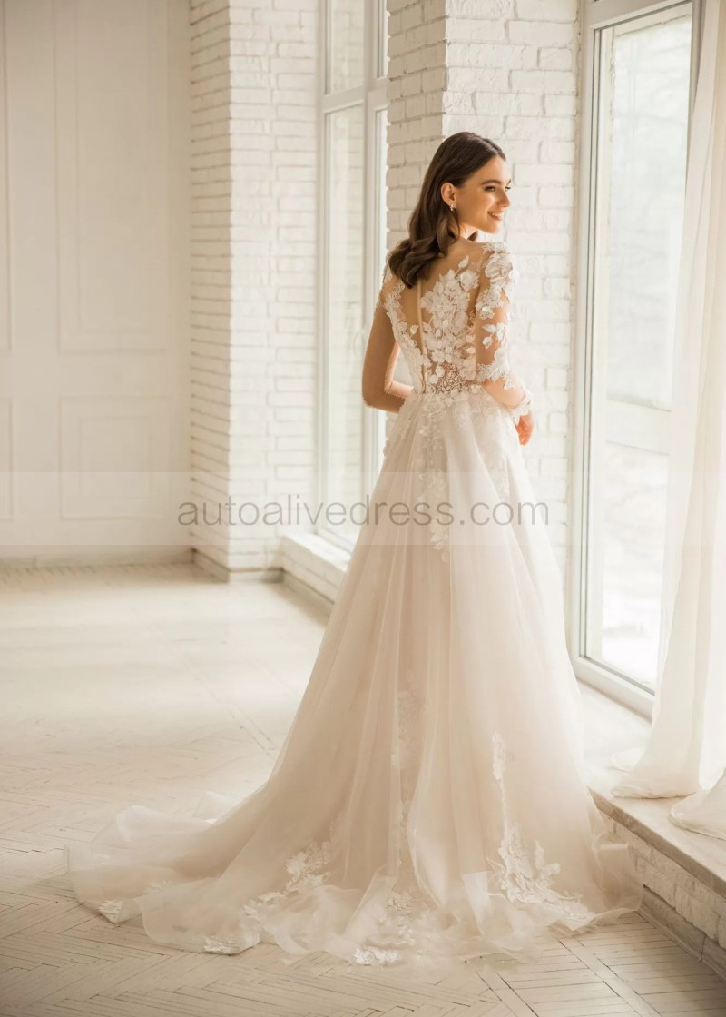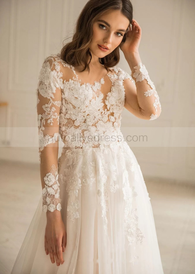 Long Sleeves Beaded Ivory Lace Tulle Gorgeous Wedding Dress