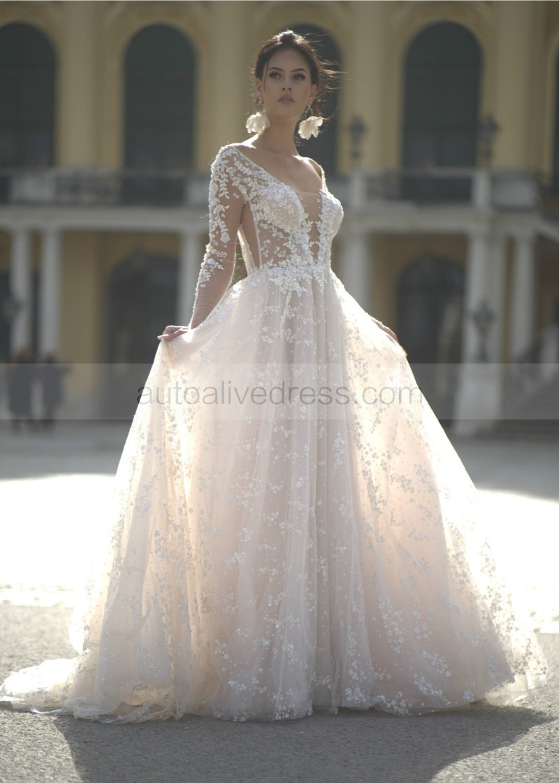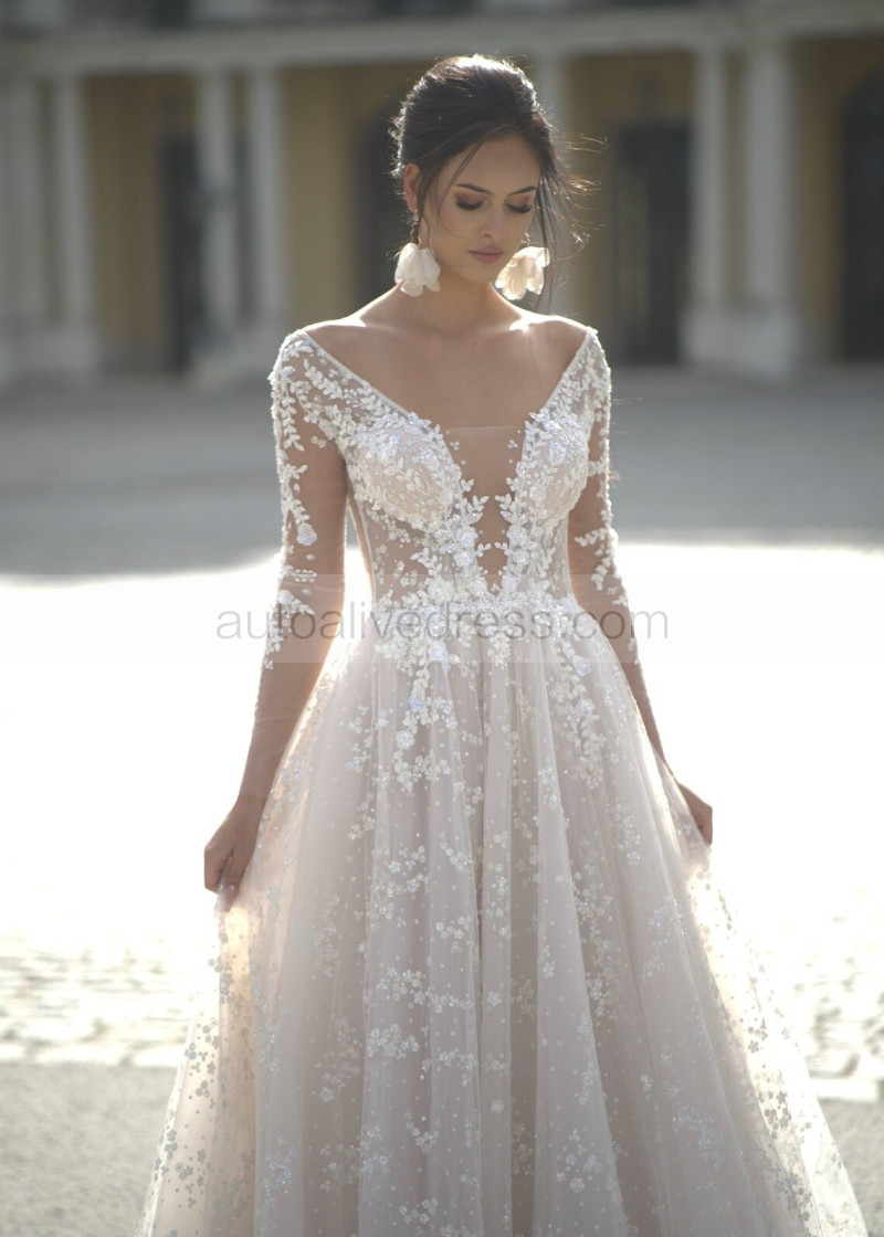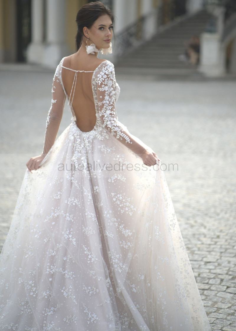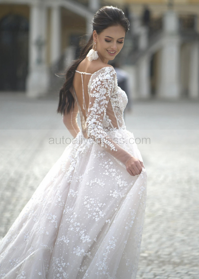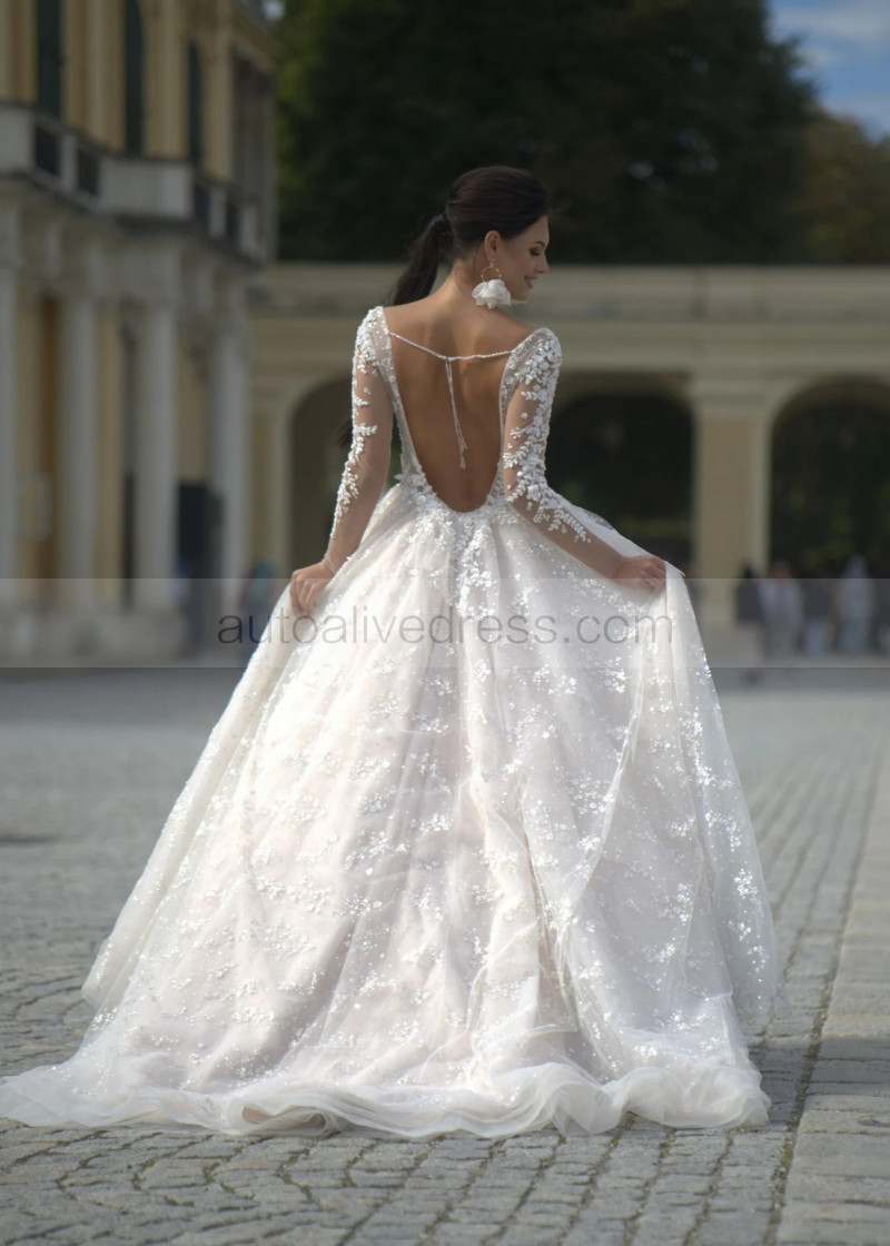 Long Sleeves Beaded Ivory Lace Tulle Luxury Wedding Dress