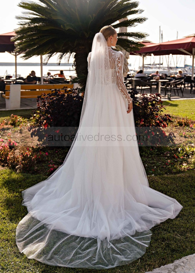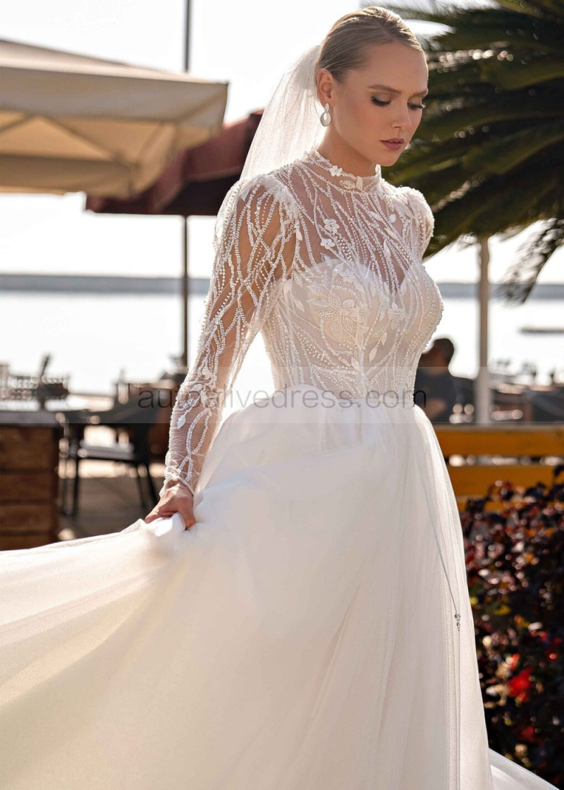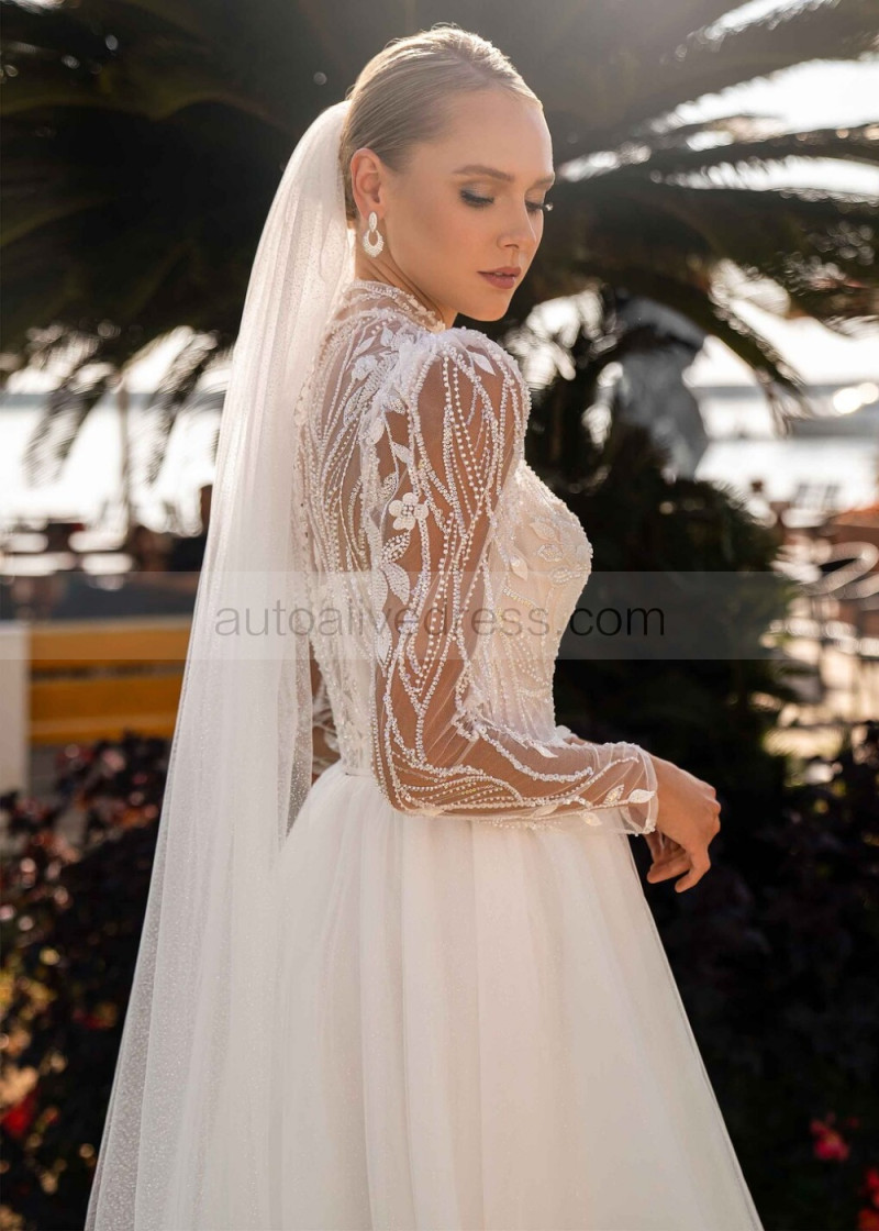 Long Sleeves Beaded Ivory Lace Tulle Sparkling Wedding Dress