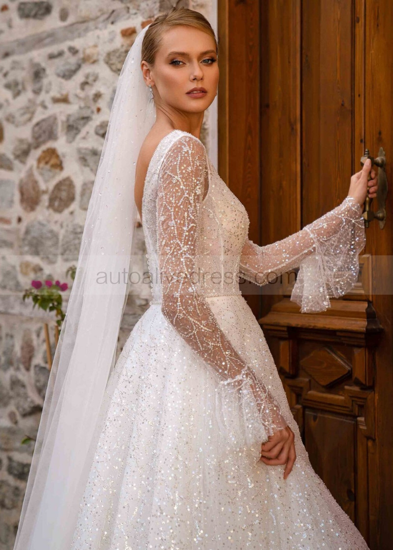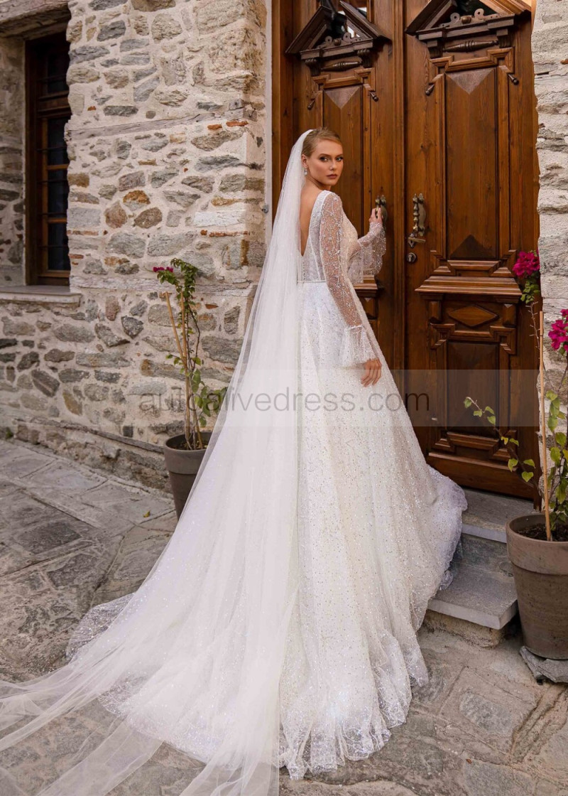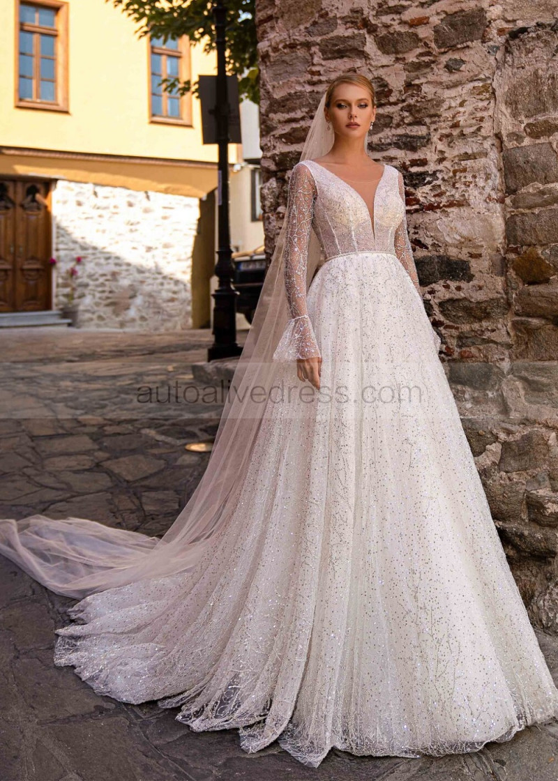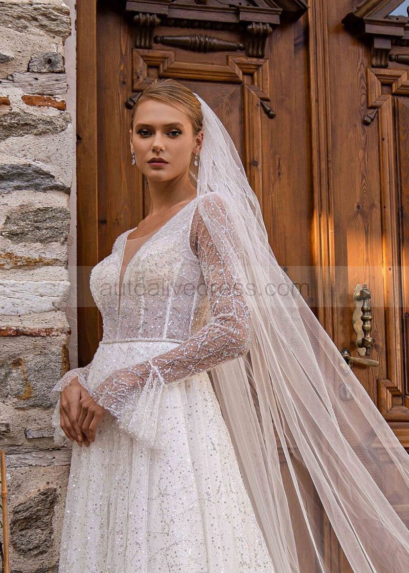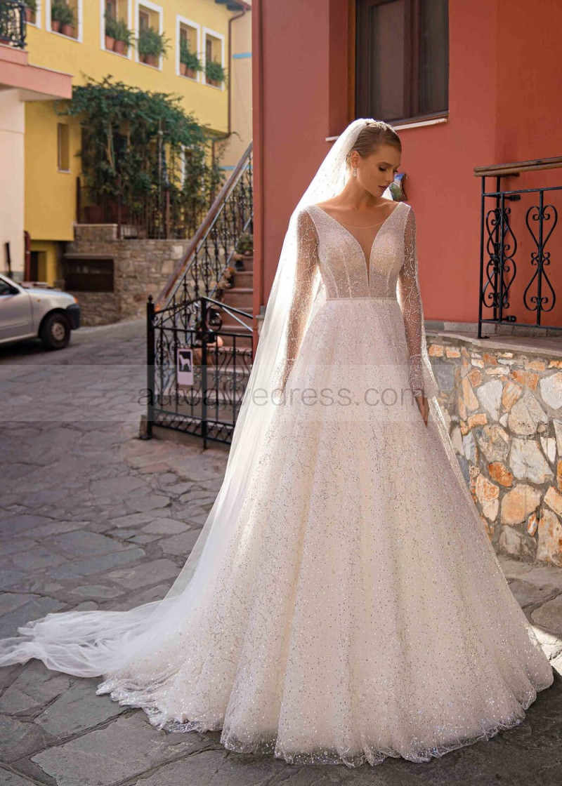 Long Sleeves Beaded Ivory Lace Tulle Timeless Wedding Dress