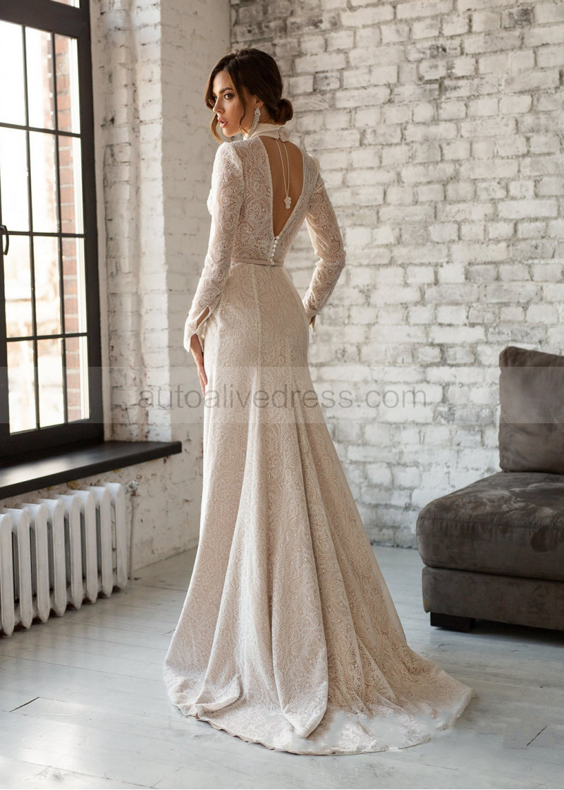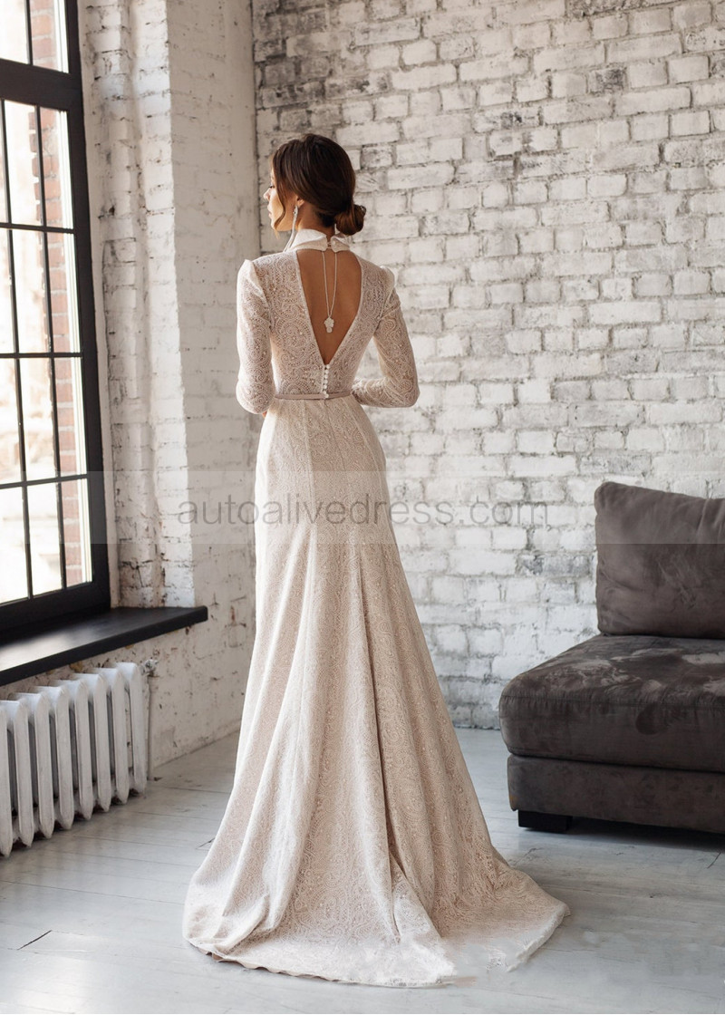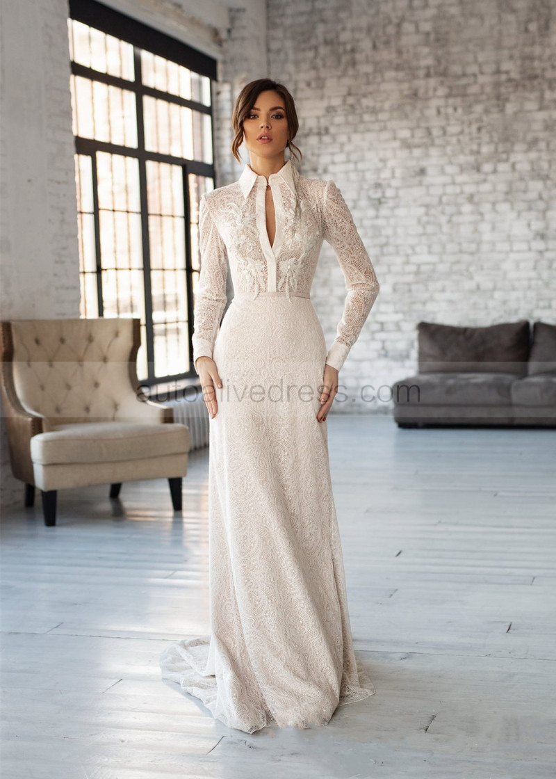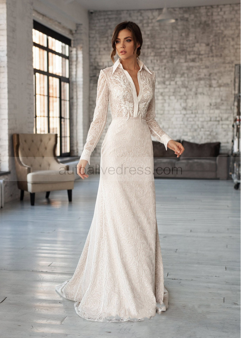 Long Sleeves Beaded Ivory Lace Wedding Dress