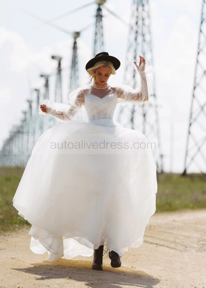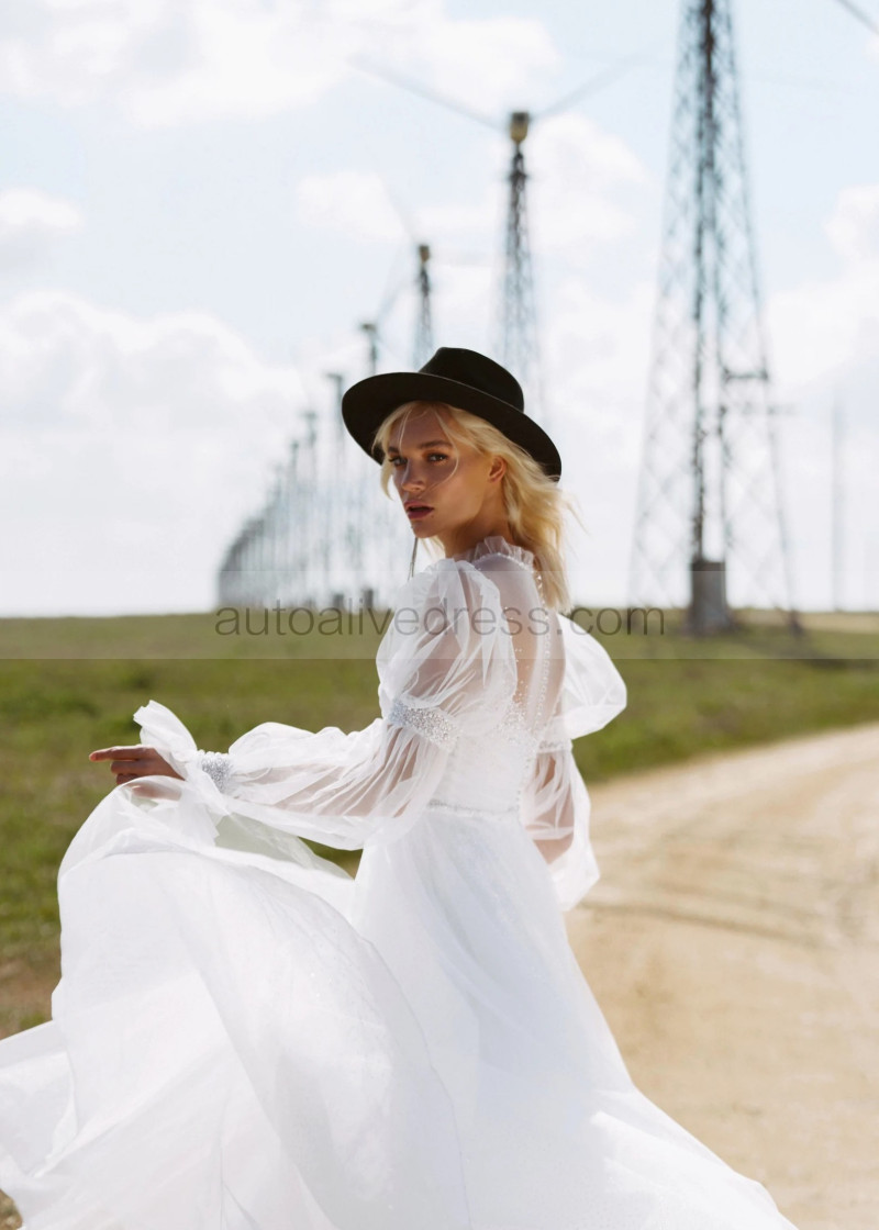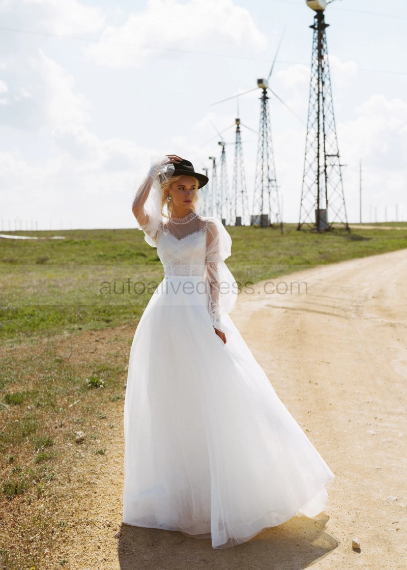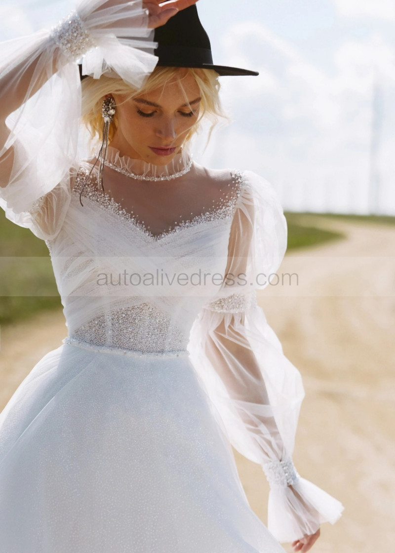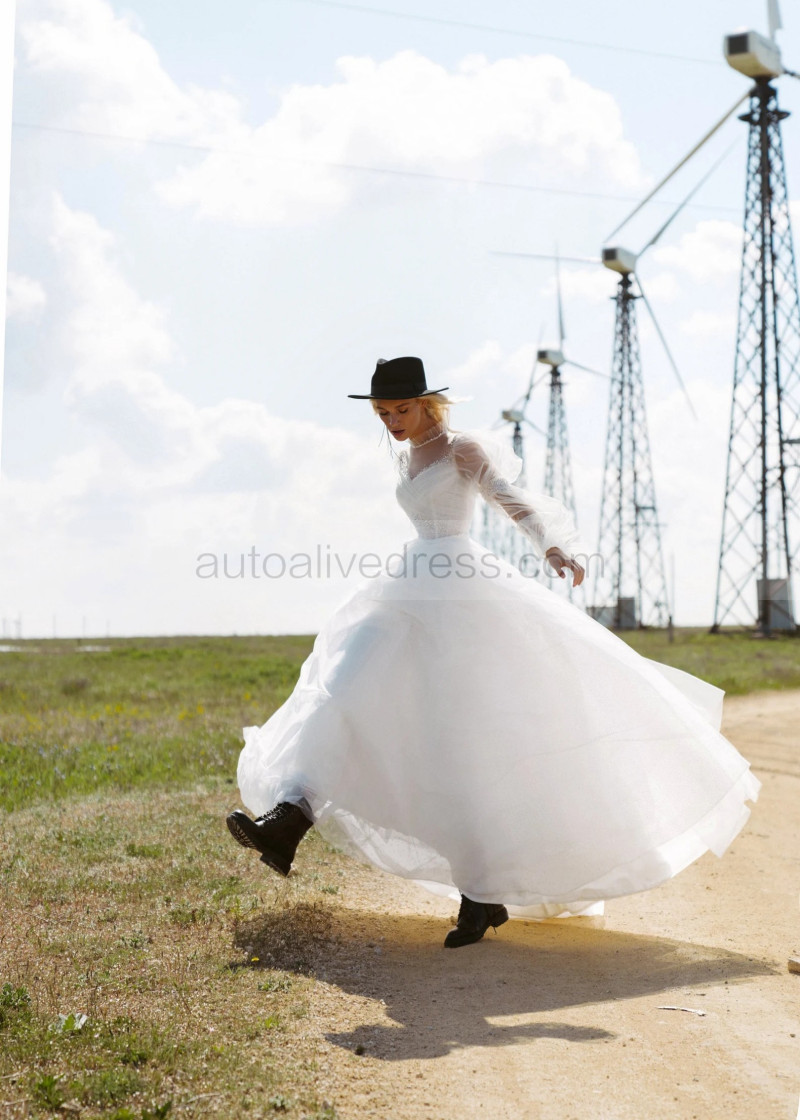 Long Sleeves Beaded White Tulle Bohemian Wedding Dress