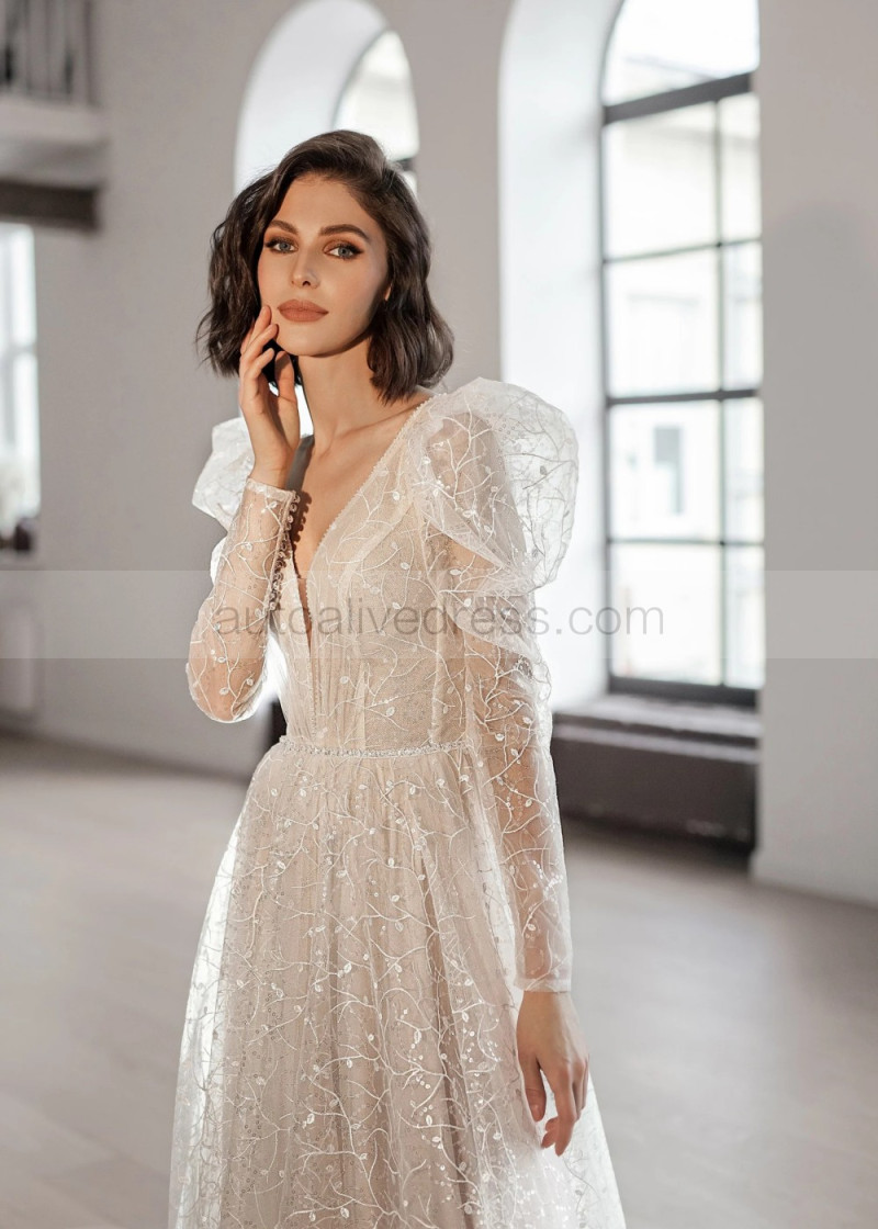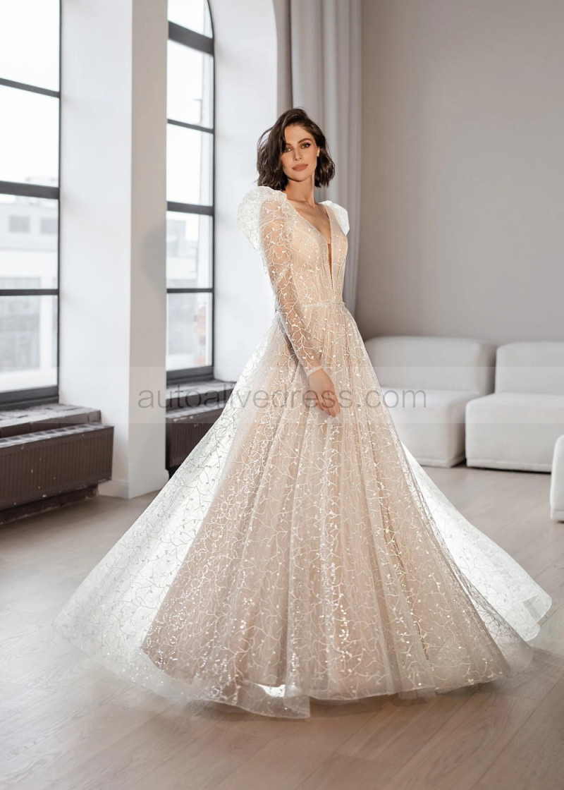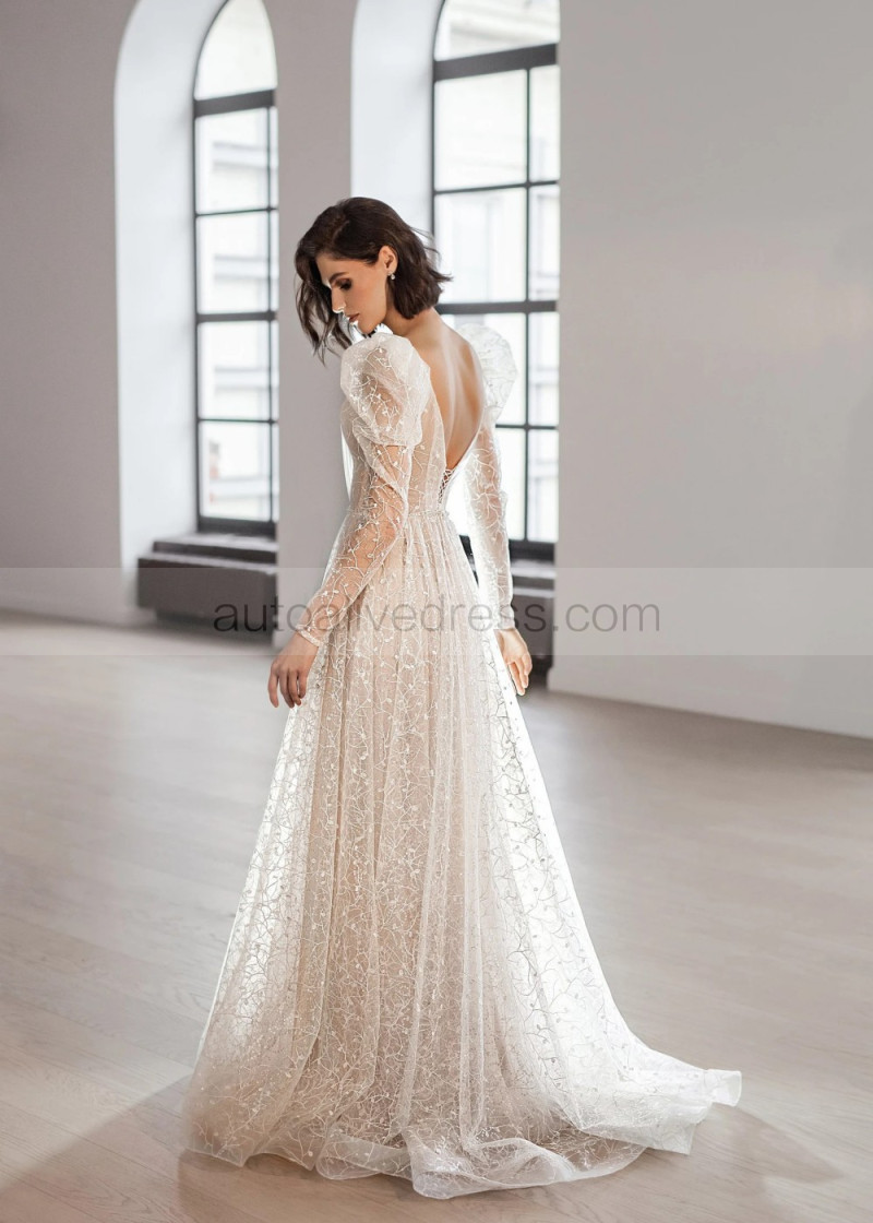 Long Sleeves Glitter Tulle Simple Beach Wedding Dress