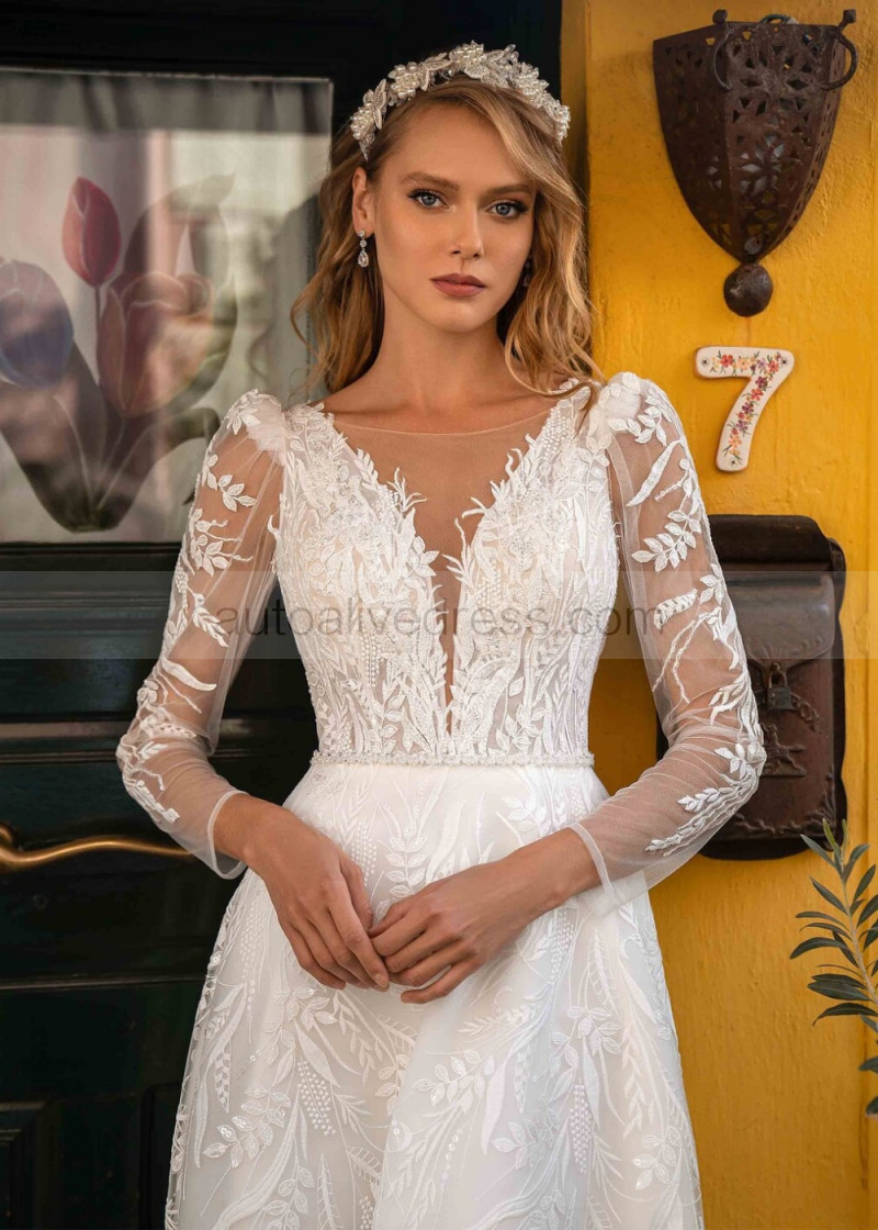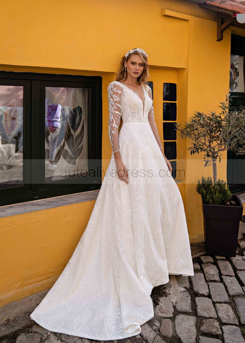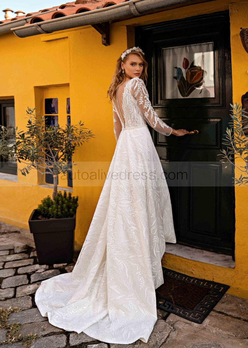 Long Sleeves Ivory Embroidery Lace Tulle Unique Wedding Dress