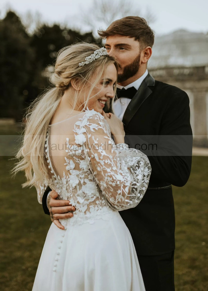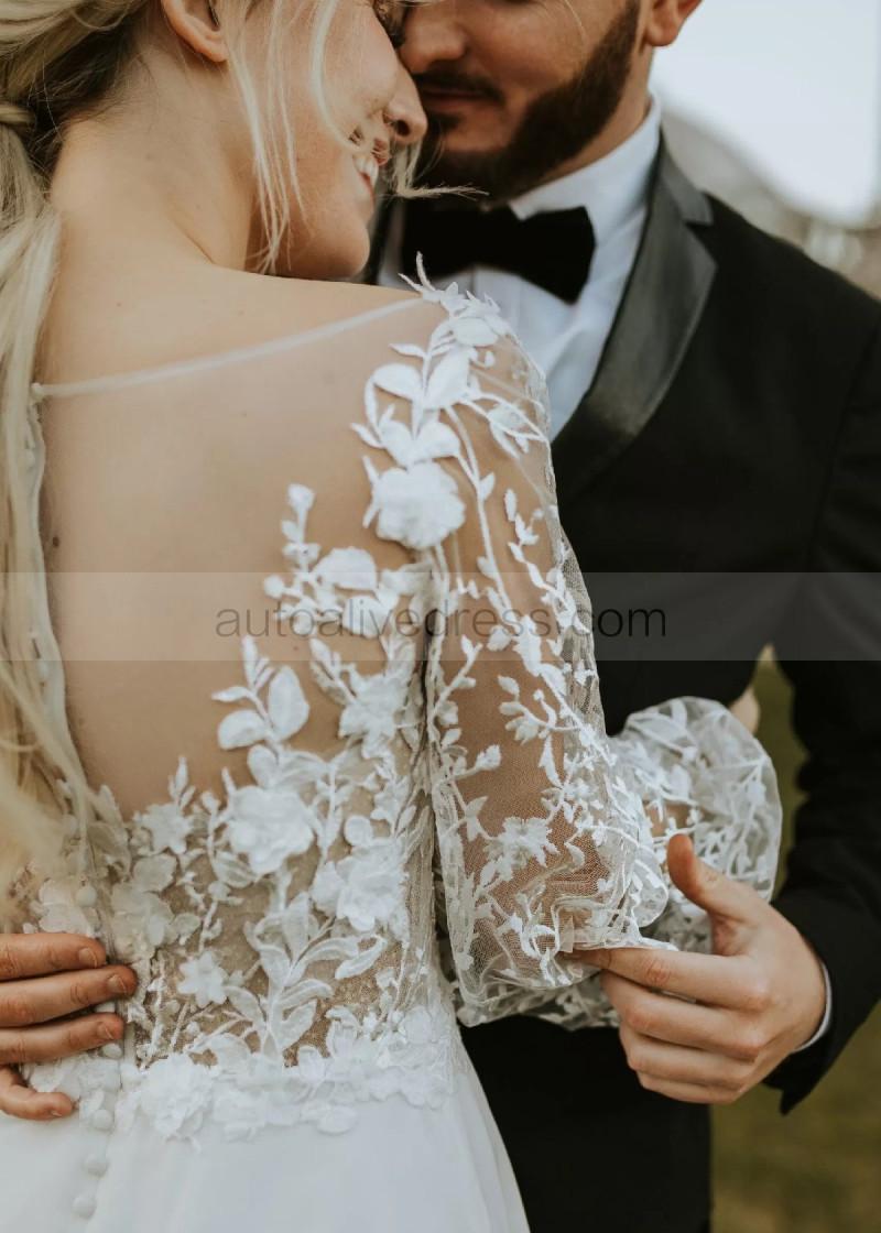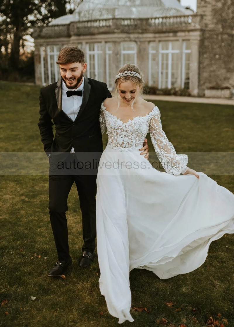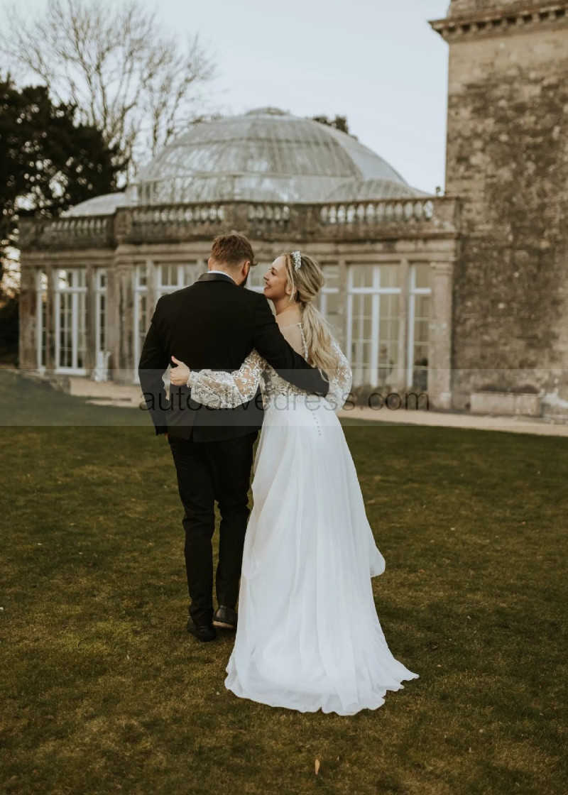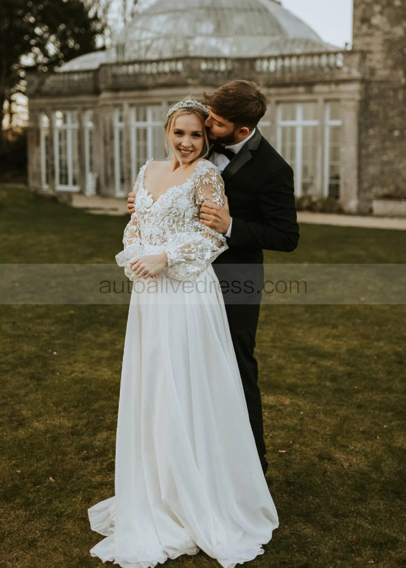 Long Sleeves Ivory Lace Chiffon Airy Wedding Dress