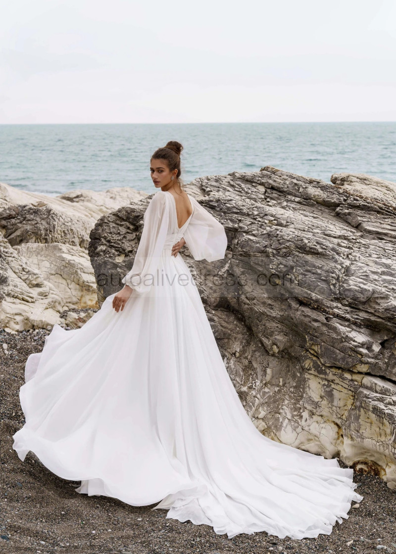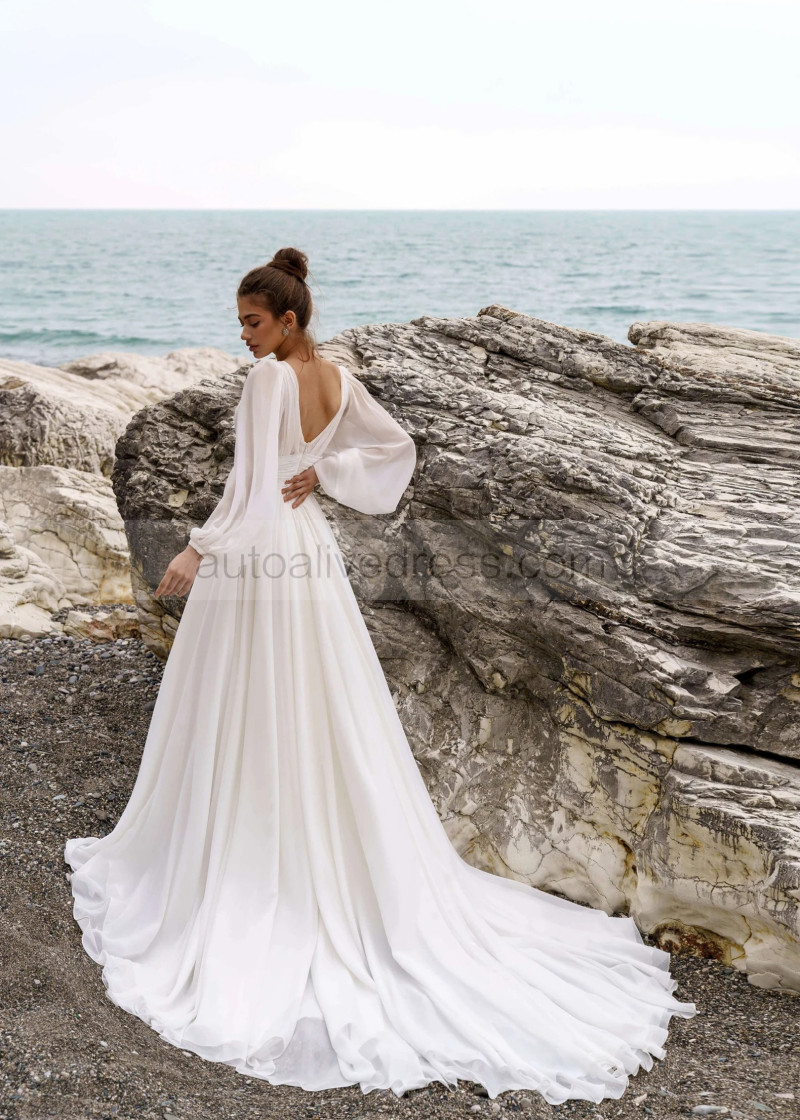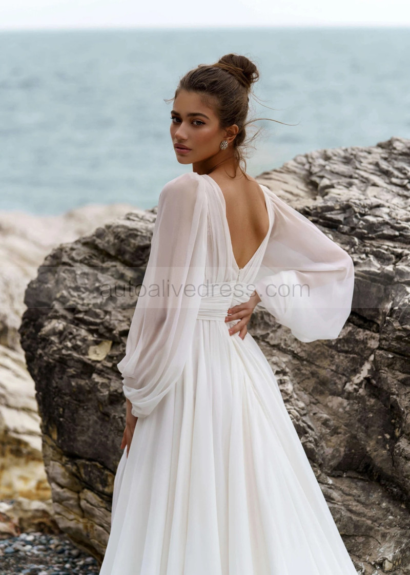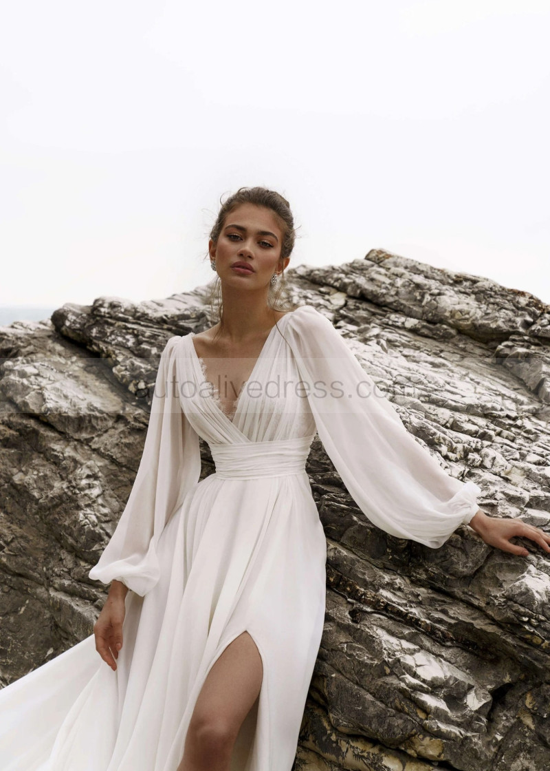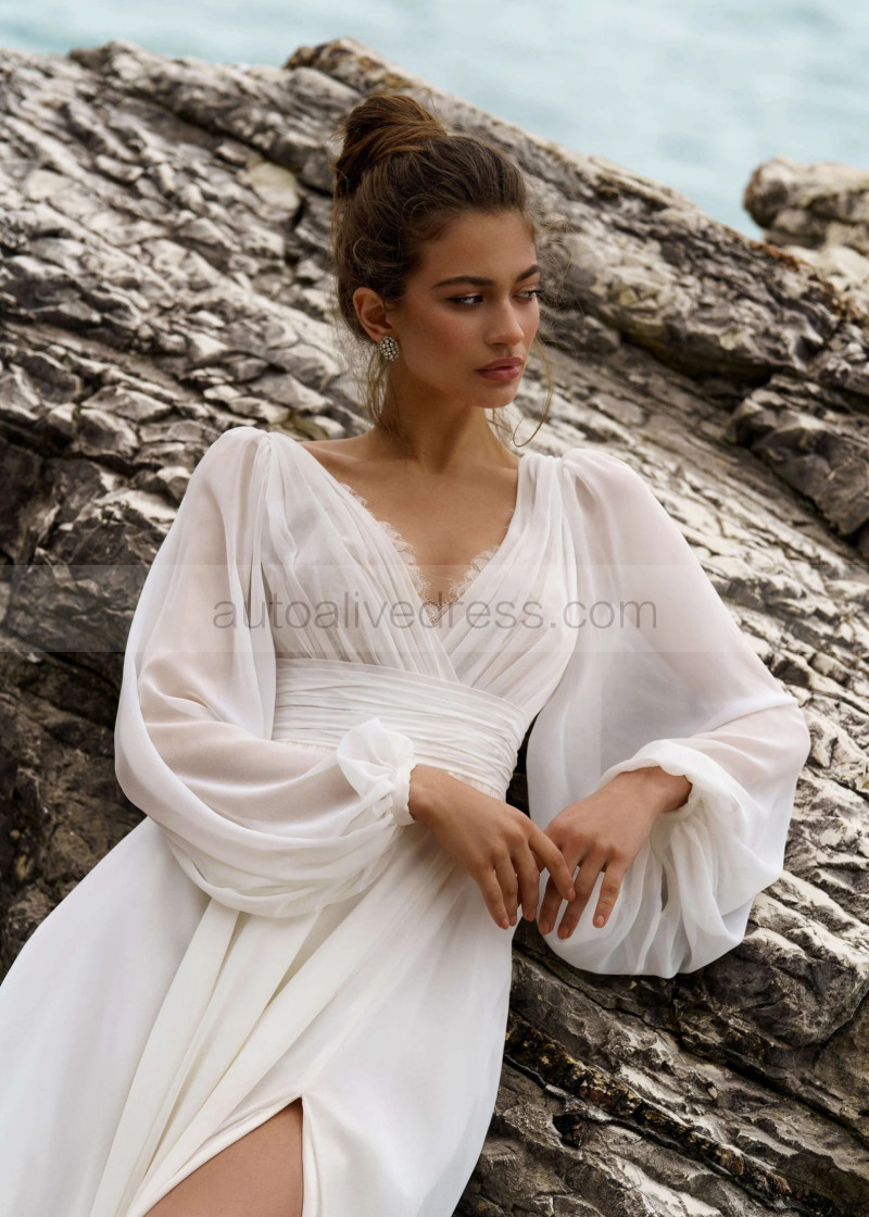 Long Sleeves Ivory Lace Chiffon Boho Beach Slit Wedding Dress