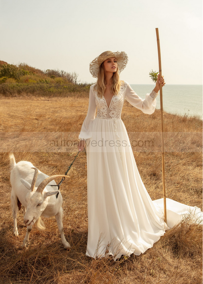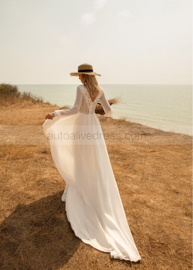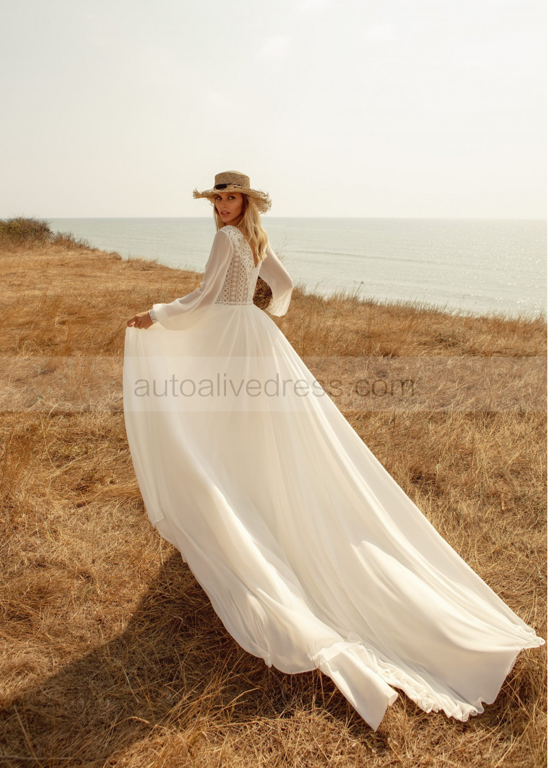 Long Sleeves Ivory Lace Chiffon Boho Wedding Dress