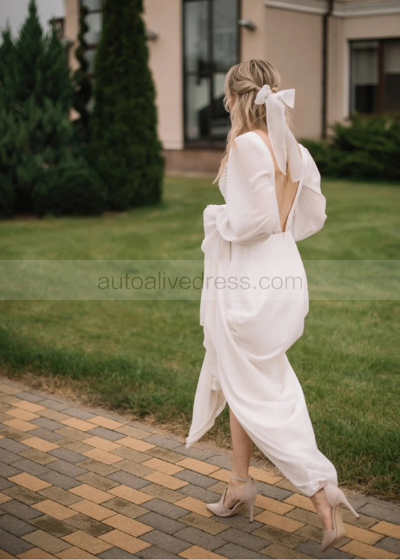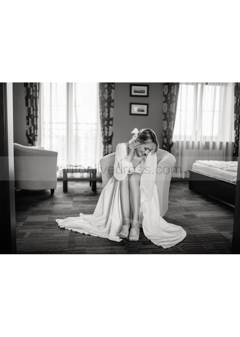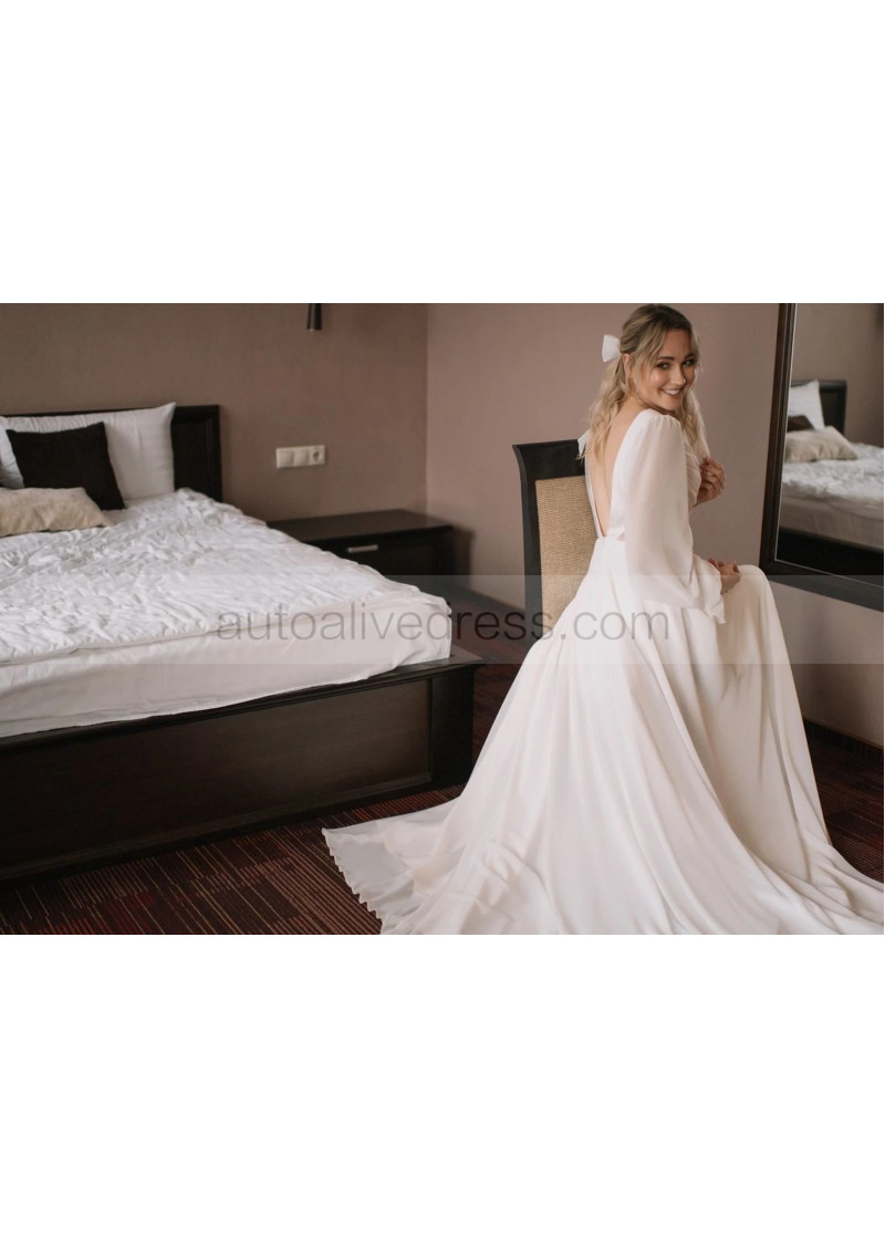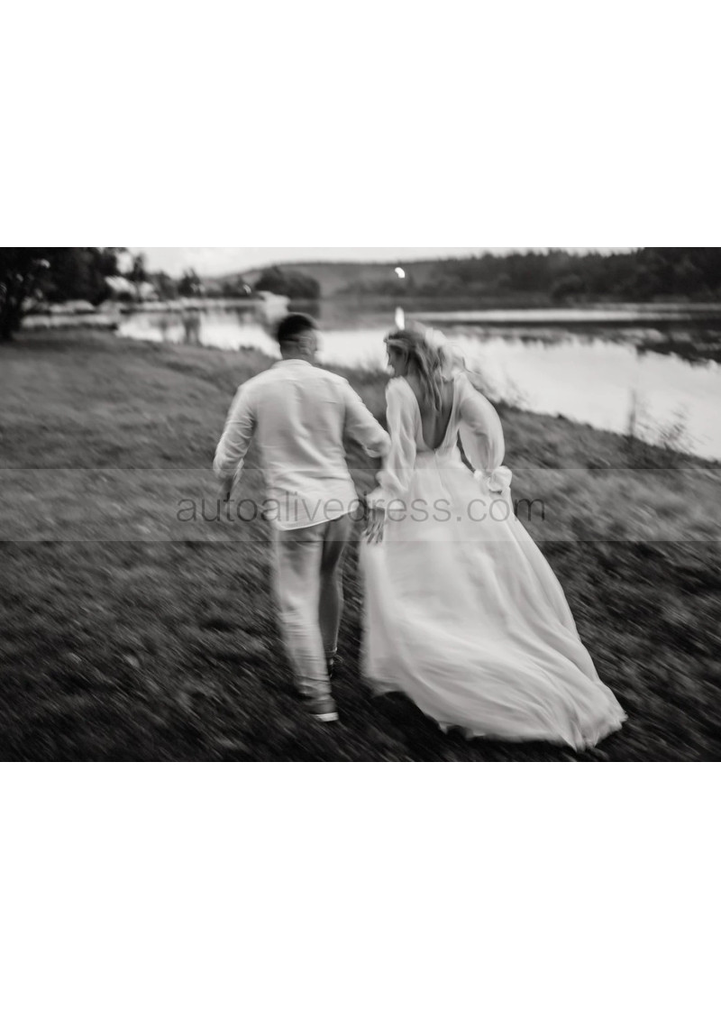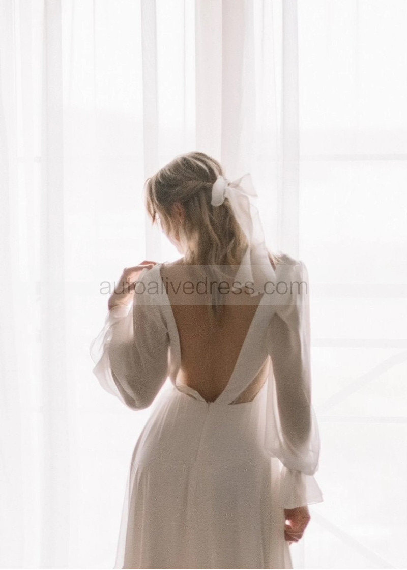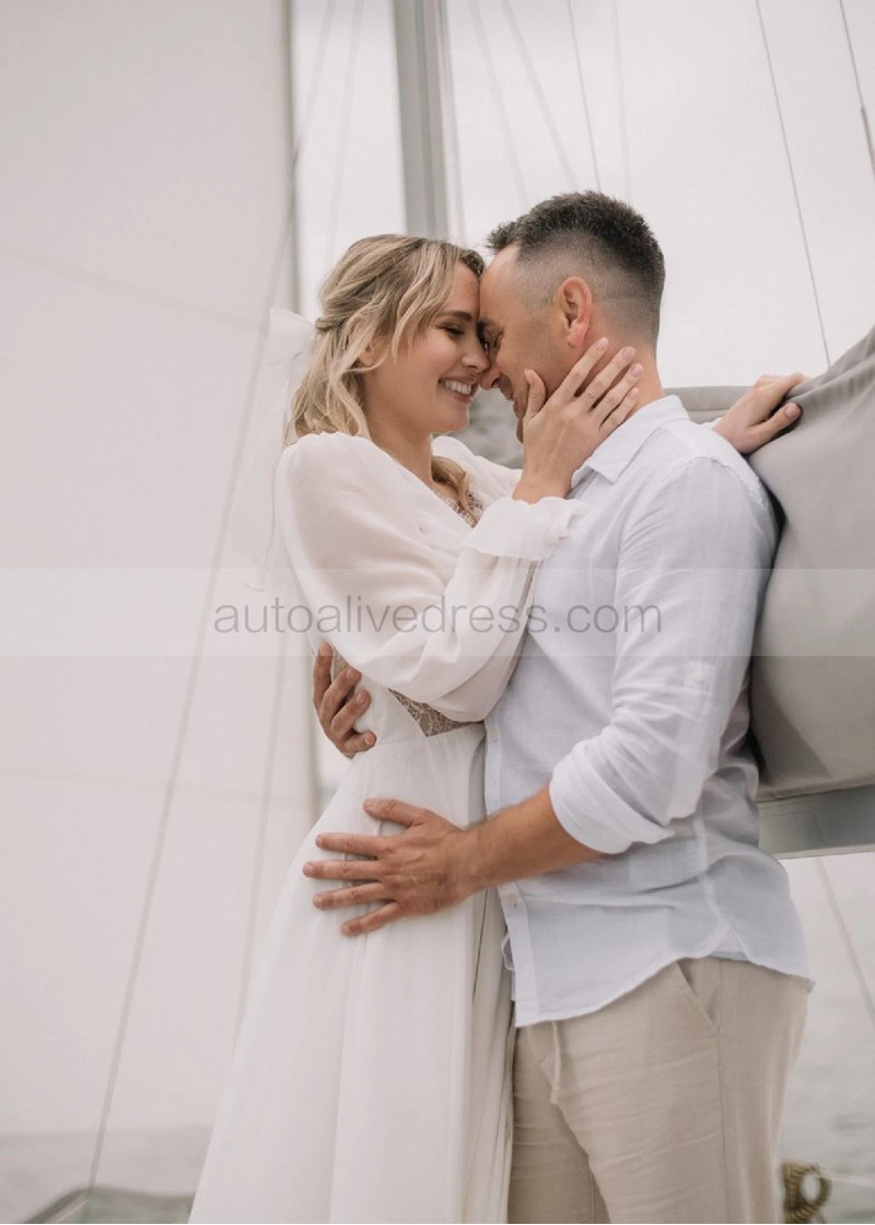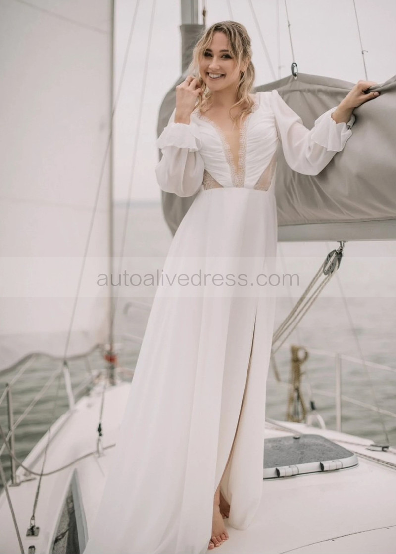 Long Sleeves Ivory Lace Chiffon Slit Wedding Dress
