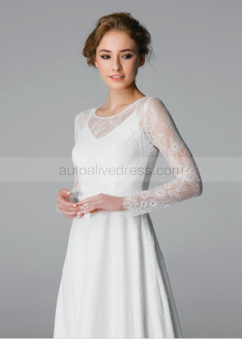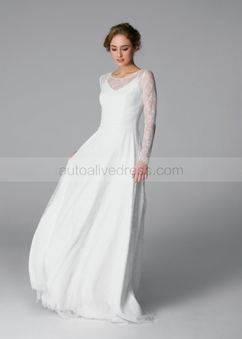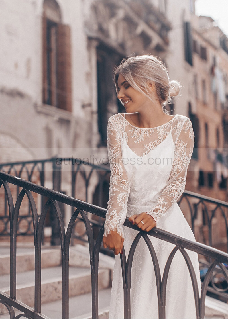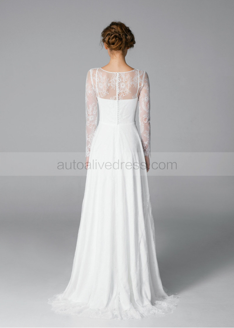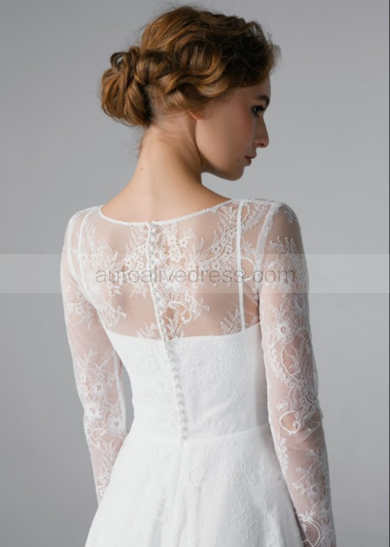 Long Sleeves Ivory Lace Pearl Buttons Back Wedding Dress