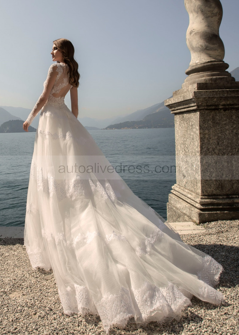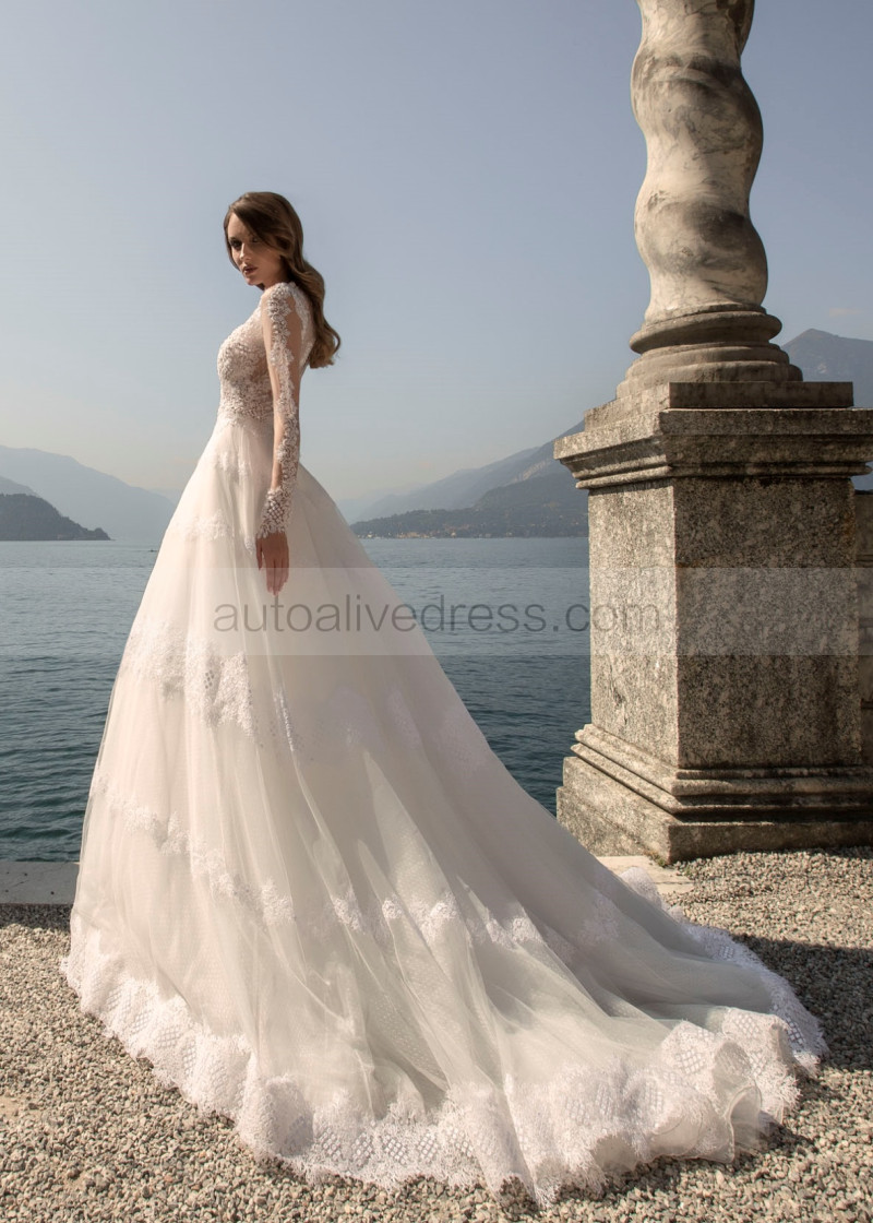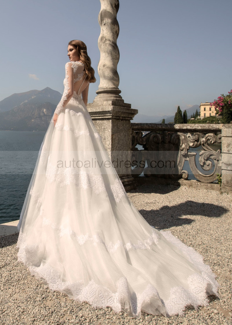 Long Sleeves Ivory Lace Polka Dots Tulle Sweet Wedding Dress