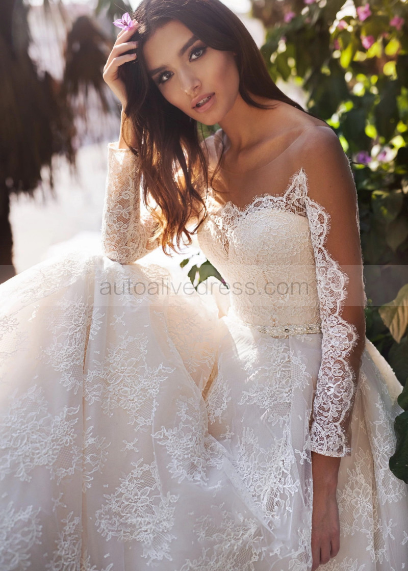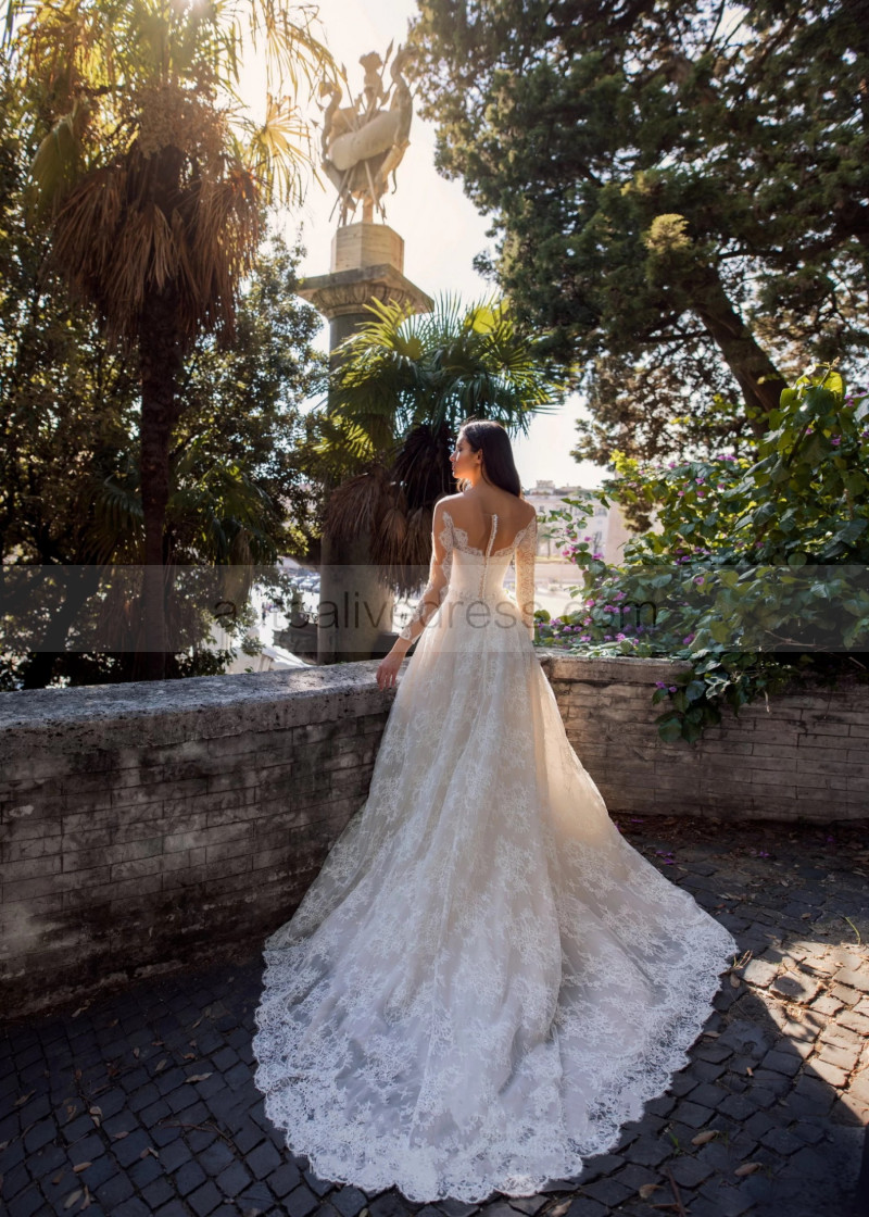Long Sleeves Ivory Lace Tulle Buttons Back Fabulous Wedding Dress