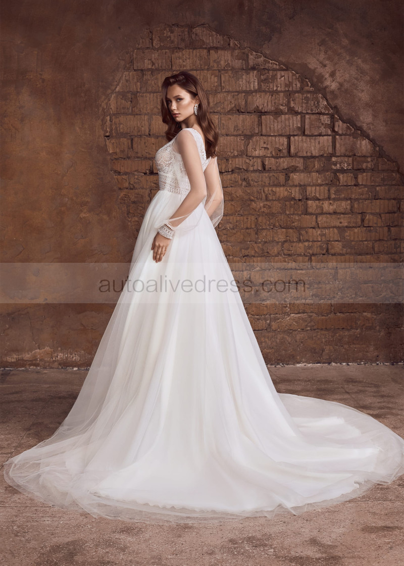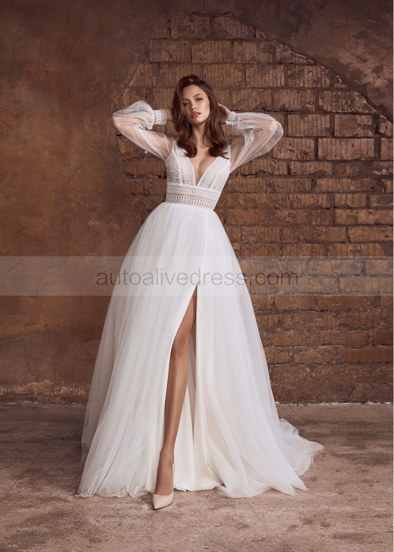 Long Sleeves Ivory Lace Tulle Slit Boho Wedding Dress