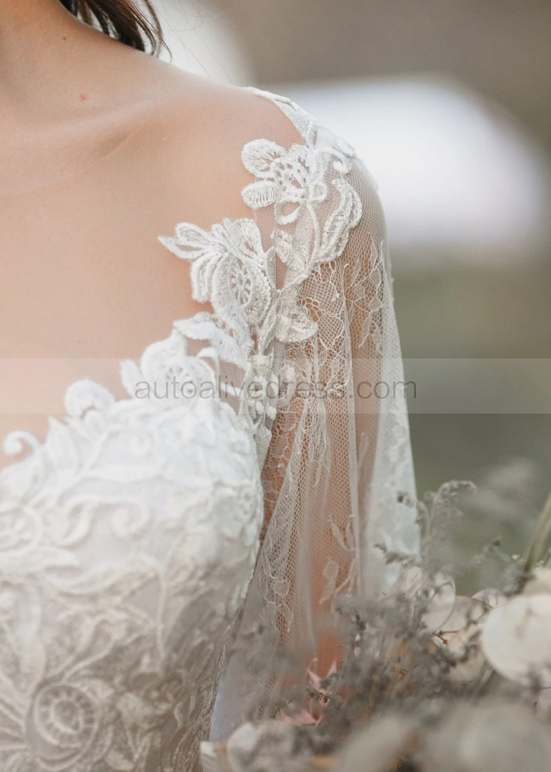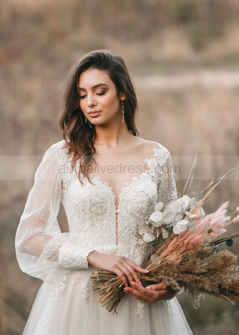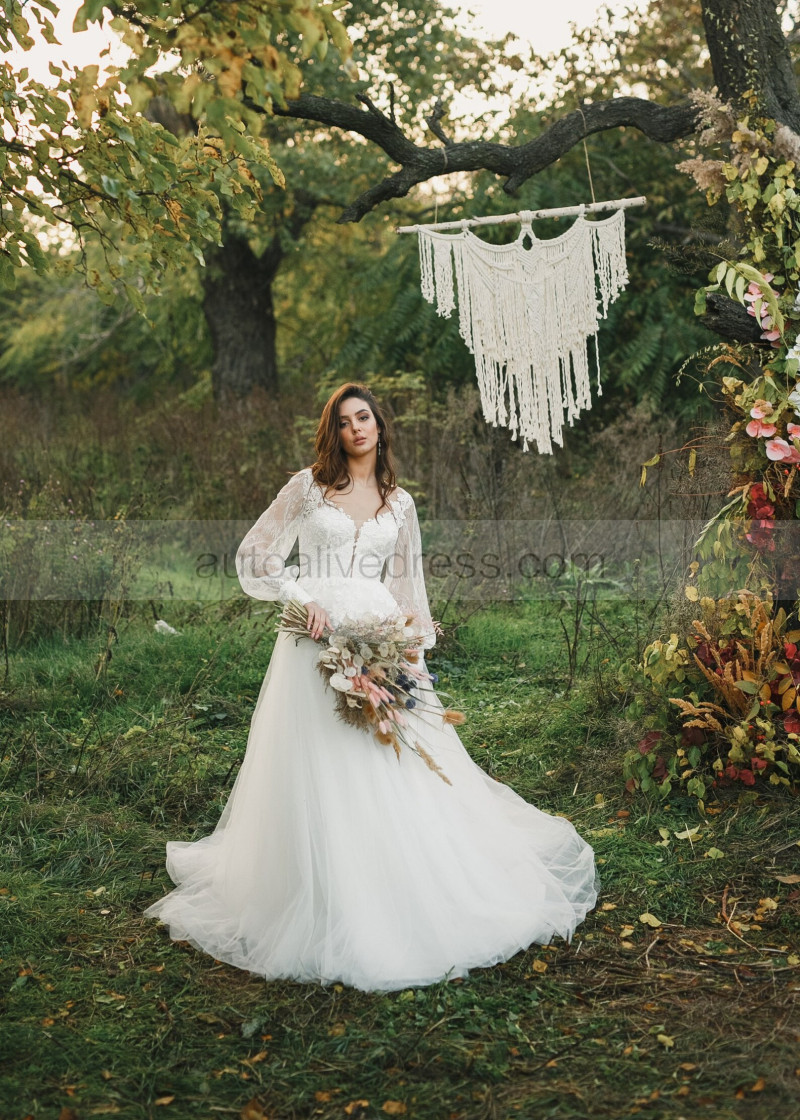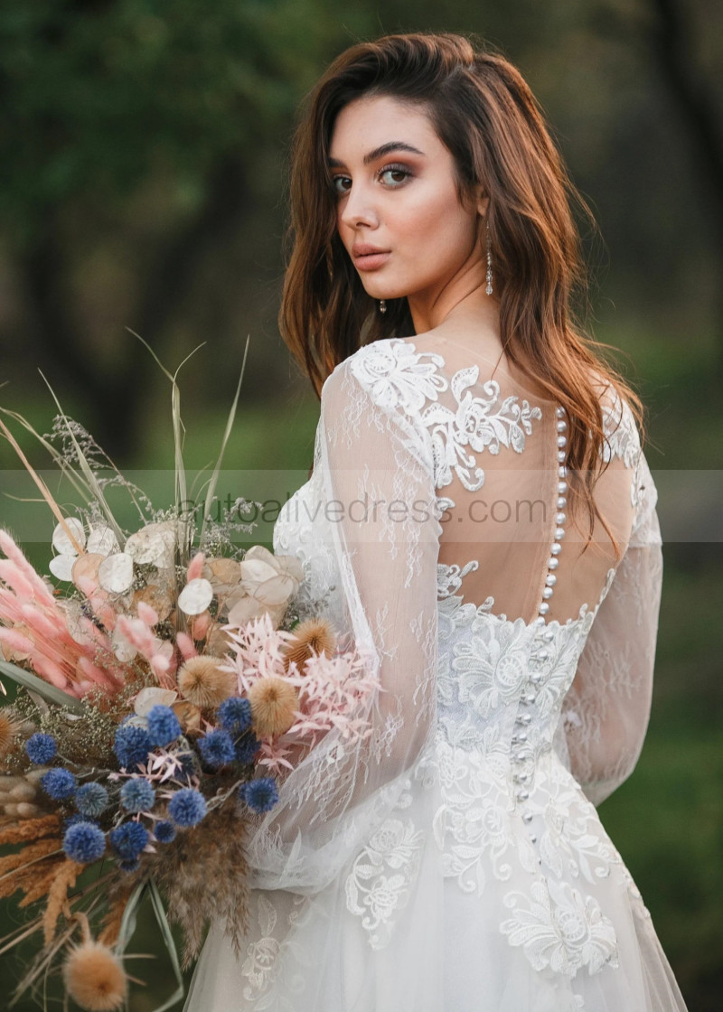 Long Sleeves Ivory Lace Tulle Sweet Wedding Dress