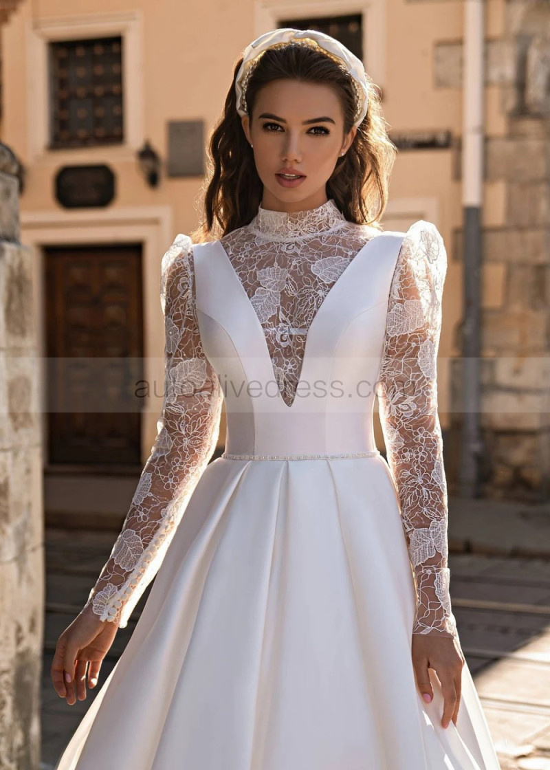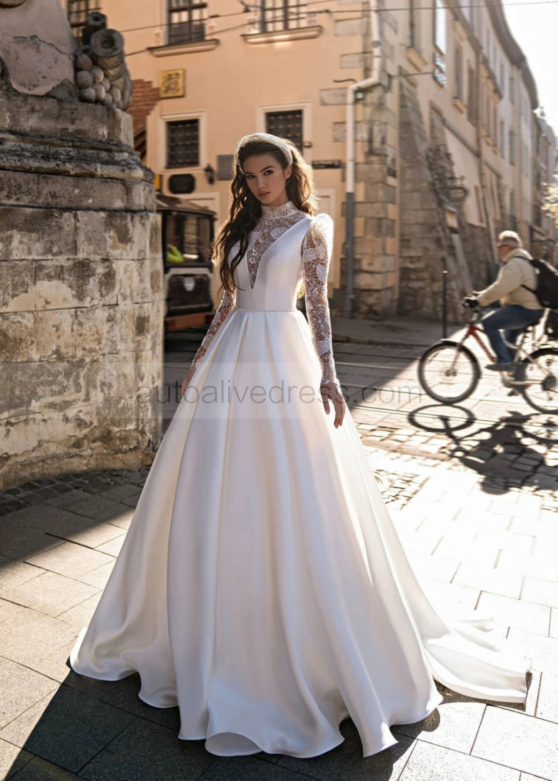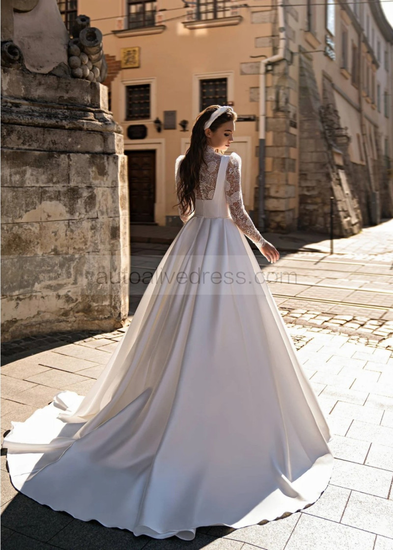 Long Sleeves Ivory Satin Lace Classic Wedding Dress
