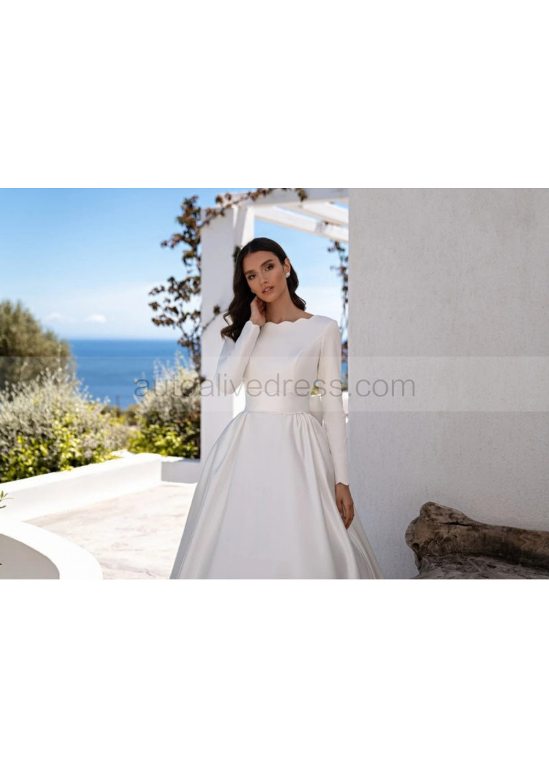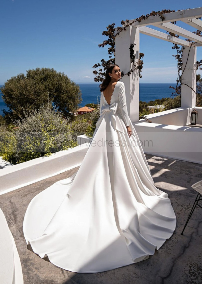 Long Sleeves Ivory Satin Open Back Minimalist Wedding Dress