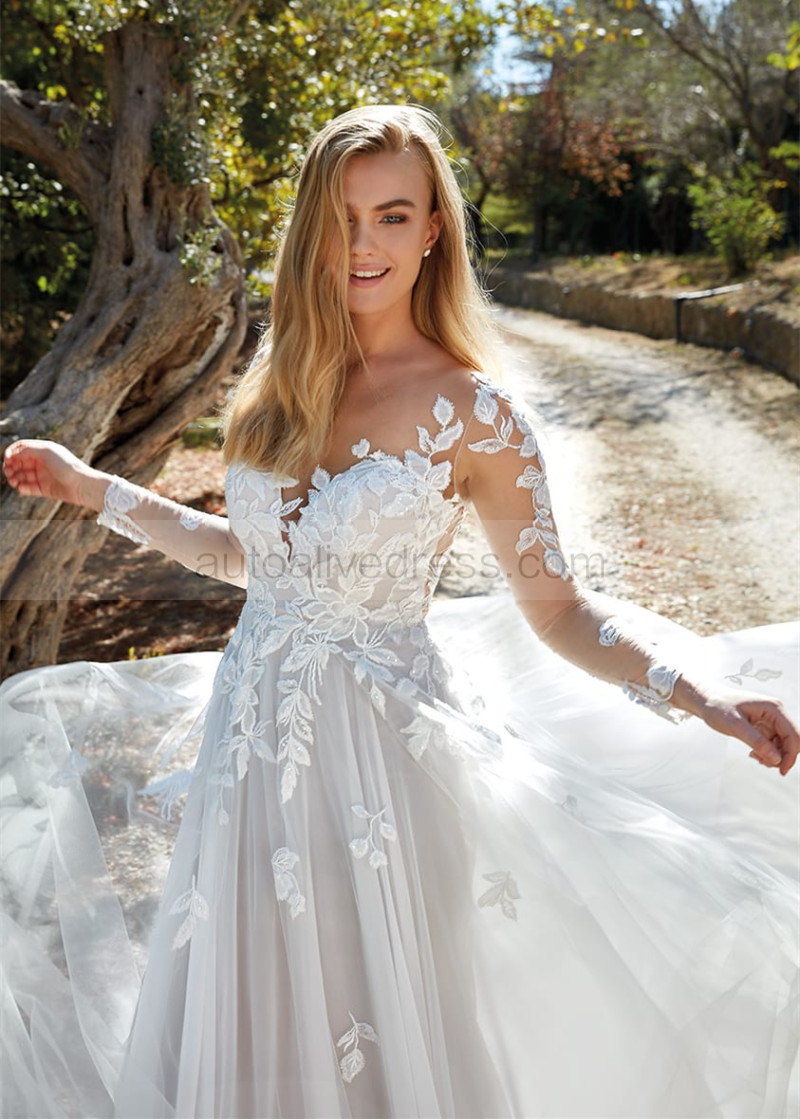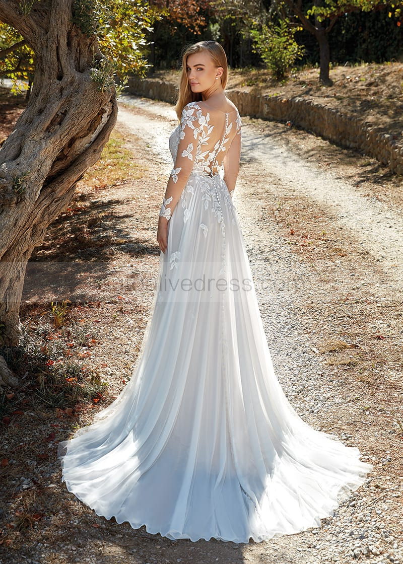 Long Sleeves Ivory Sequined Lace Chiffon Romantic Wedding Dress