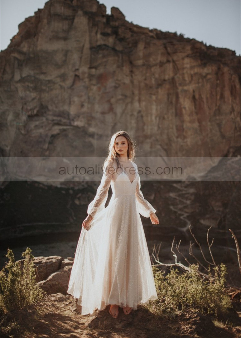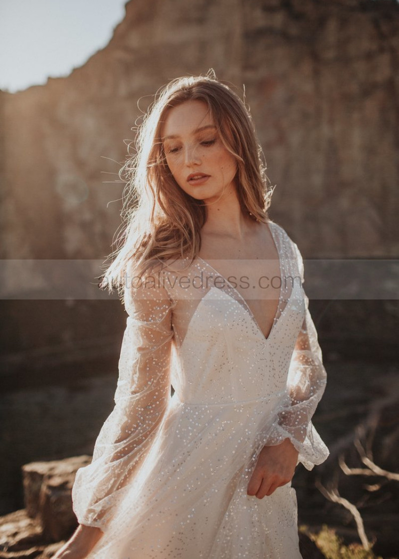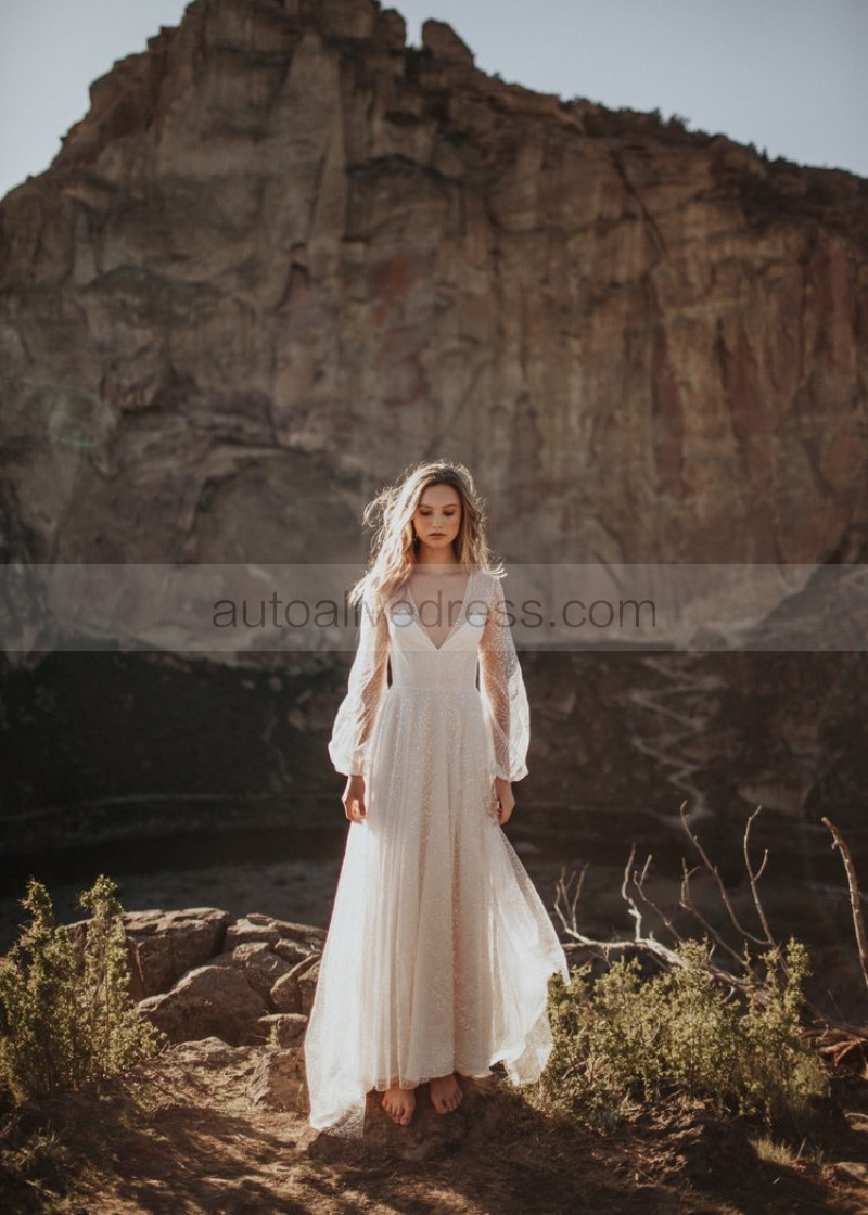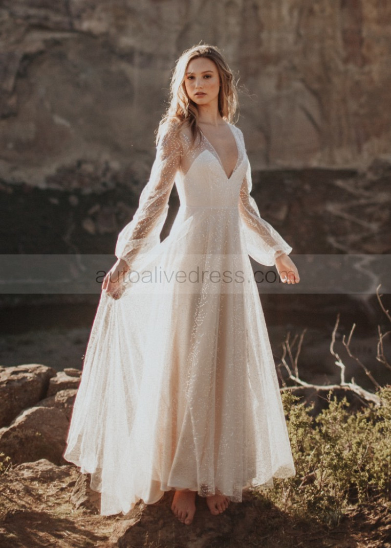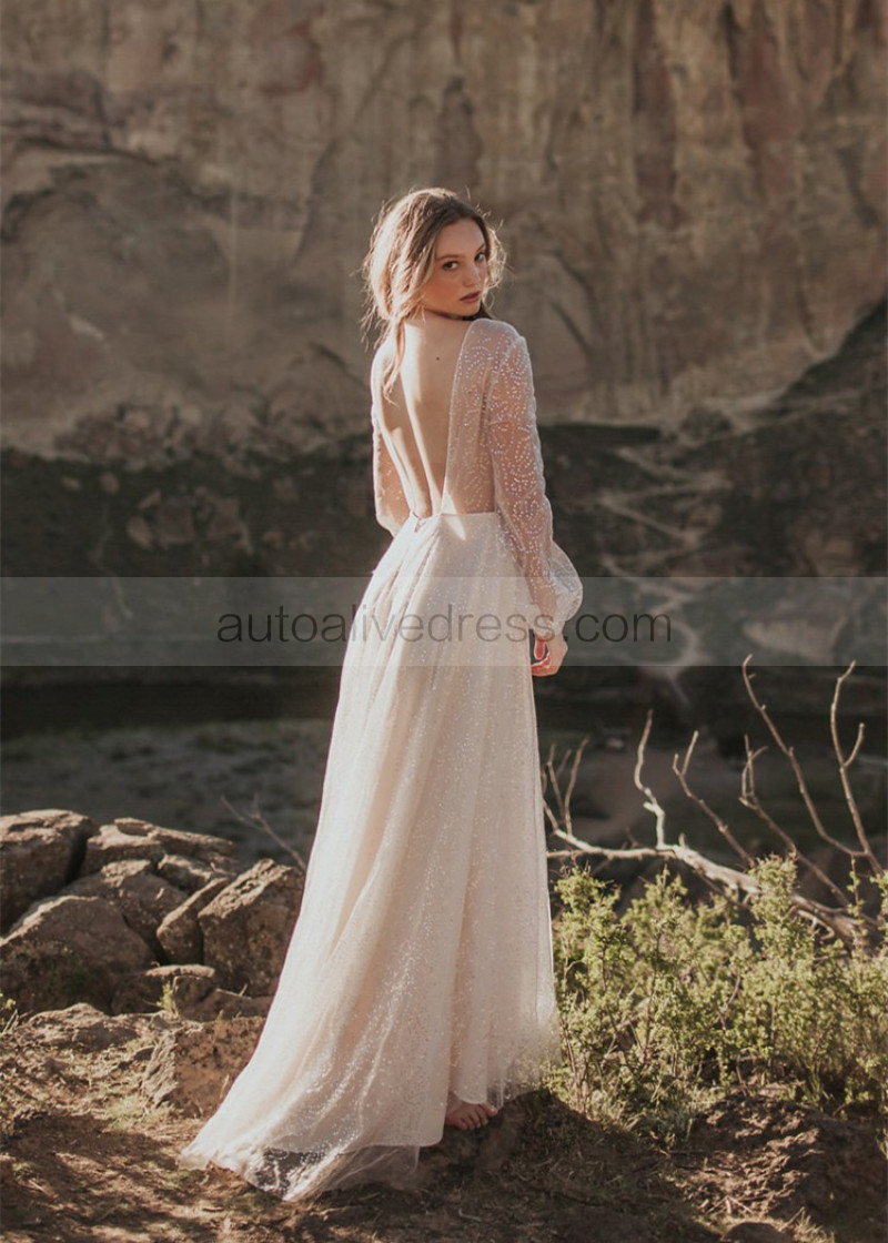 Long Sleeves Ivory Sparkle Tulle Backless Wedding Dress