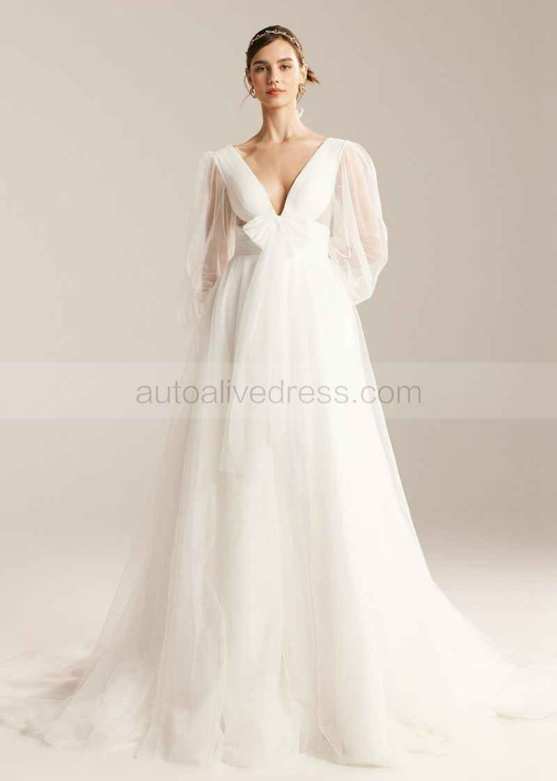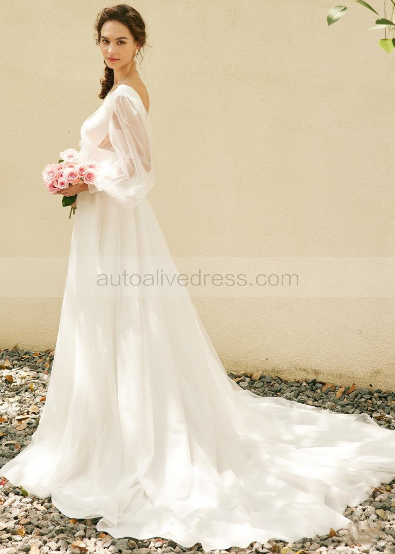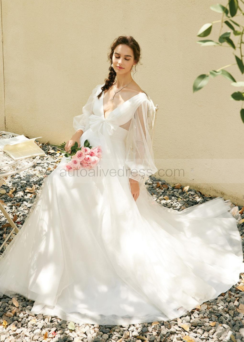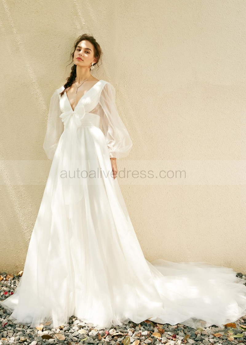 Long Sleeves Ivory Tulle V Back Charming Wedding Dress