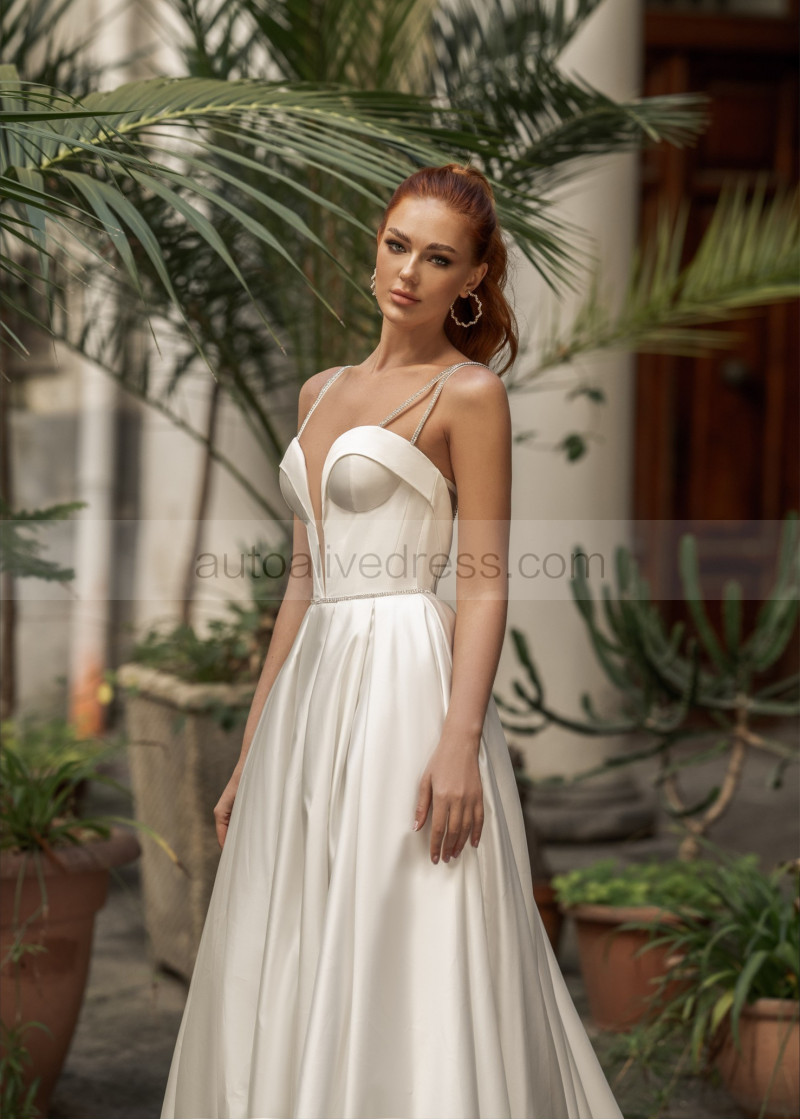 Modern Ivory Satin Beaded Straps Wedding Dress With Buttons