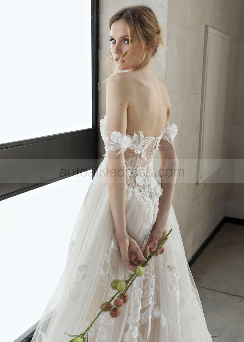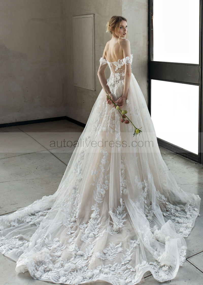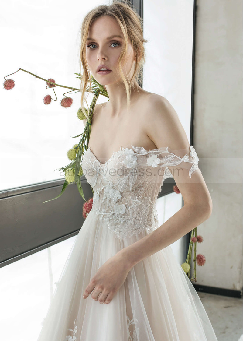 Off Shoulder Beaded Blush Lace Tulle Wedding Dress