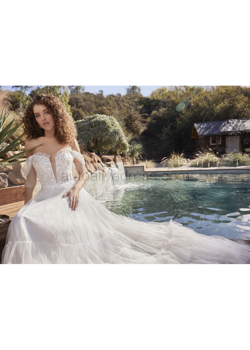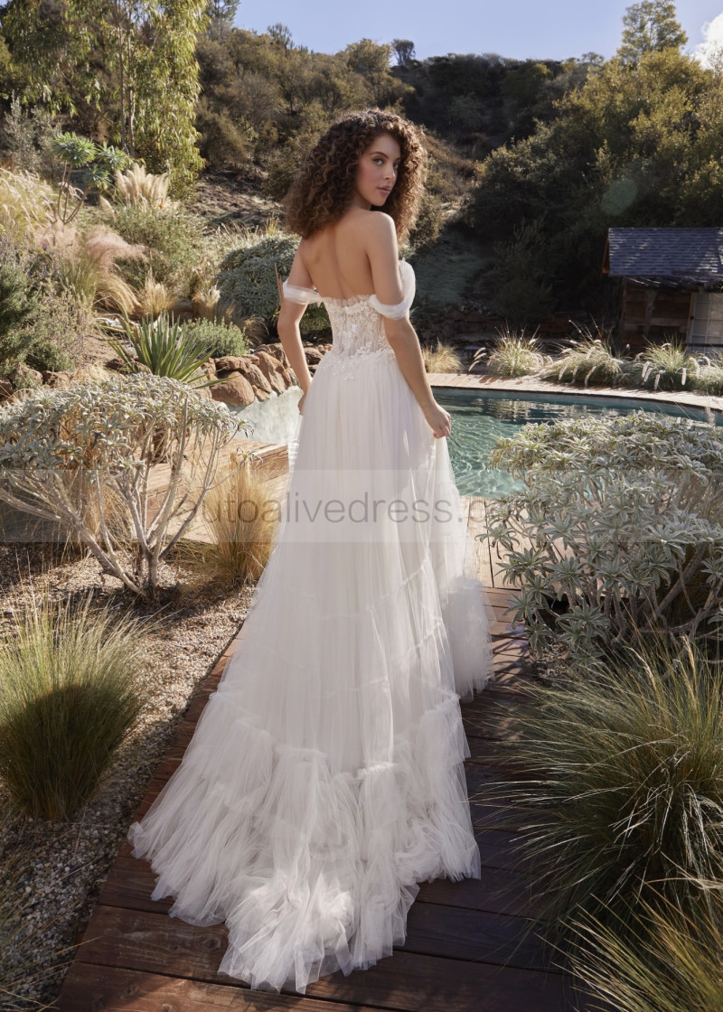 Off Shoulder Beaded Ivory Lace Gathered Tulle Wedding Dress