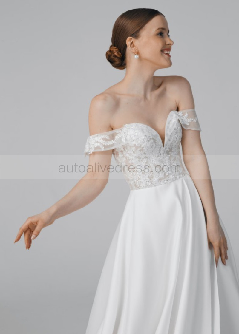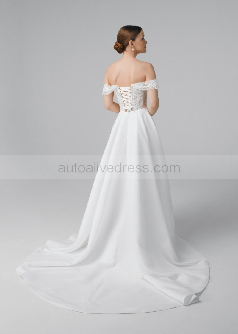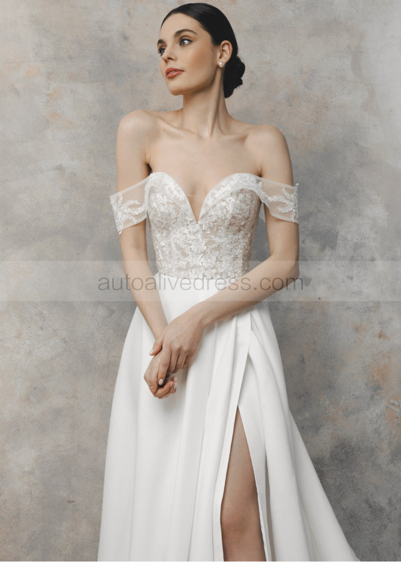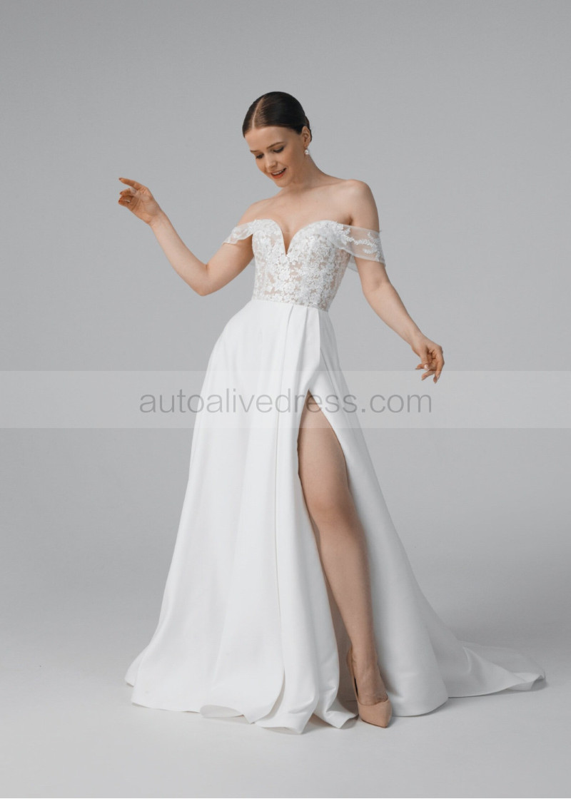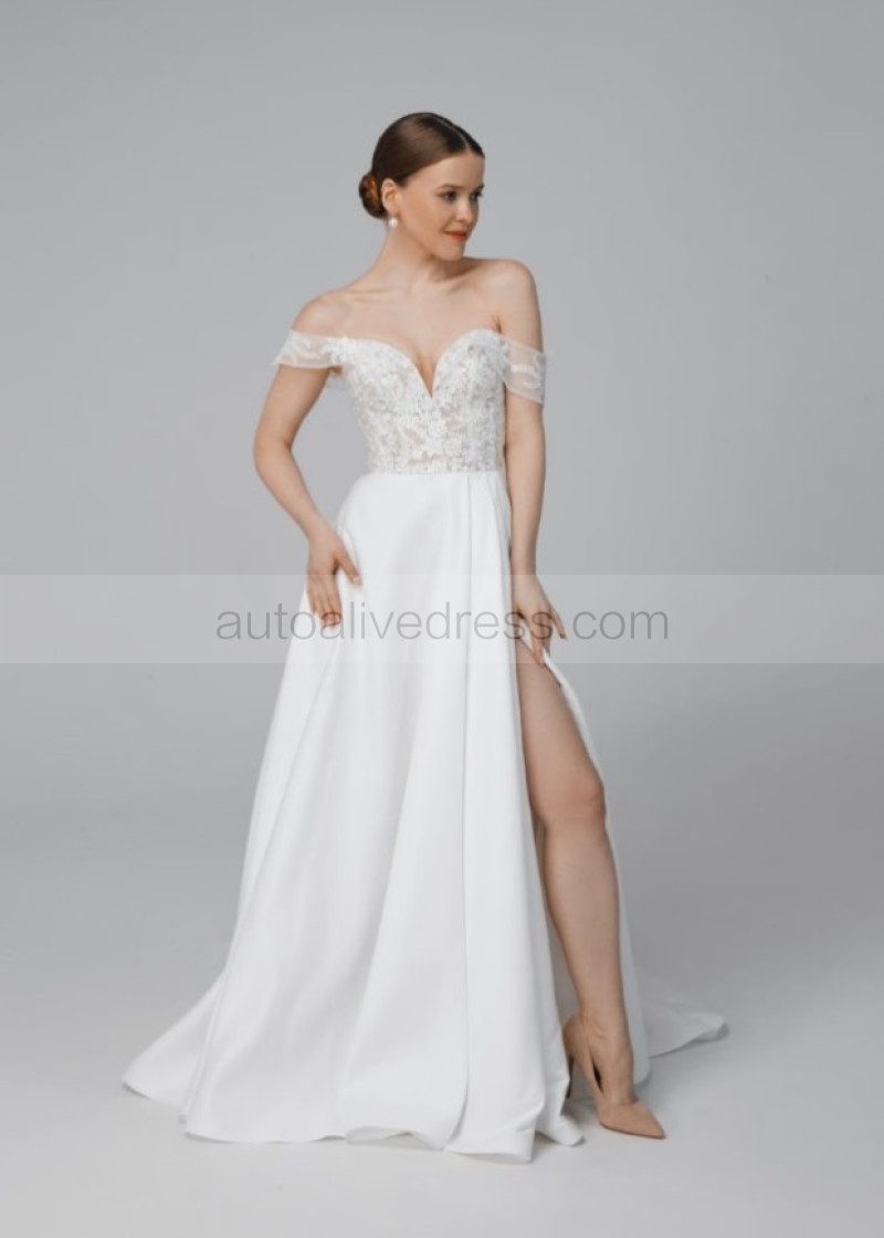 Off Shoulder Beaded Ivory Lace Satin Slit Wedding Dress