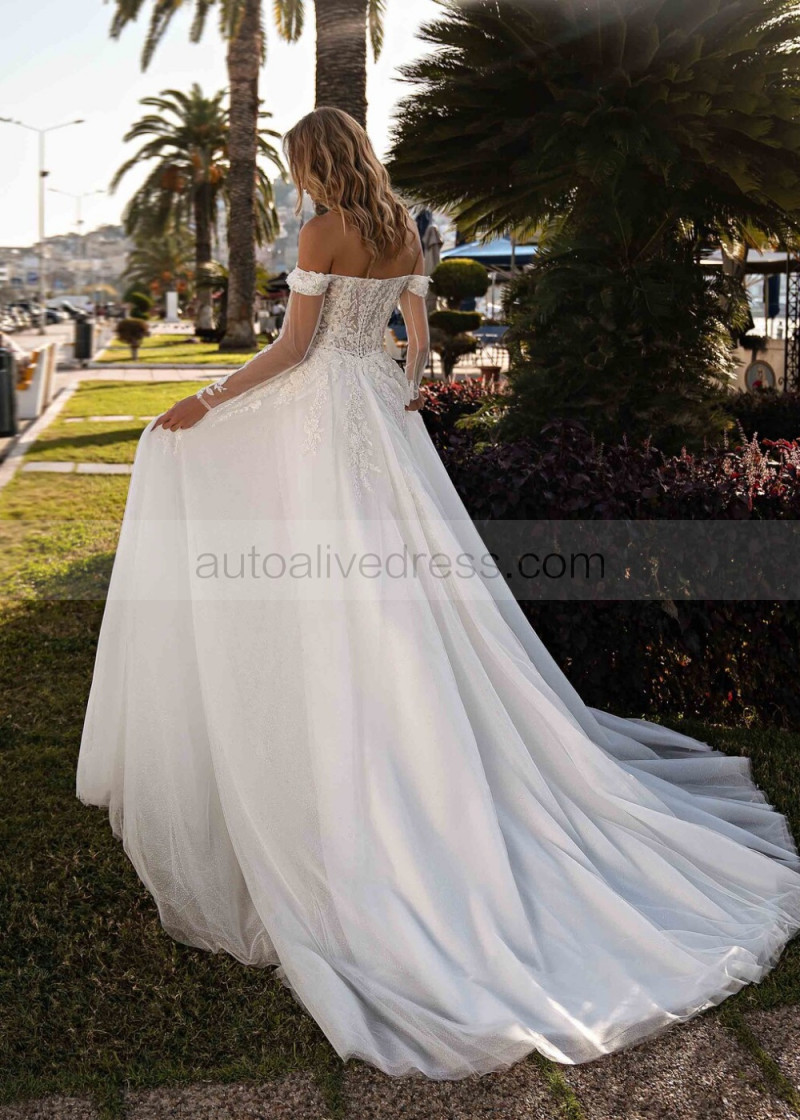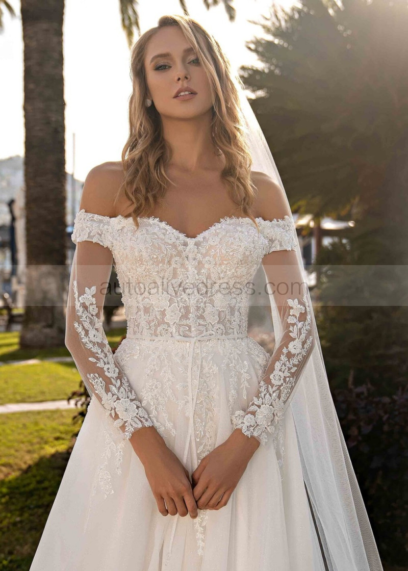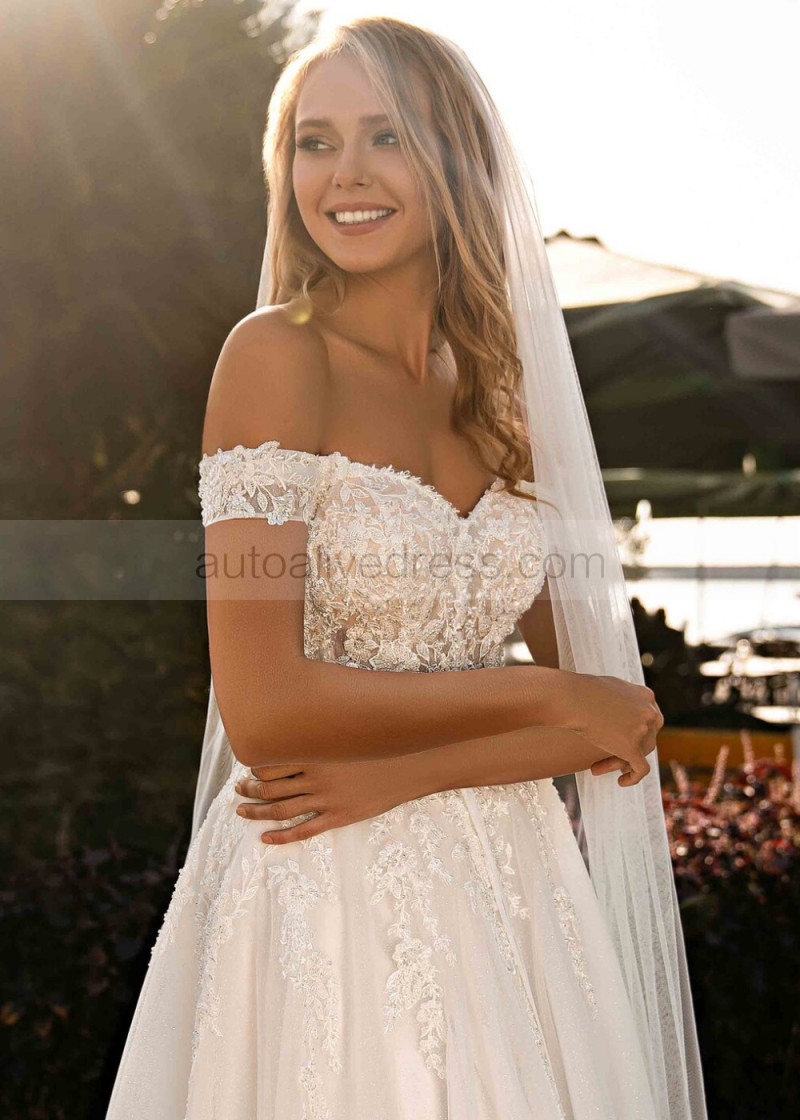 Off Shoulder Beaded Ivory Lace Tulle Fairytale Wedding Dress