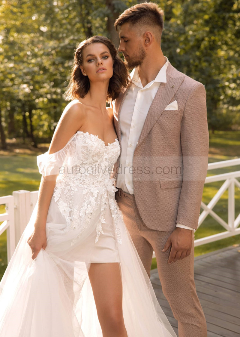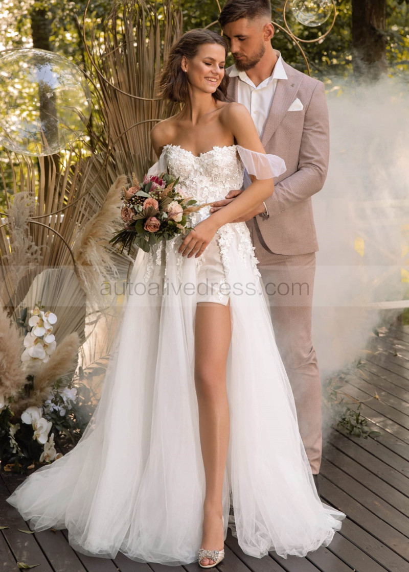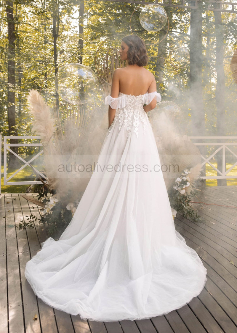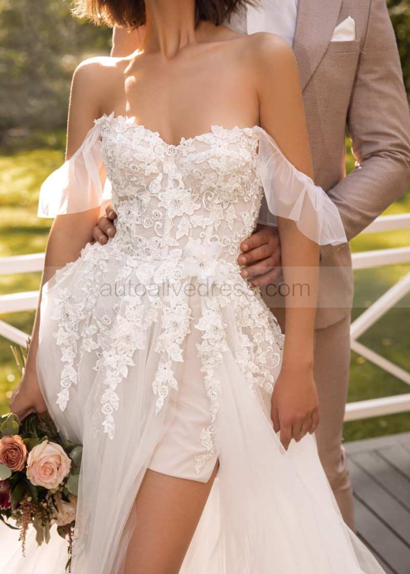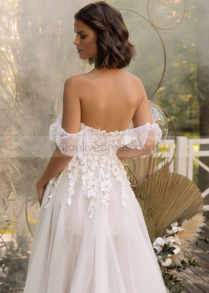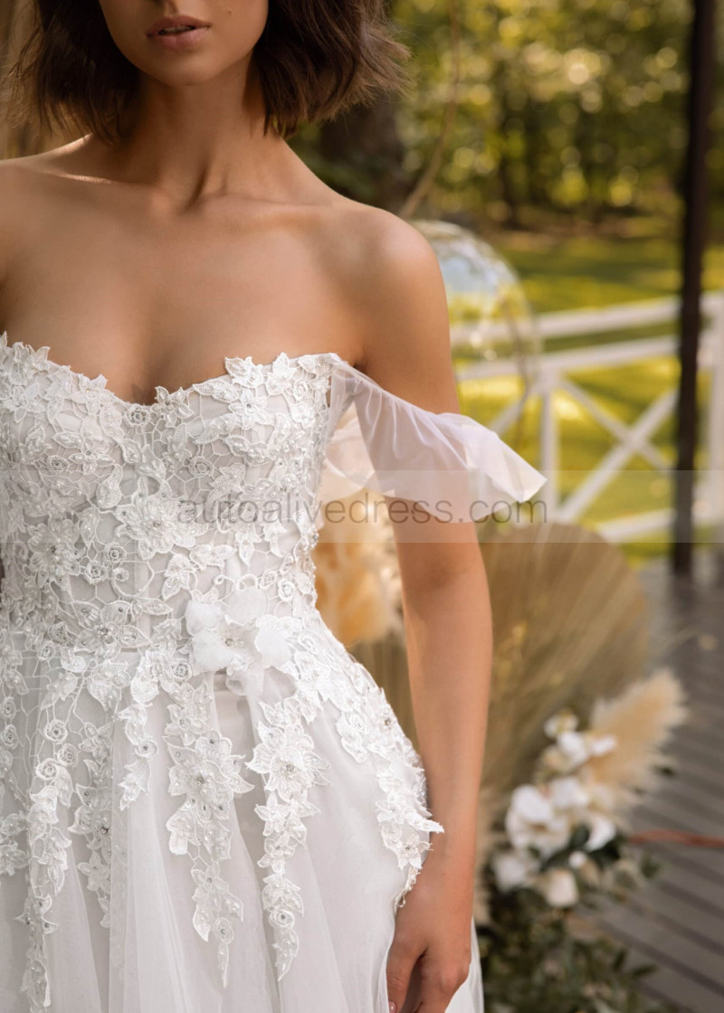 Off Shoulder Beaded Ivory Lace Tulle Floral Wedding Dress