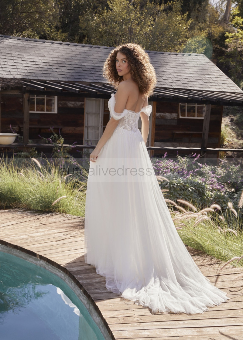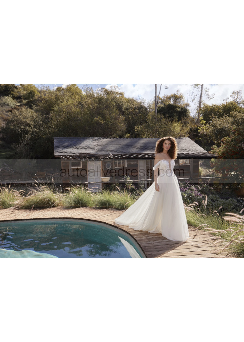 Off Shoulder Beaded Ivory Lace Tulle Flowing Wedding Dress